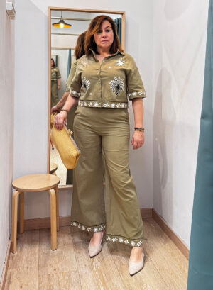 22,99€ IVA incluído Seleccionar opciones Este producto tiene múltiples variantes. Las opciones se pueden elegir en la página de productoEl PANTALÓN CALPE es la elección perfecta para un look cómodo y estilizado. Estos pantalones de pata ancha, en un sofisticado color caqui, presentan detallados bordados en blanco en la cintura y el bajo, añadiendo un toque distintivo y fresco a tu vestuario.