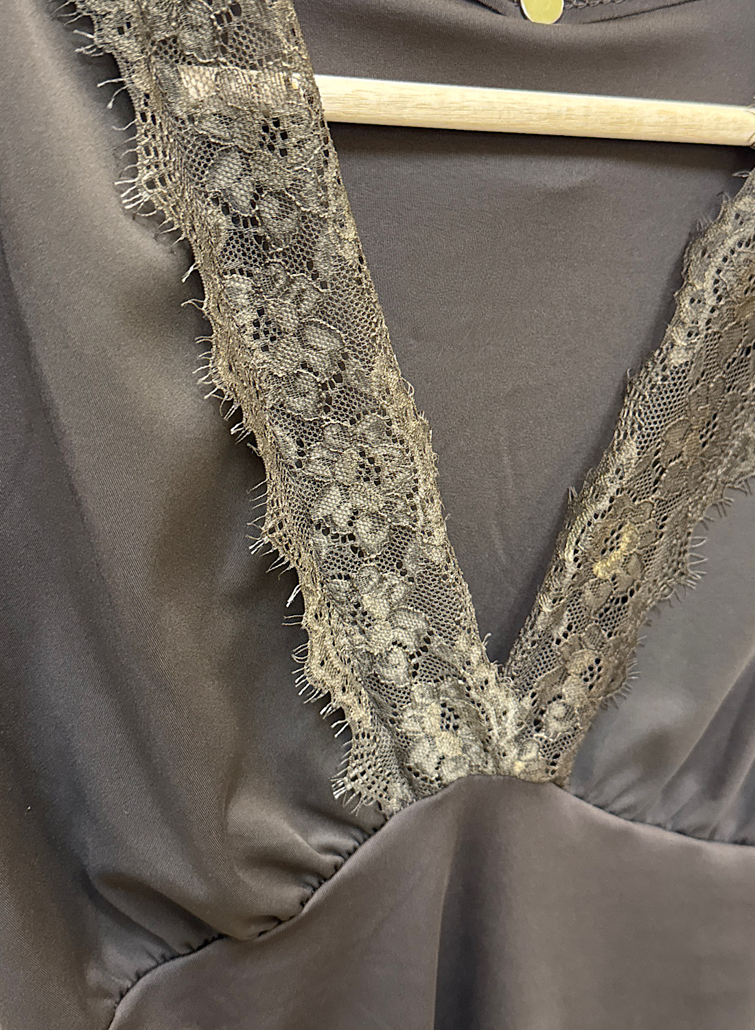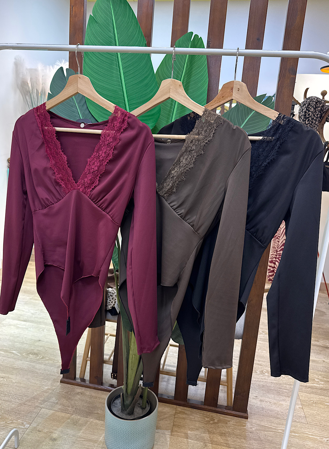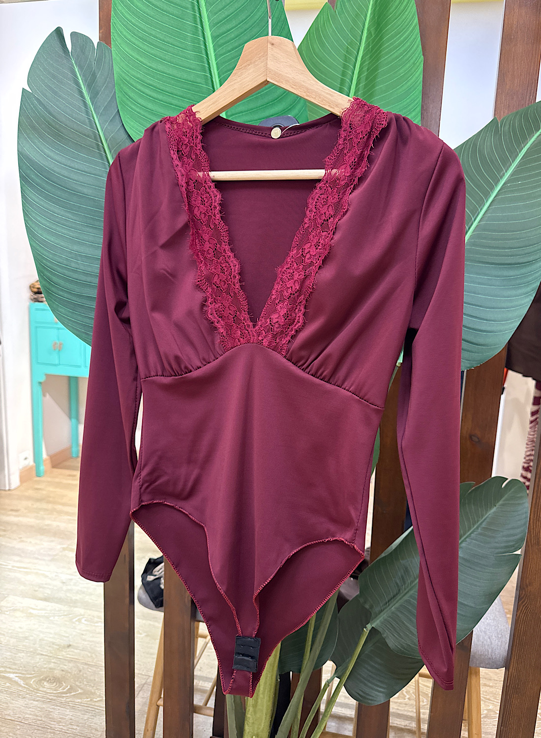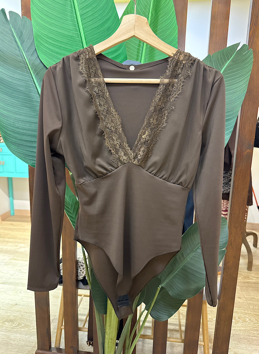 Este body de mangas largas presenta un favorecedor escote pronunciado en forma de V, delicadamente adornado con encaje. La confección ajustada garantiza una silueta esbelta y pulcra, perfecta para combinar con faldas, pantalones de talle alto o jeans. Disponible en varios colores, como burdeos, marrón y negro, permite adaptarlo a diferentes paletas y estilos personales, añadiendo un toque de romanticismo y audacia.