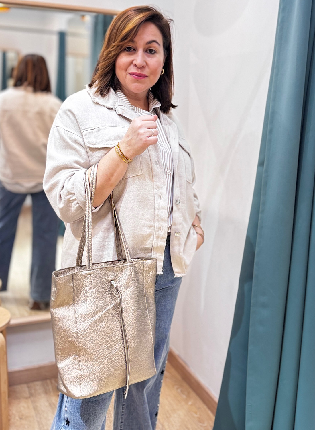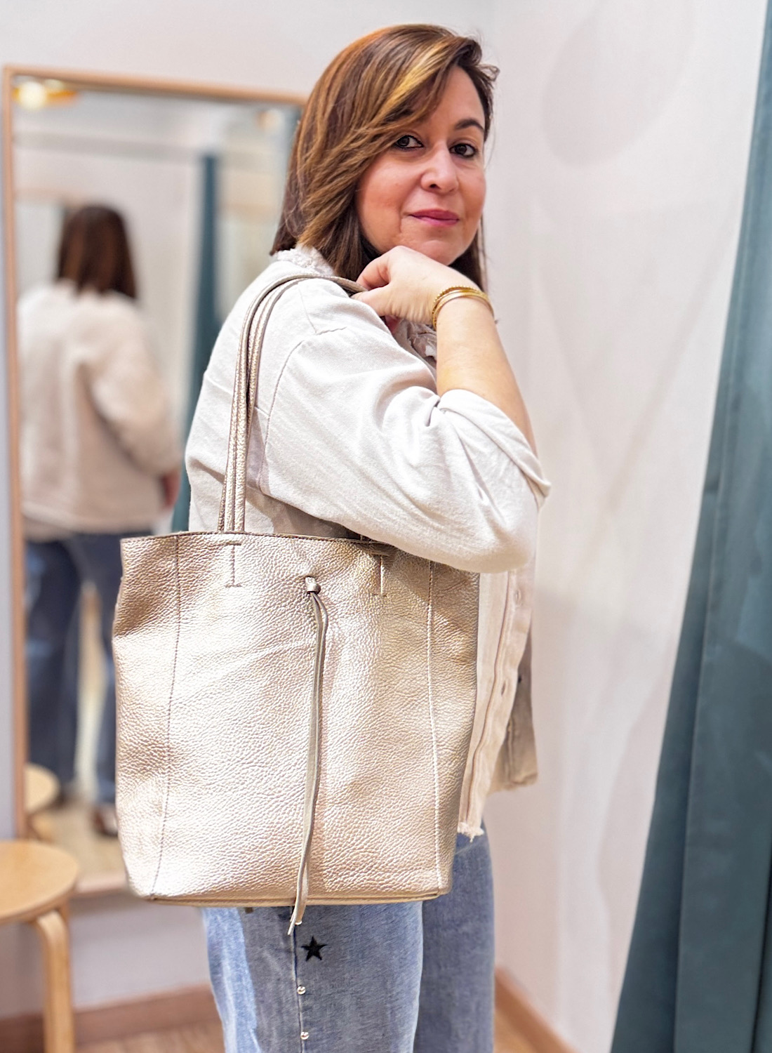 Ya sea para tus jornadas de trabajo, un día de compras o una salida casual, este bolso tote se adapta a la perfección. Su gran capacidad lo convierte en el compañero ideal para organizar tus pertenencias, mientras que su diseño chic eleva instantáneamente tu look. Aporta un brillo sutil y sofisticado que no pasará desapercibido, convirtiéndose en un verdadero statement piece en tu colección de accesorios.