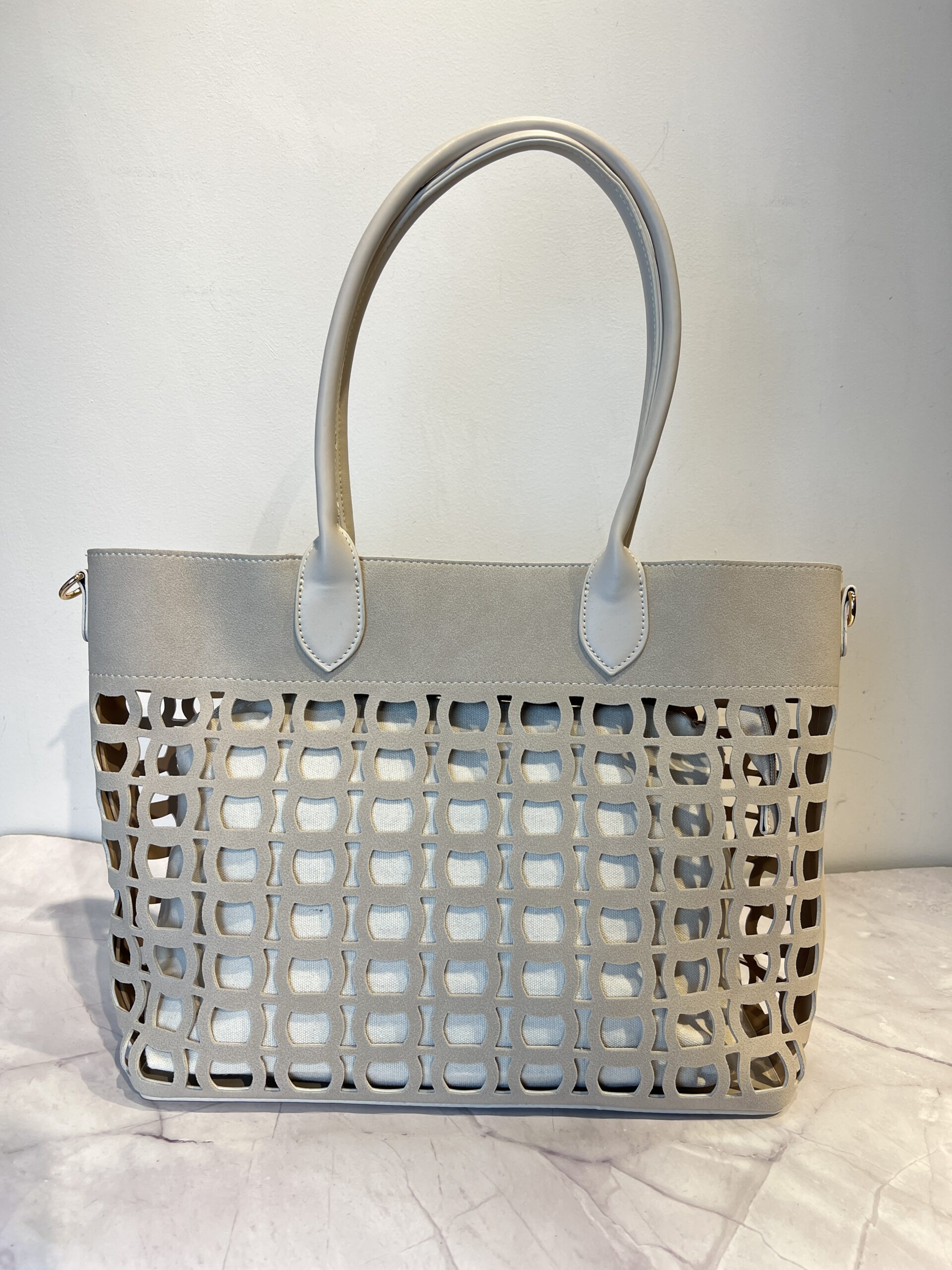 - Doble funcionalidad: Un bolso grande con diseño calado y un bolsito interior extraíble, que puedes usar juntos o por separado.