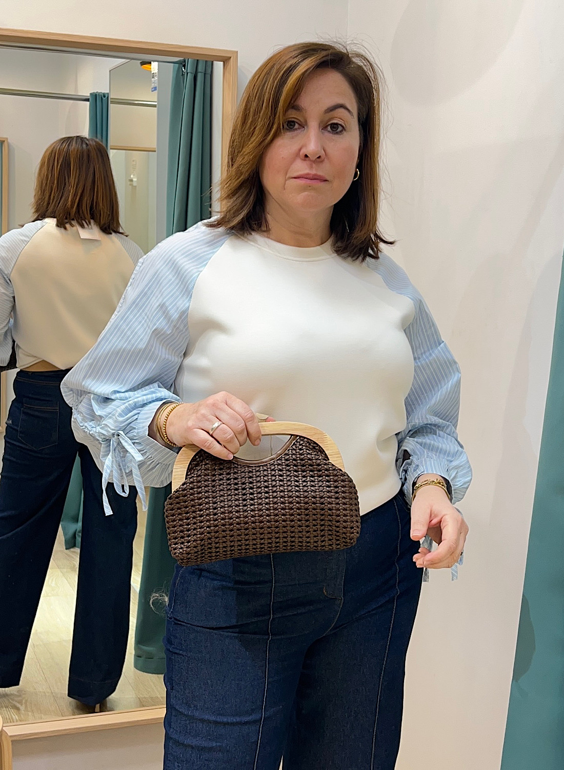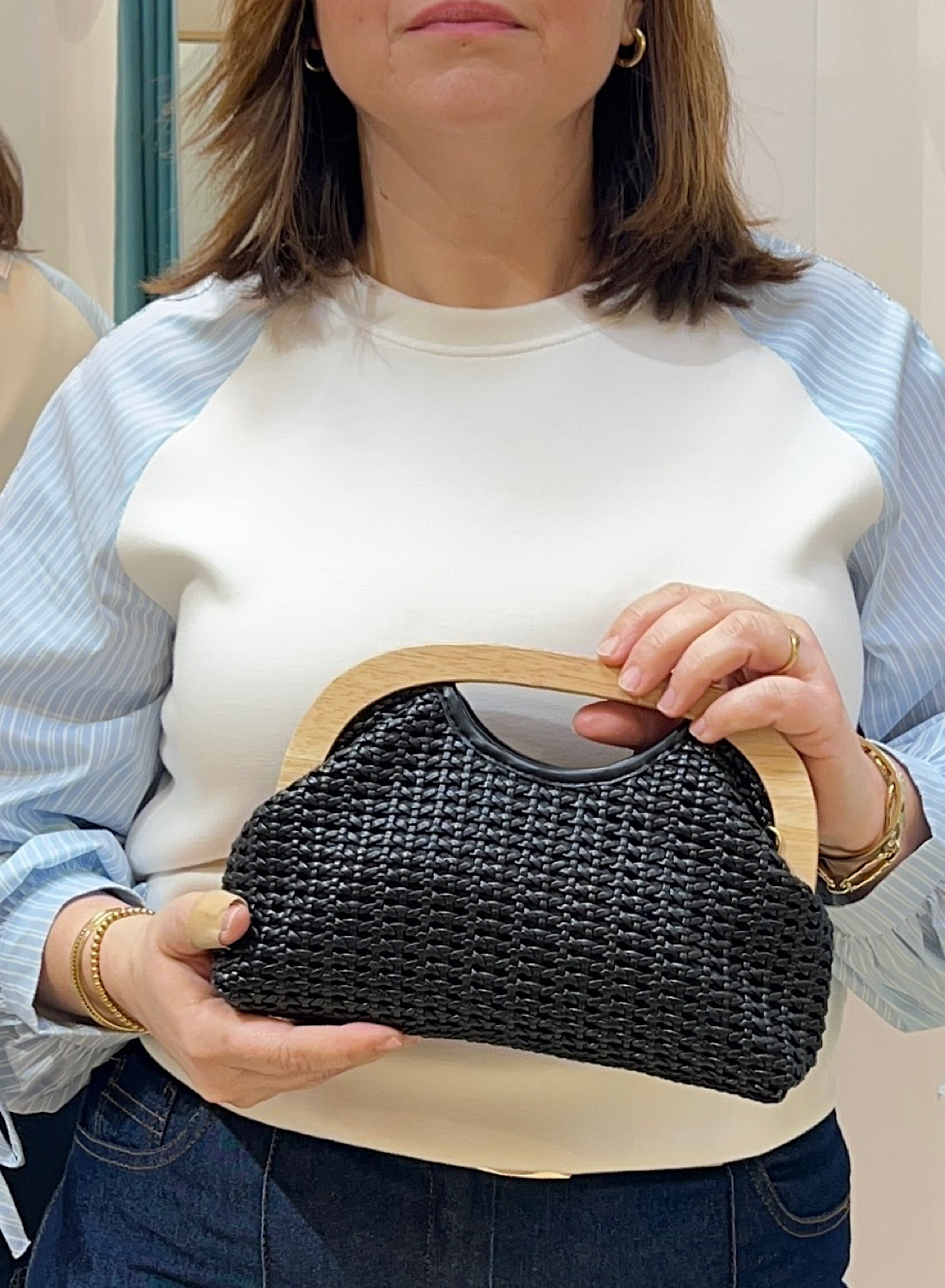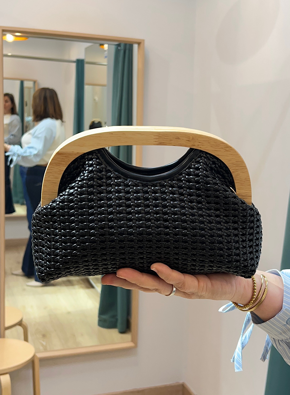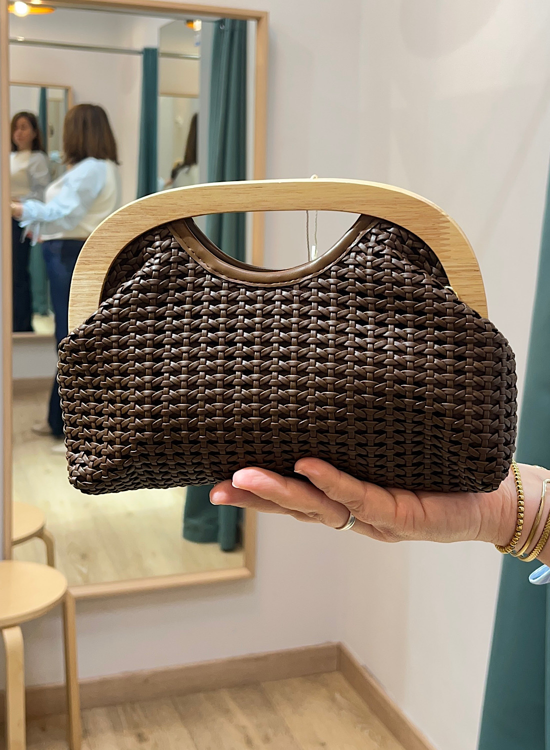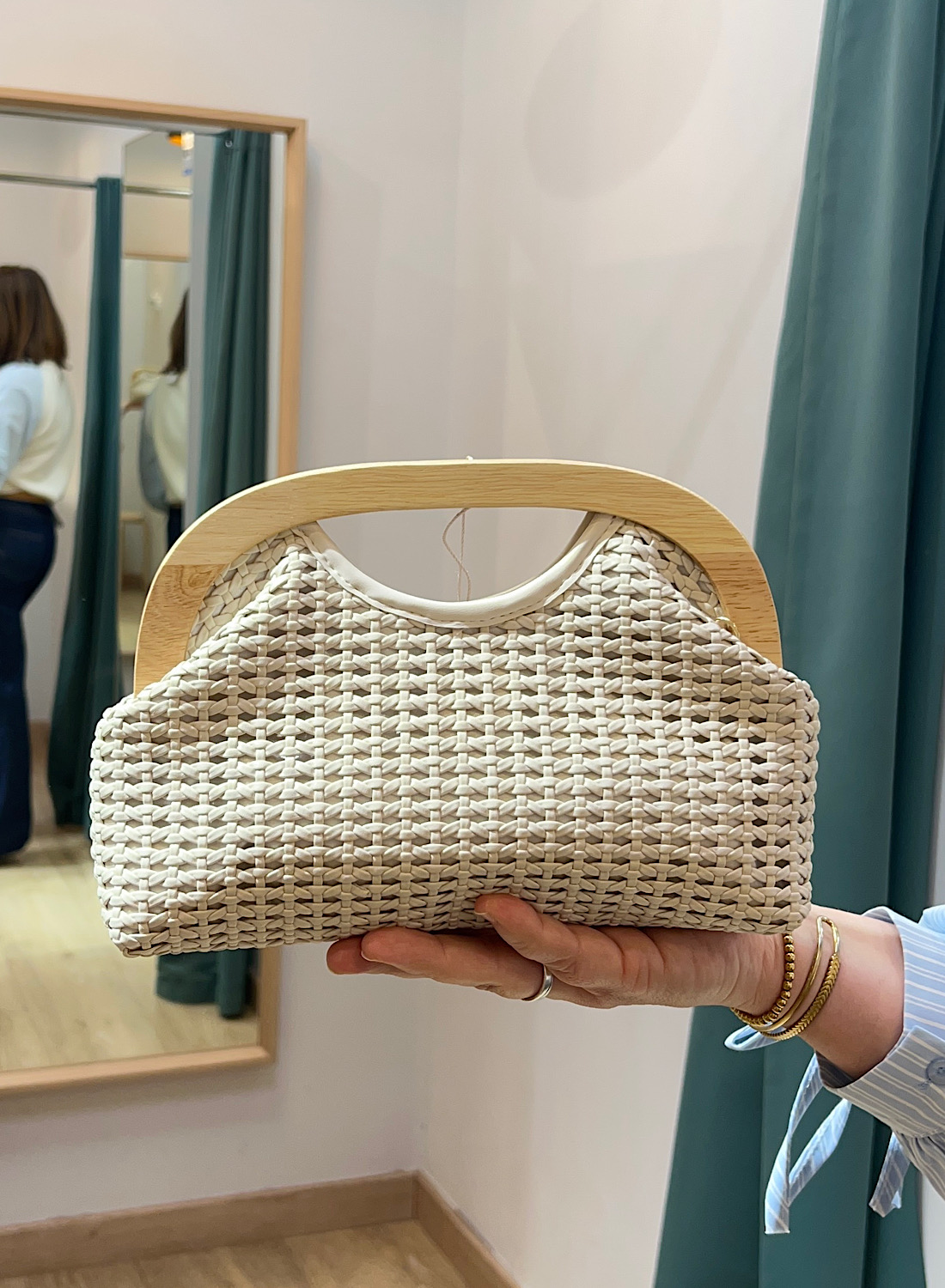 El BOLSO CLARISSE es la elección perfecta para quienes buscan un accesorio que combine la artesanía con un toque moderno y chic. Su diseño se caracteriza por un cuerpo tejido con una textura delicada y atractiva, complementado por una distintiva asa superior de madera clara. Esta combinación de materiales naturales aporta una estética fresca y versátil, ideal para cualquier ocasión, desde un paseo casual hasta un evento más formal.