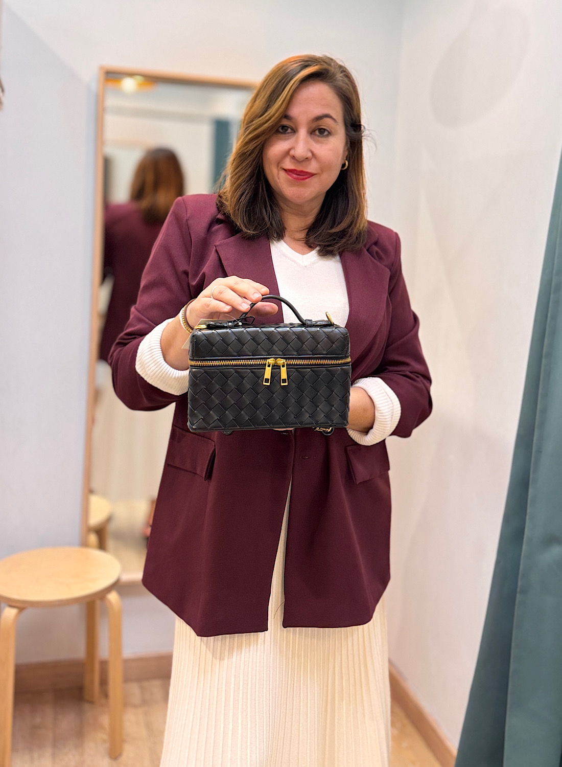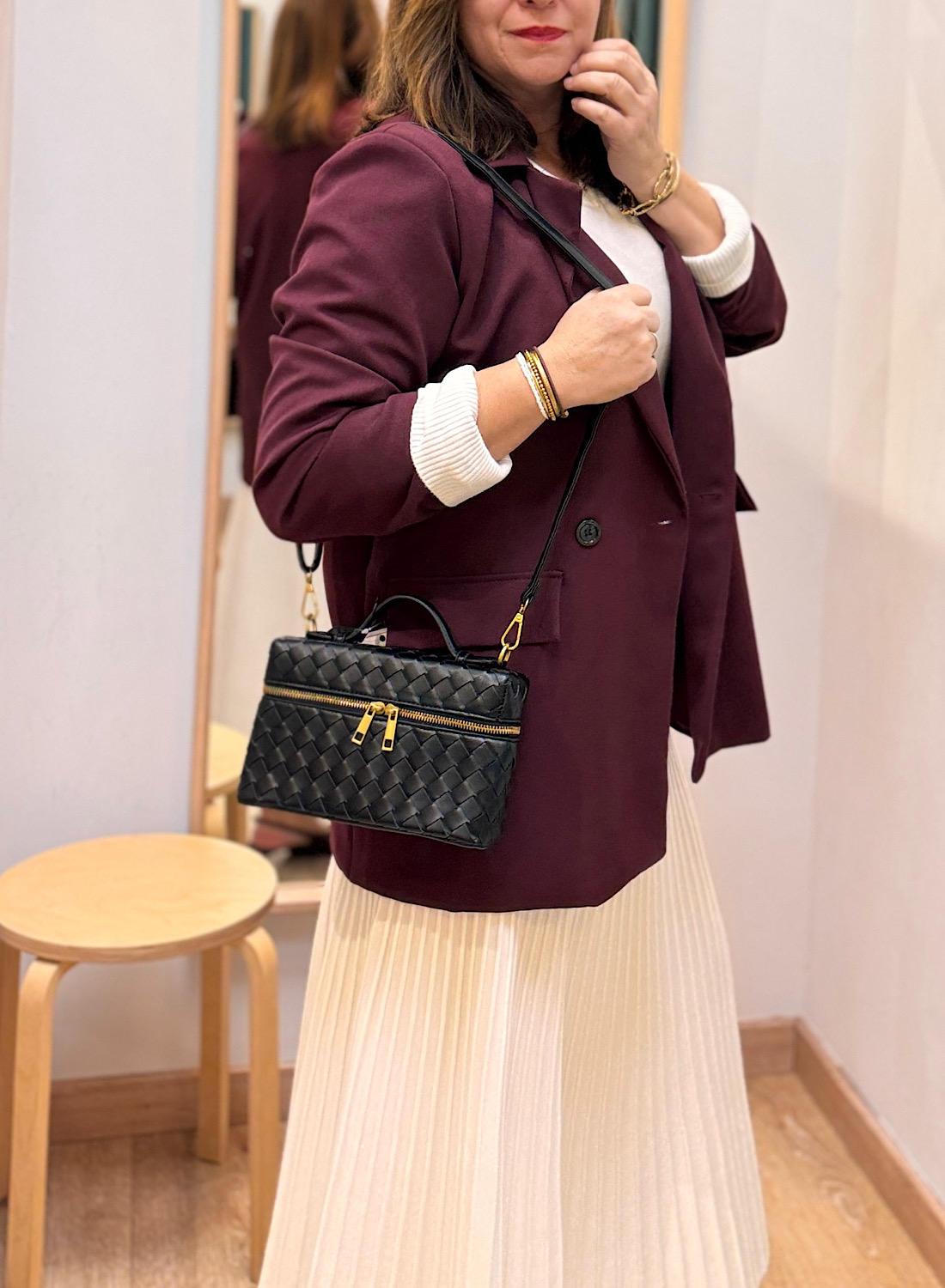 El BOLSO COFRE TRENZA presenta una forma de cofre clásica, reinventada con un patrón trenzado que le confiere un carácter único y moderno. La cremallera doble en la parte superior, de un brillante tono dorado, no solo asegura tus pertenencias, sino que también sirve como un elemento decorativo prominente. Su asa superior permite un agarre cómodo para llevarlo en la mano, ideal para eventos o looks más formales.