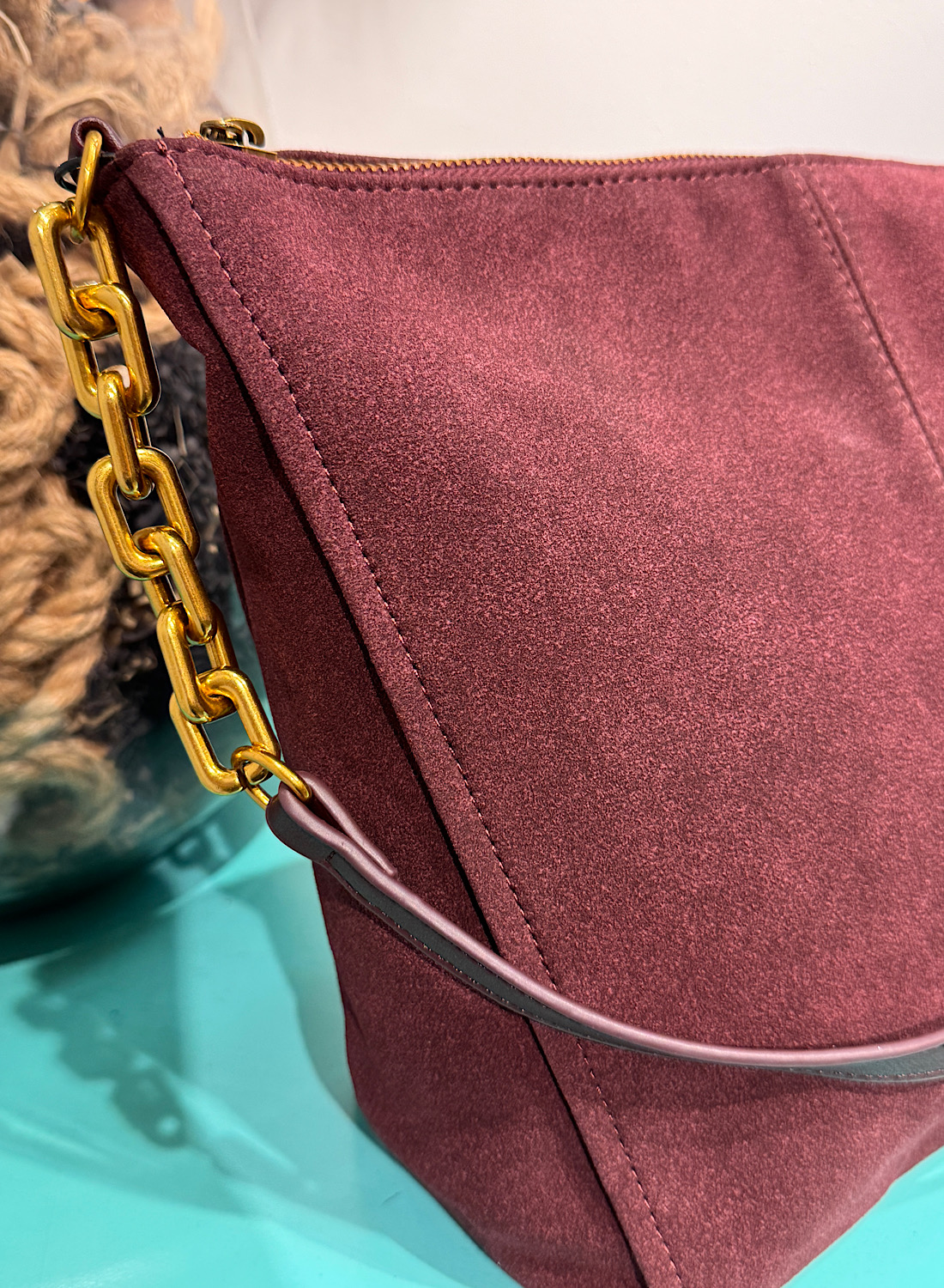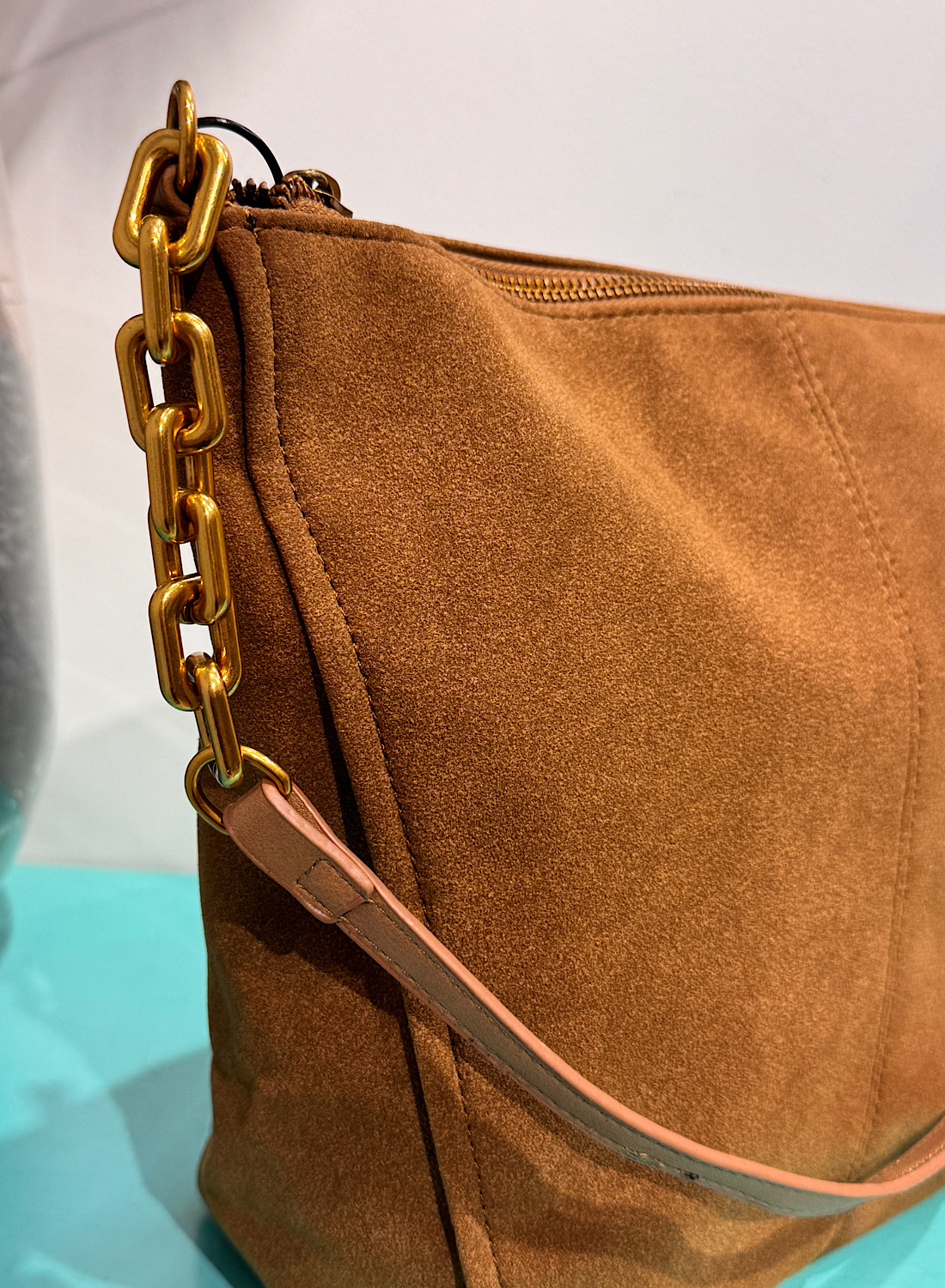 Este bolso destaca por su diseño contemporáneo, que equilibra la suavidad de su material con la robustez de sus herrajes dorados. Presenta una forma cómoda y adaptable, perfecta para llevar al hombro o cruzado. La elección de tonos tierra o borgoña profundo lo hace fácilmente combinable con una amplia variedad de paletas de color, asegurando que siempre encuentres el look perfecto.