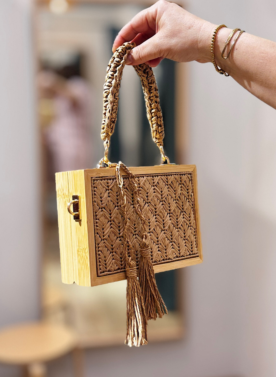 El Bolso Nuria destaca por su estructura rectangular rígida, que combina la robustez de la madera en sus marcos y laterales con la delicadeza de un tejido natural entrelazado que cubre sus paneles. Este contraste de materiales le confiere una estética única y muy actual. Incorpora un asa de mano trenzada a juego y un par de borlas decorativas que añaden movimiento y un encanto bohemio.