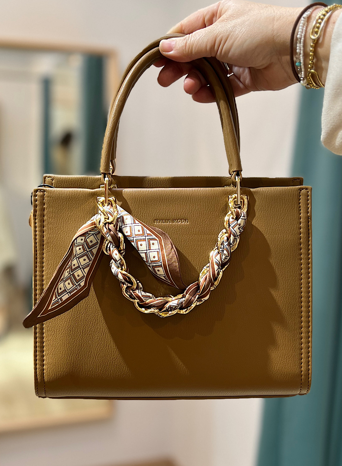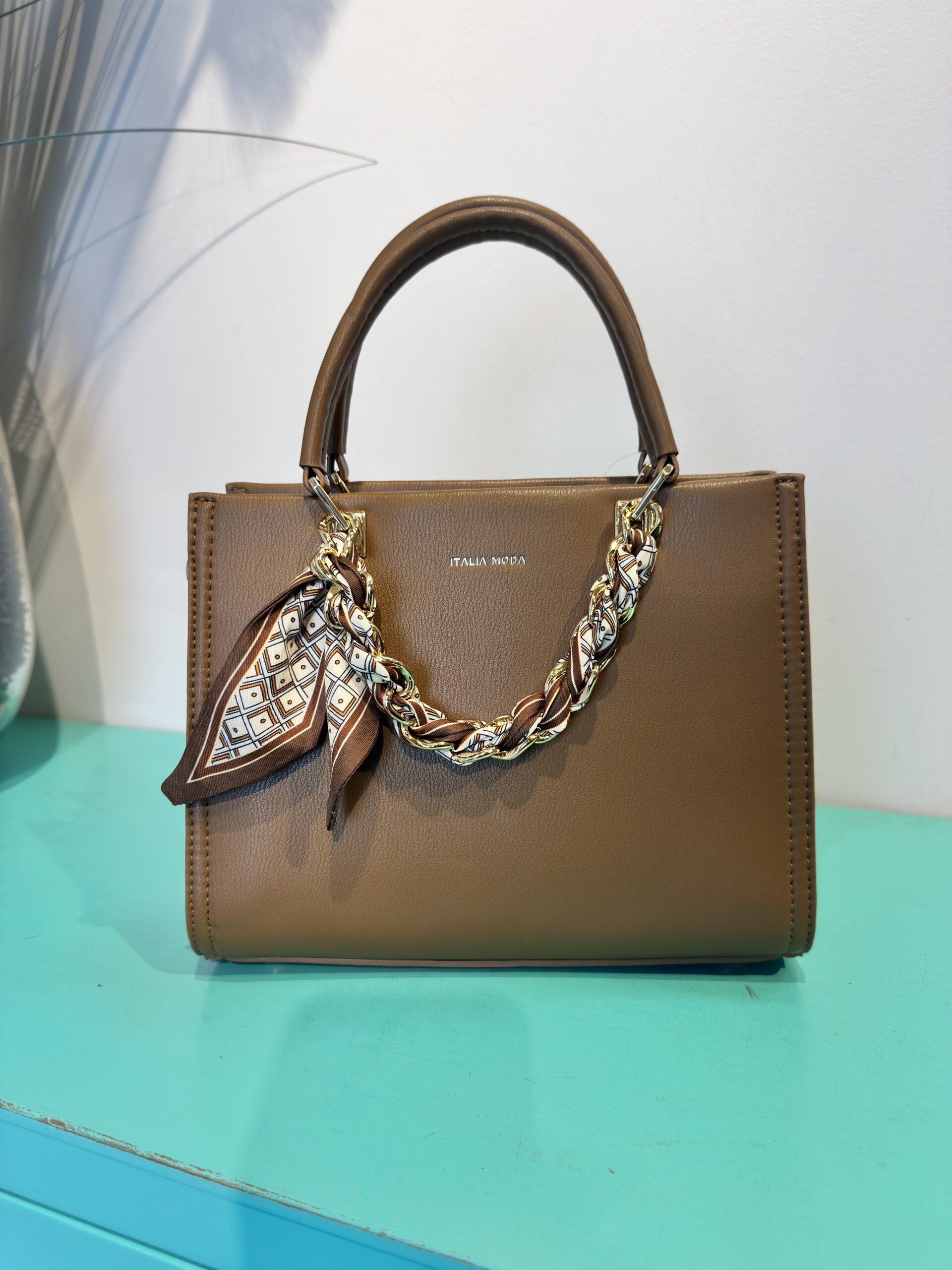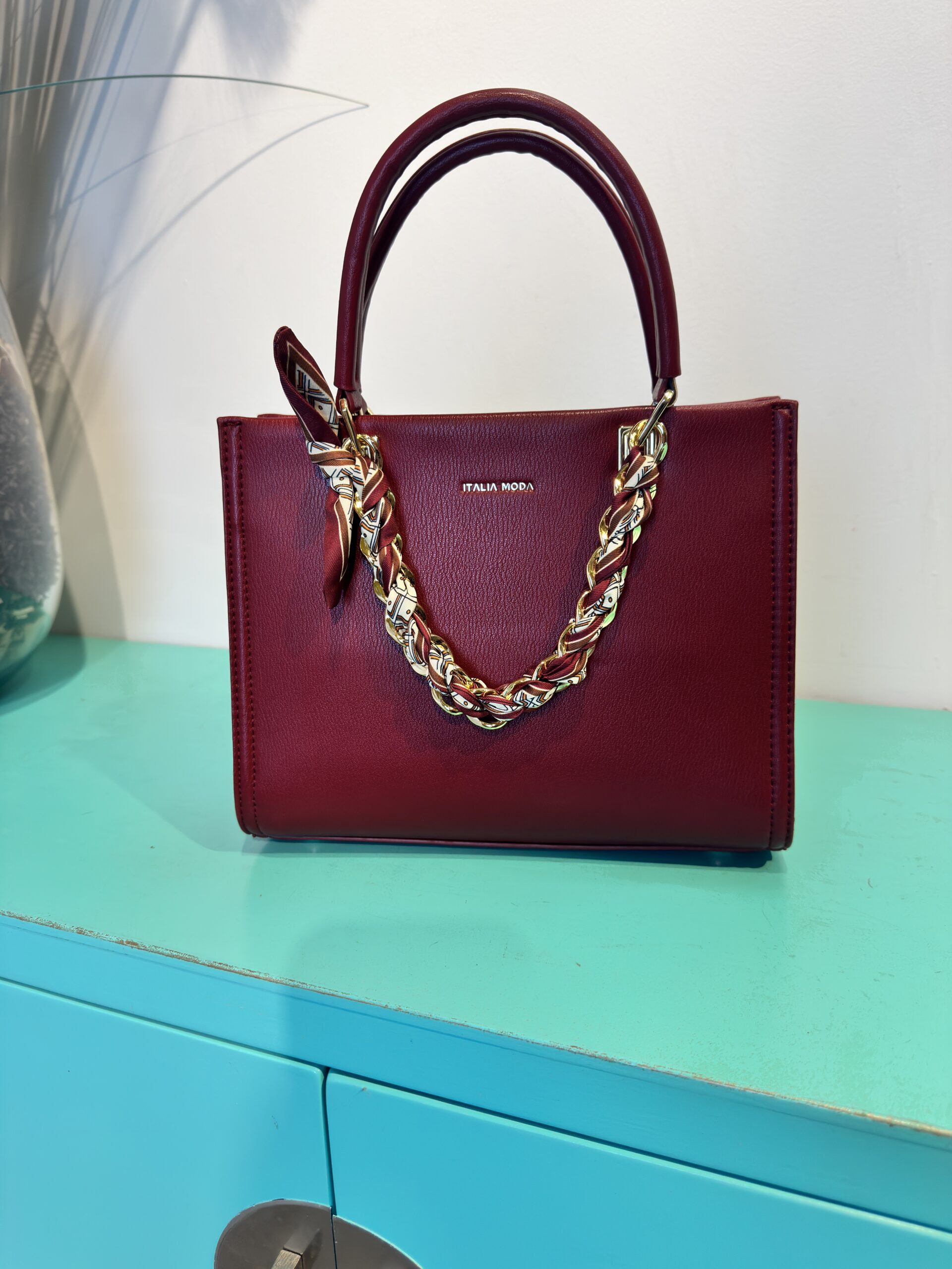 El BOLSO VERA se presenta con una silueta estructurada y líneas limpias, disponible en cautivadores tonos como el rojo intenso y un elegante marrón, perfectos para complementar una amplia gama de vestuarios. Su característica más distintiva es el asa superior complementada por una cadena decorativa entrelazada con un pañuelo estampado, que añade un toque chic y original. Este detalle no solo embellece, sino que también sugiere la atención al detalle de la marca ITALIA ROSA.