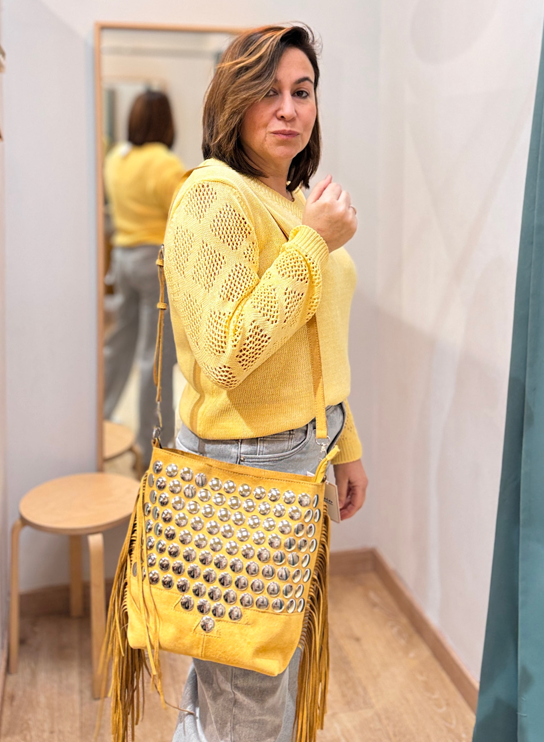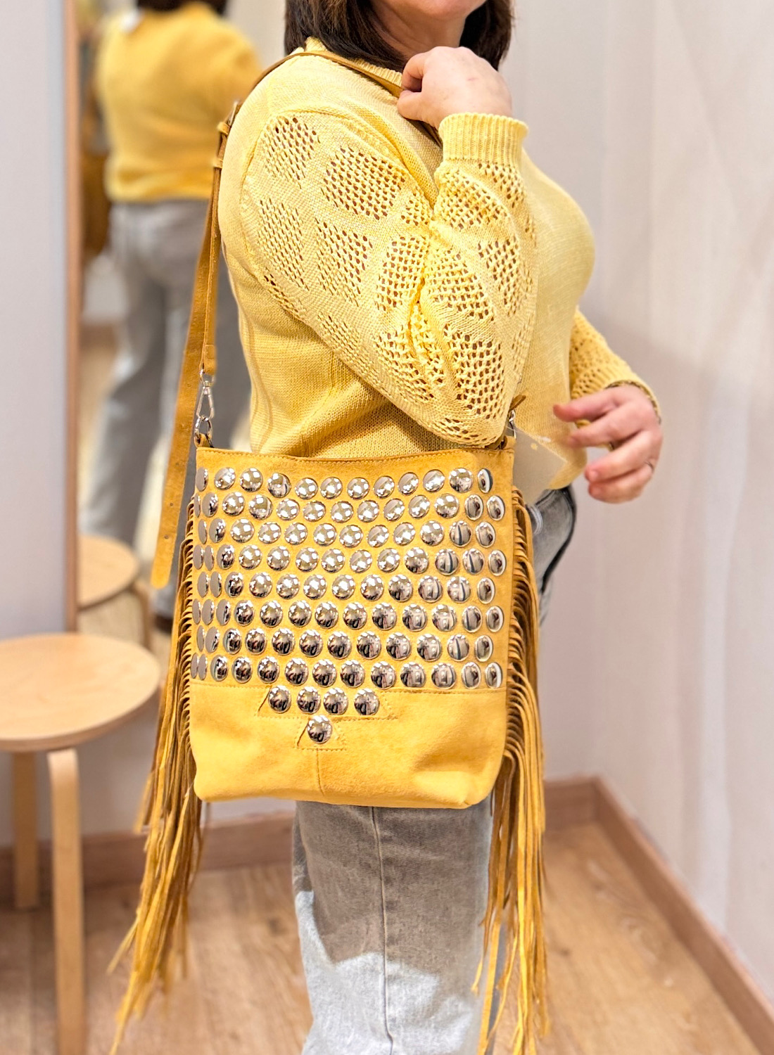 El diseño del BOLSO YELLOW es una fusión perfecta entre lo moderno y lo bohemio. Su parte frontal está adornada con una profusión de tachuelas metálicas en tono plata, dispuestas en un patrón simétrico que crea un efecto visual impactante. A ambos lados, largos flecos de material a juego aportan movimiento y un toque desenfadado, realzando su carácter único. Su correa ajustable permite llevarlo cómodamente al hombro o cruzado.