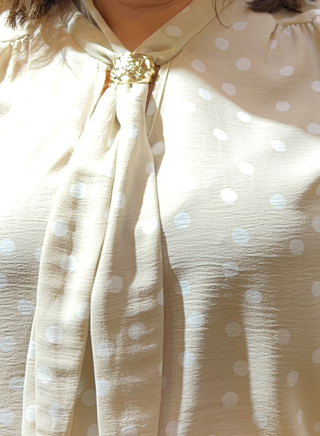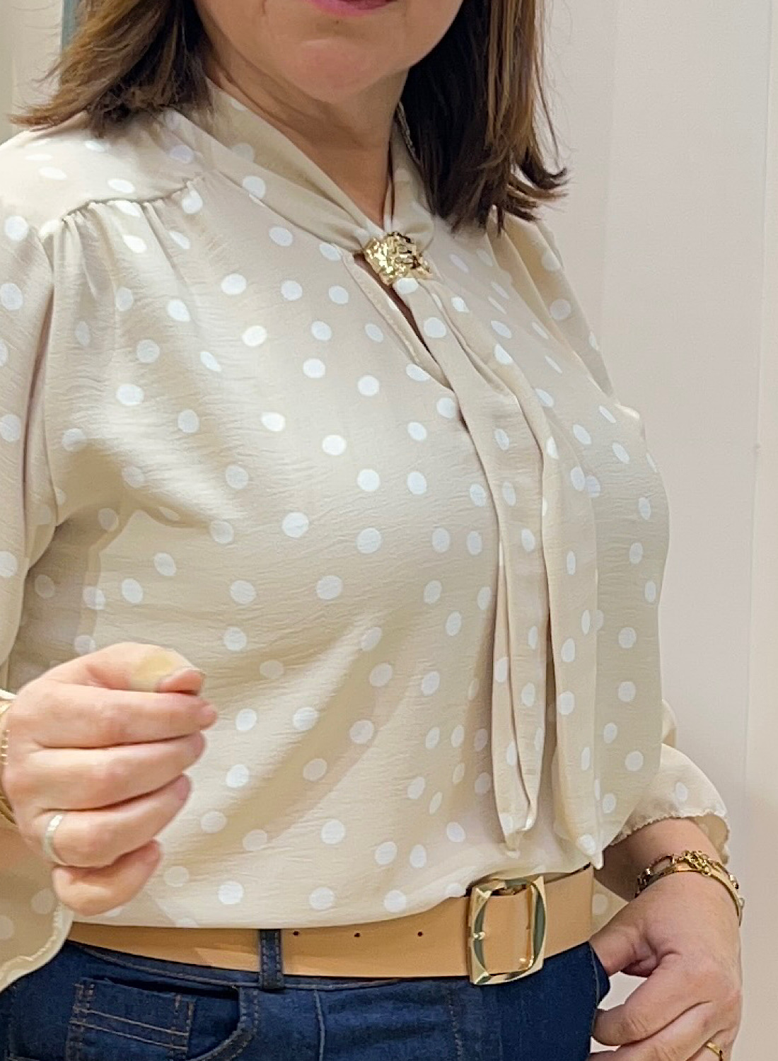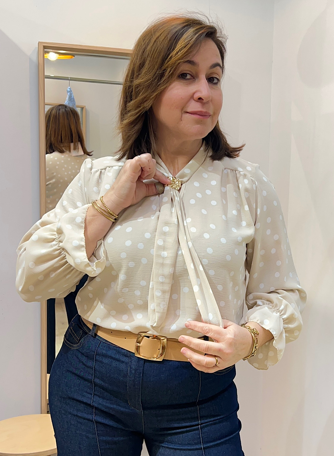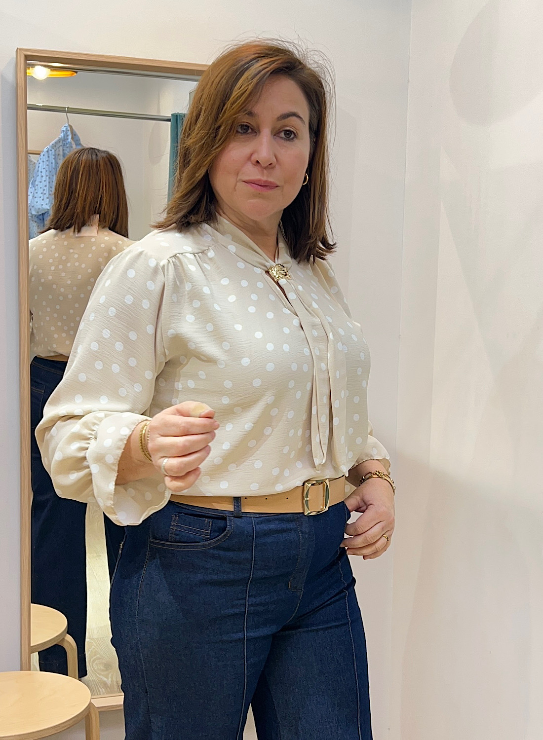 Esta CAMISA BEIGE LUNARES es increíblemente versátil. Es perfecta para un ambiente de oficina cuando se combina con pantalones de vestir o una falda lápiz, creando un look profesional impecable. Asimismo, puede transformarse en una opción ideal para salidas casuales o eventos semi-formales si se combina con vaqueros de corte recto o faldas fluidas, demostrando que la elegancia y la comodidad pueden ir de la mano.