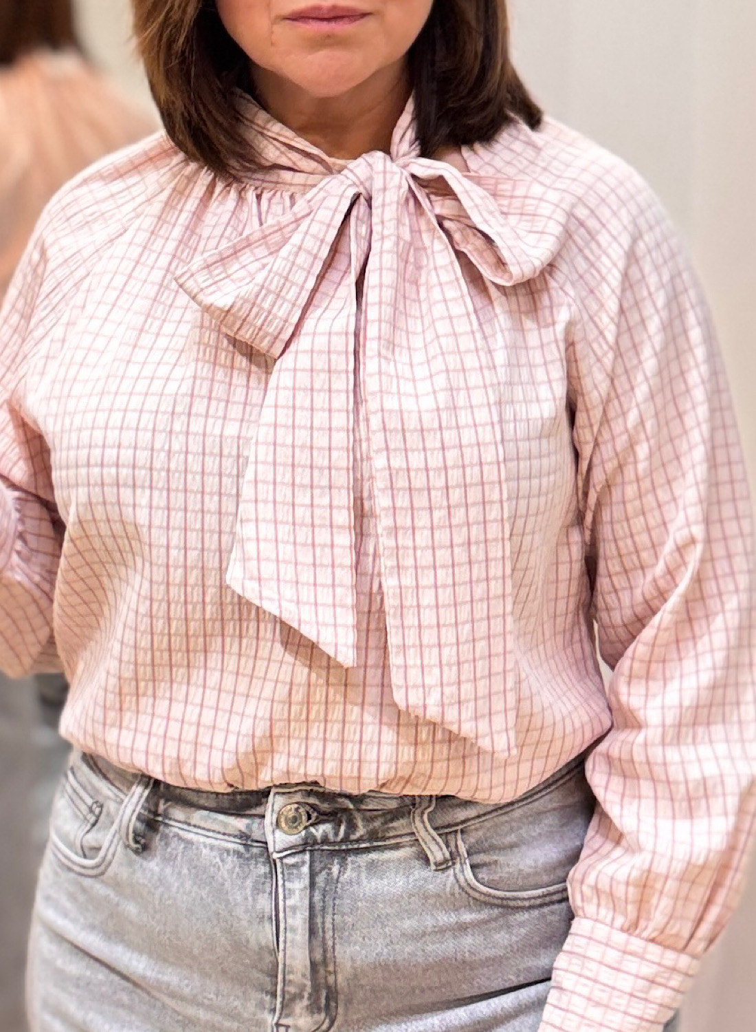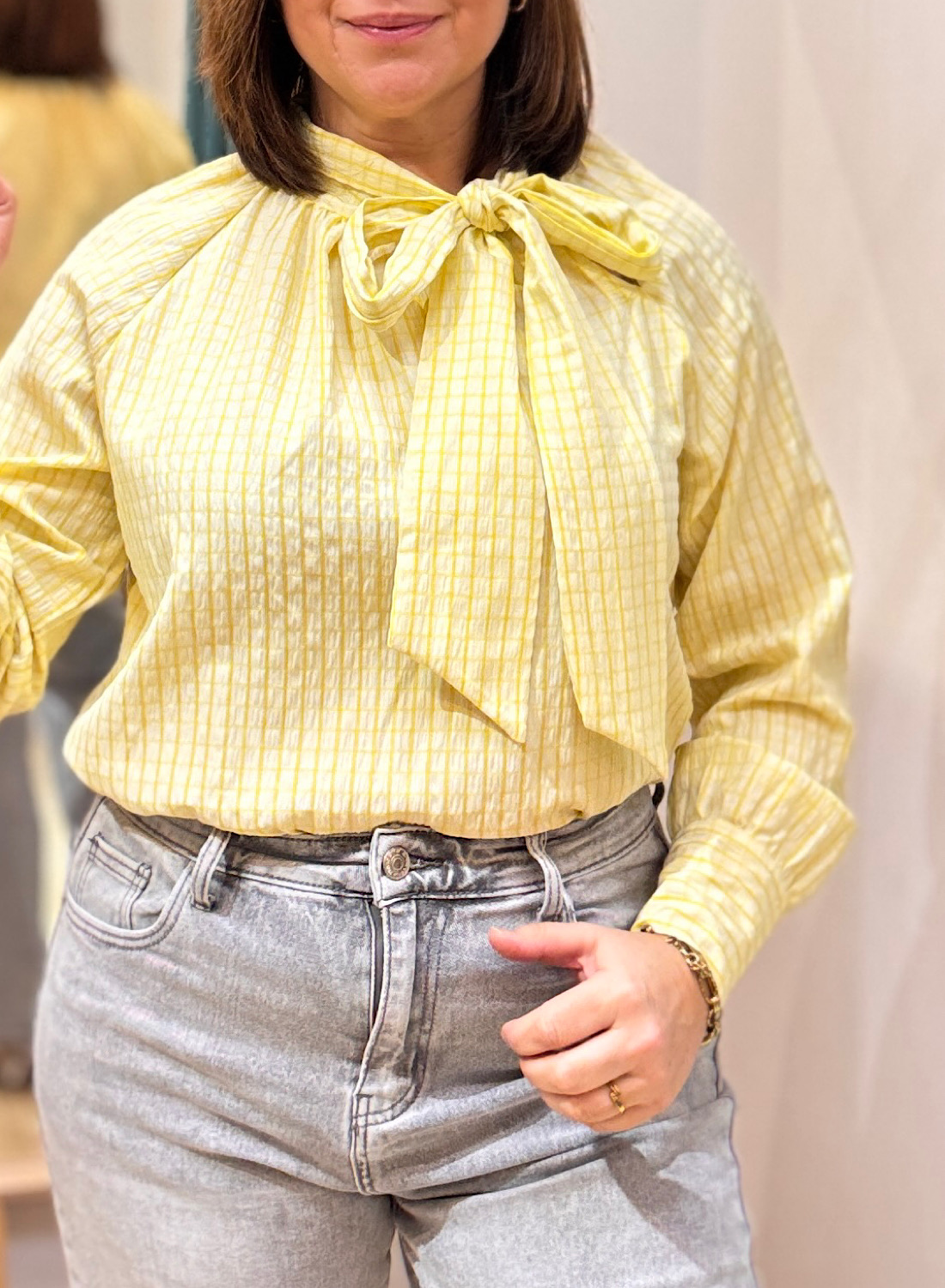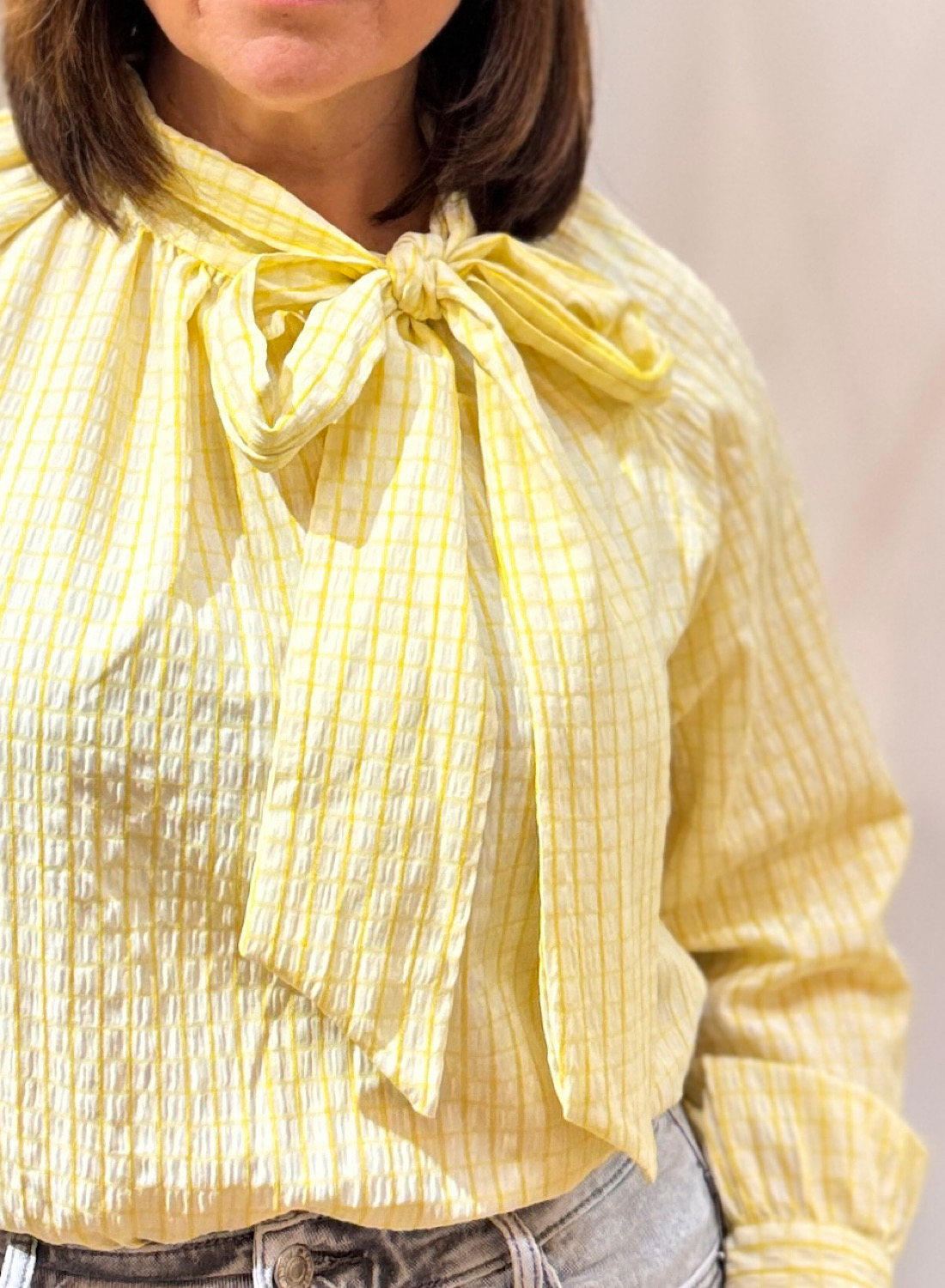 Esta exquisita camisa presenta un cuello alto con una lazada ajustable que puedes anudar en un elegante lazo o dejar caer con gracia, según la ocasión. Confeccionada en un tejido ligero con una sutil textura, luce un patrón de cuadros discretos en tonos suaves como el amarillo o el rosa, visibles en las imágenes. Las mangas largas, acabadas en puños clásicos, complementan su estilo refinado, ideal para aportar un toque formal o casual-chic.