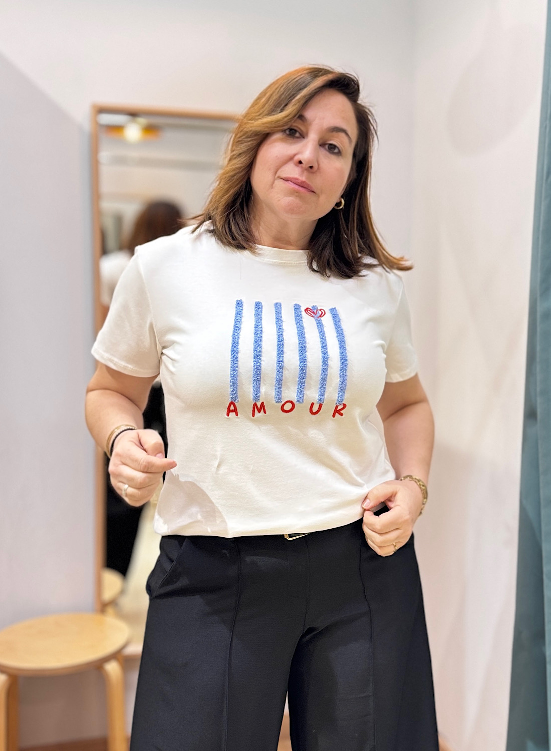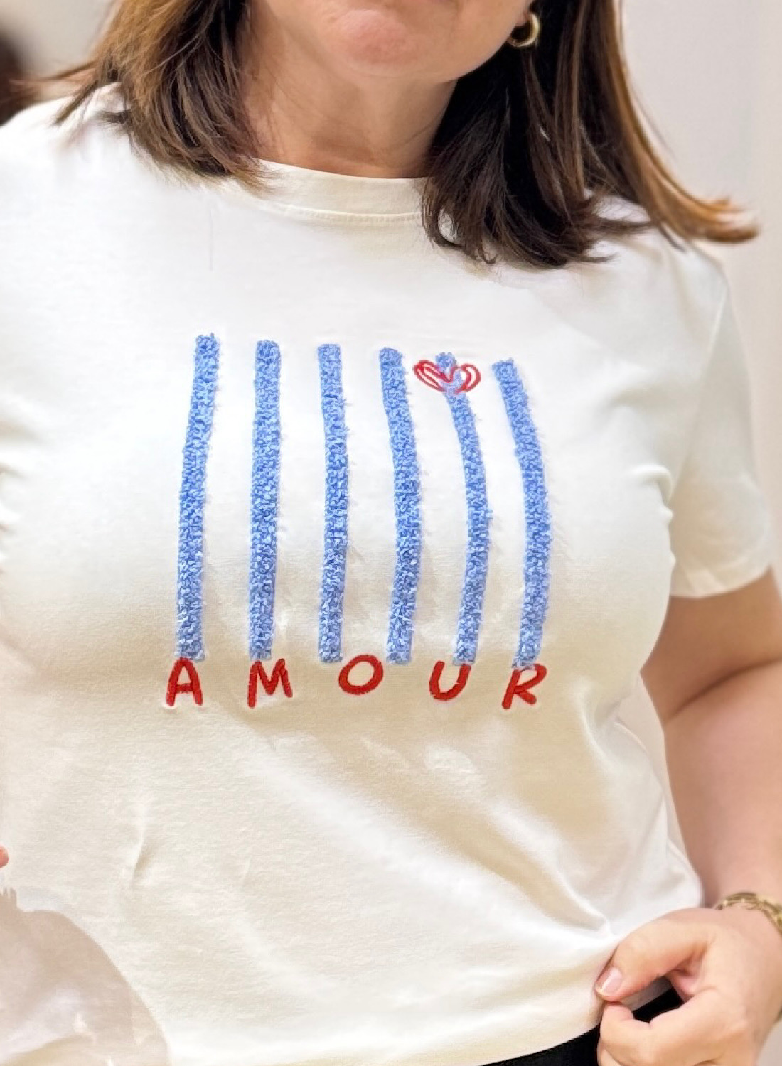 Esta camiseta es perfecta para aquellas que aprecian la moda con un toque personal y buscan prendas fáciles de combinar. Es ideal para un paseo, una tarde con amigas o para darle un aire fresco a tu atuendo de oficina informal. Combínala con tus accesorios favoritos para crear un look único y expresar tu estilo con “amour”.
