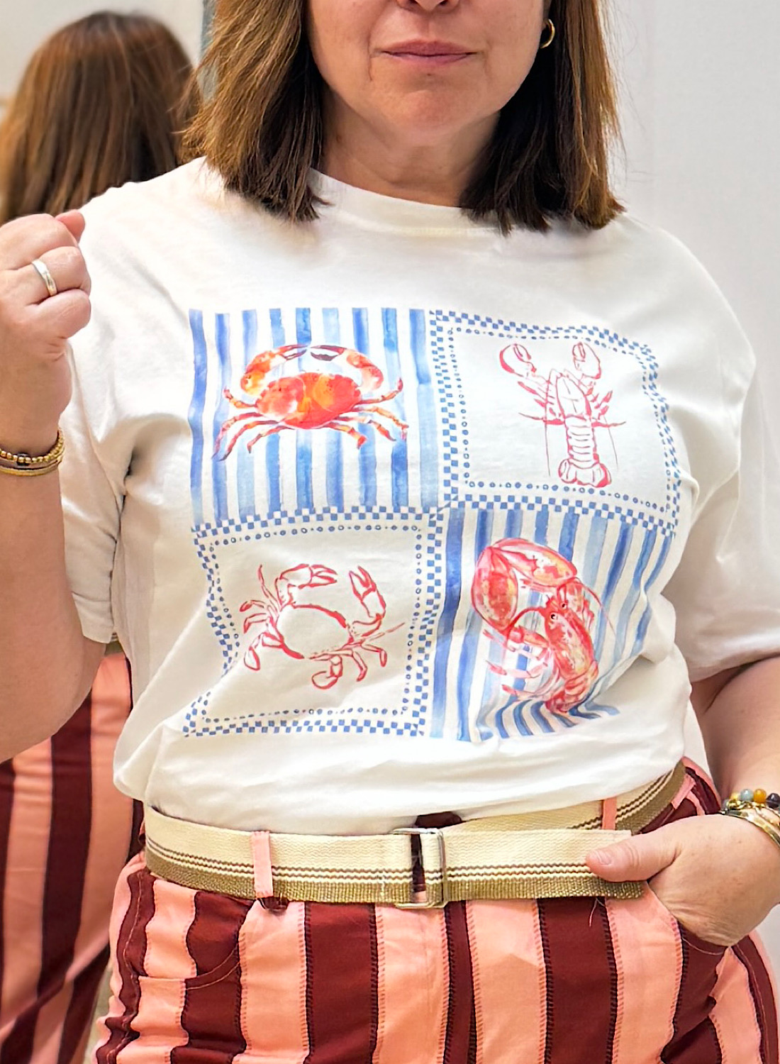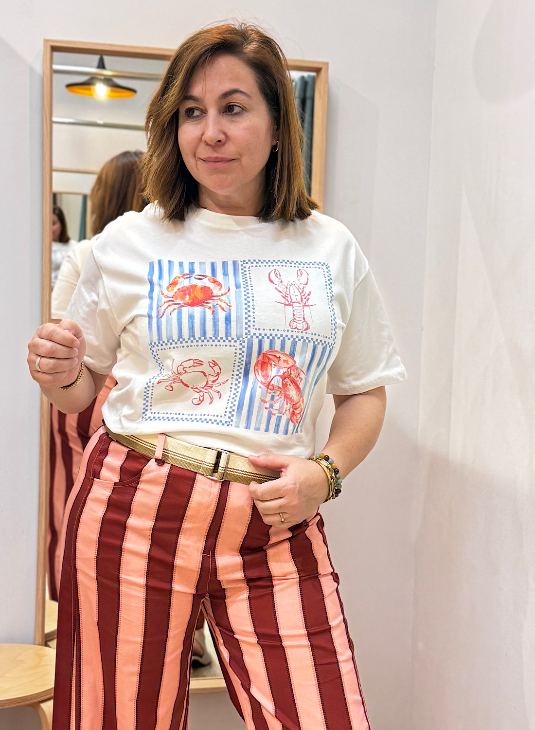 Esta camiseta blanca destaca por su cautivador estampado frontal de inspiración marina. Presenta cuatro paneles distribuidos simétricamente: dos con un patrón de rayas azules verticales y dos con un diseño de cuadros azules, cada uno albergando ilustraciones detalladas de cangrejos y langostas en tonos rojizos. Un diseño que evoca la brisa del mar y la alegría del verano, ideal para un estilo casual y chic.