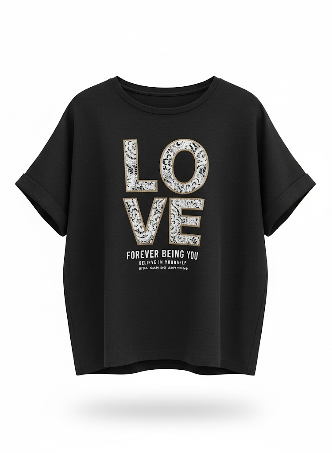 Esta moderna camiseta negra de manga corta presenta un cuello redondo clásico y mangas con dobladillo enrollado para un toque desenfadado. El protagonista es el llamativo estampado frontal que deletrea “LOVE” con un sofisticado patrón de encaje blanco y contornos dorados o beige, aportando un brillo sutil y elegante. Debajo, las frases motivadoras “FOREVER BEING YOU” y “BELIEVE IN YOURSELF GIRL CAN DO ANYTHING” refuerzan su mensaje de empoderamiento.