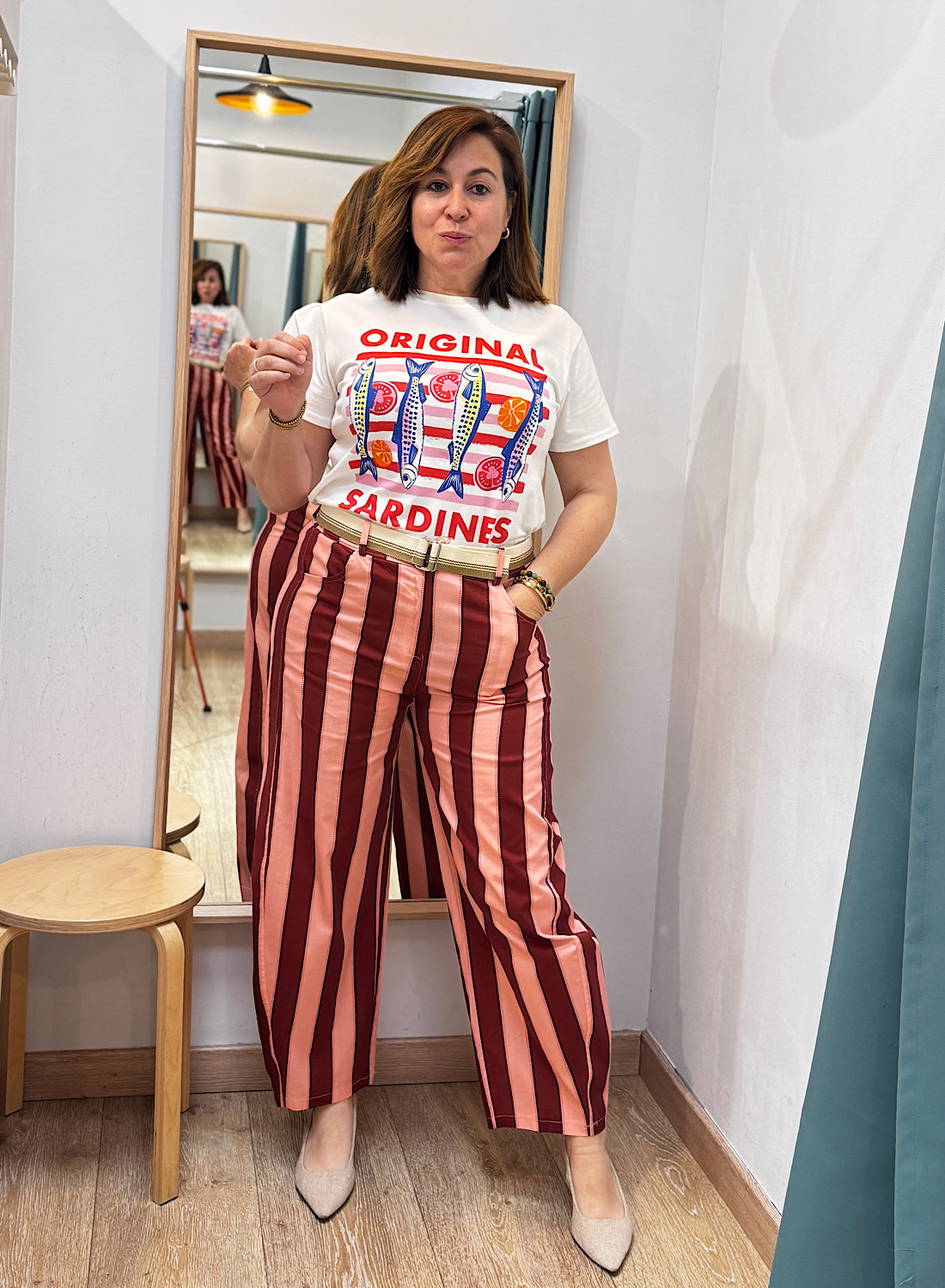 - Estampado exclusivo: Diseño original de sardinas y elementos frescos sobre rayas.