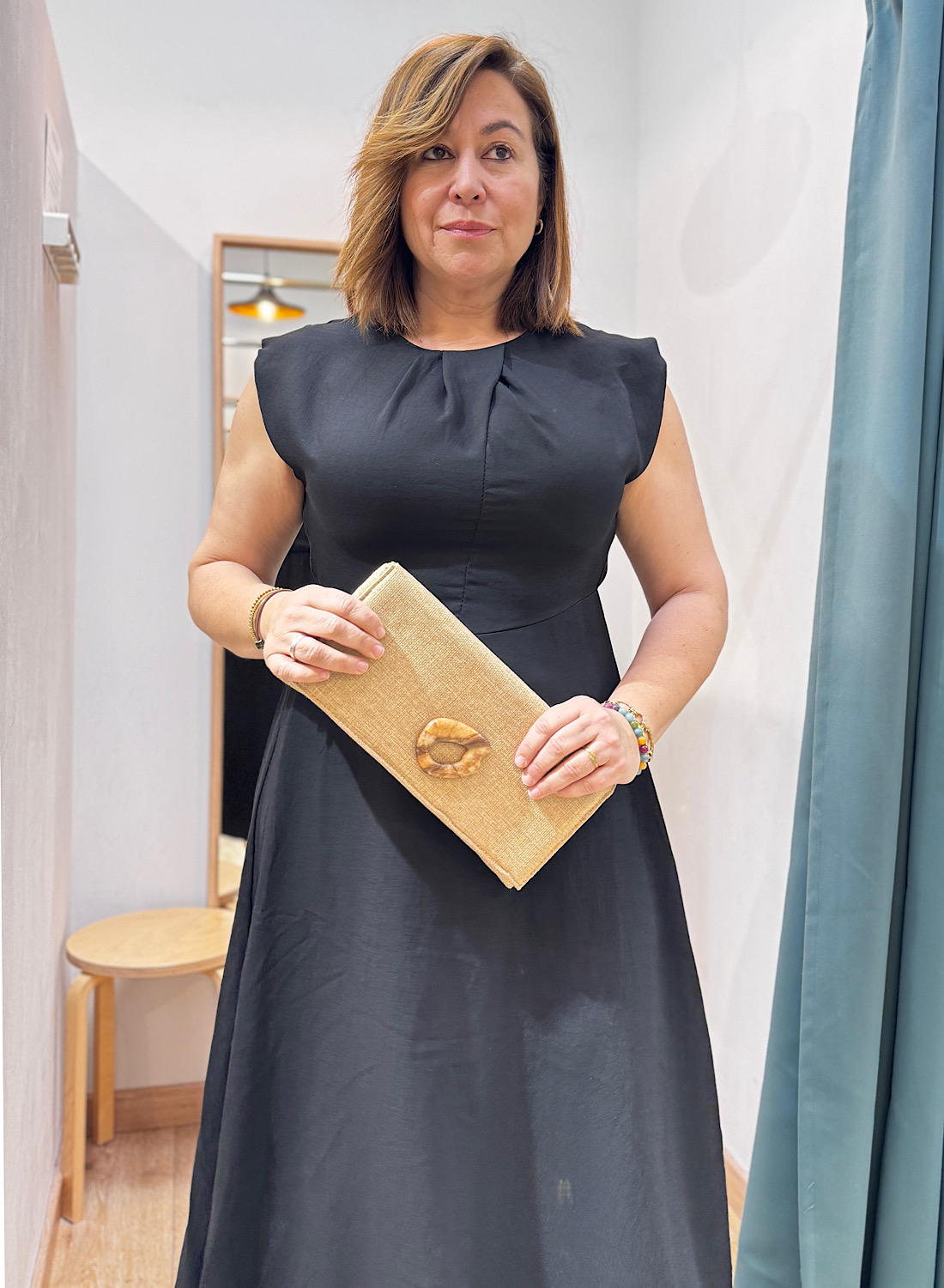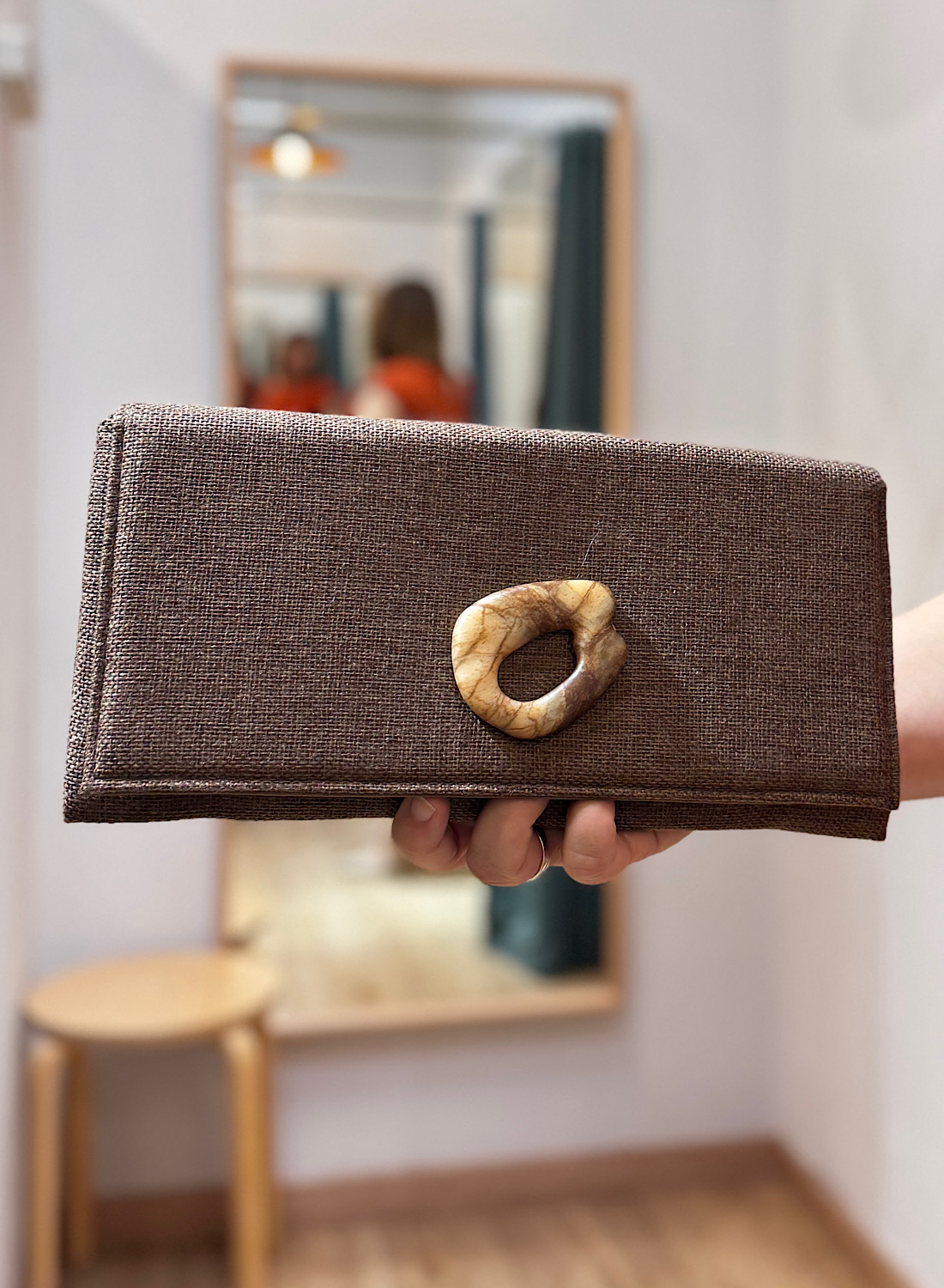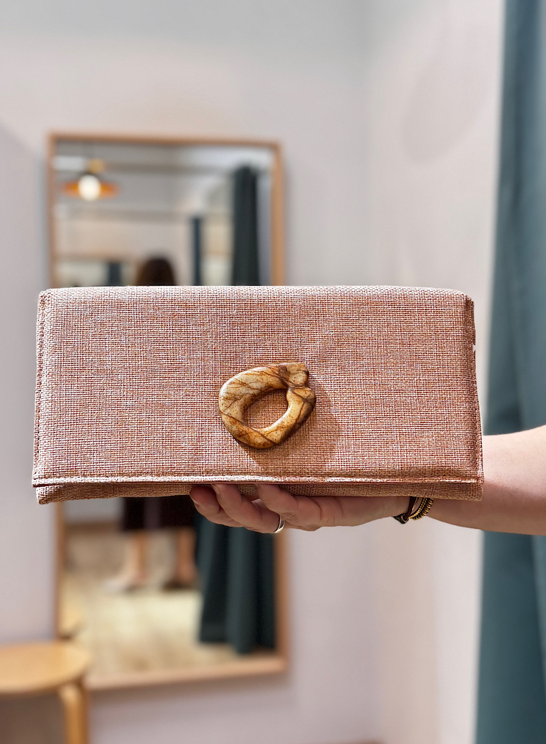 La Cartera Mano Estela presenta una silueta rectangular clásica, confeccionada con un tejido que exhibe una textura fina y un acabado ligeramente brillante o iridiscente, evocando la delicadeza de la rafia o un tejido entrelazado. Su color neutro, que oscila entre el beige y un bronce suave, la hace extremadamente versátil para combinar con una amplia paleta de colores. El elemento más distintivo es, sin duda, su cierre frontal de diseño orgánico, con un acabado que simula madera o resina pulida, aportando un aire artesanal y exclusivo.