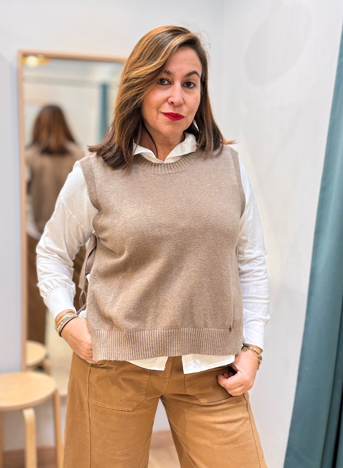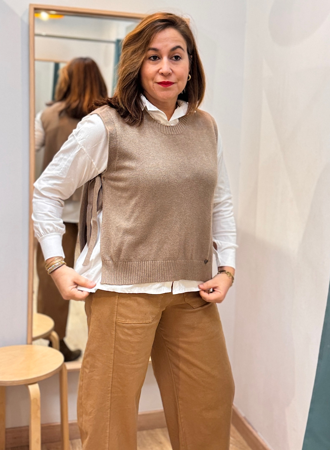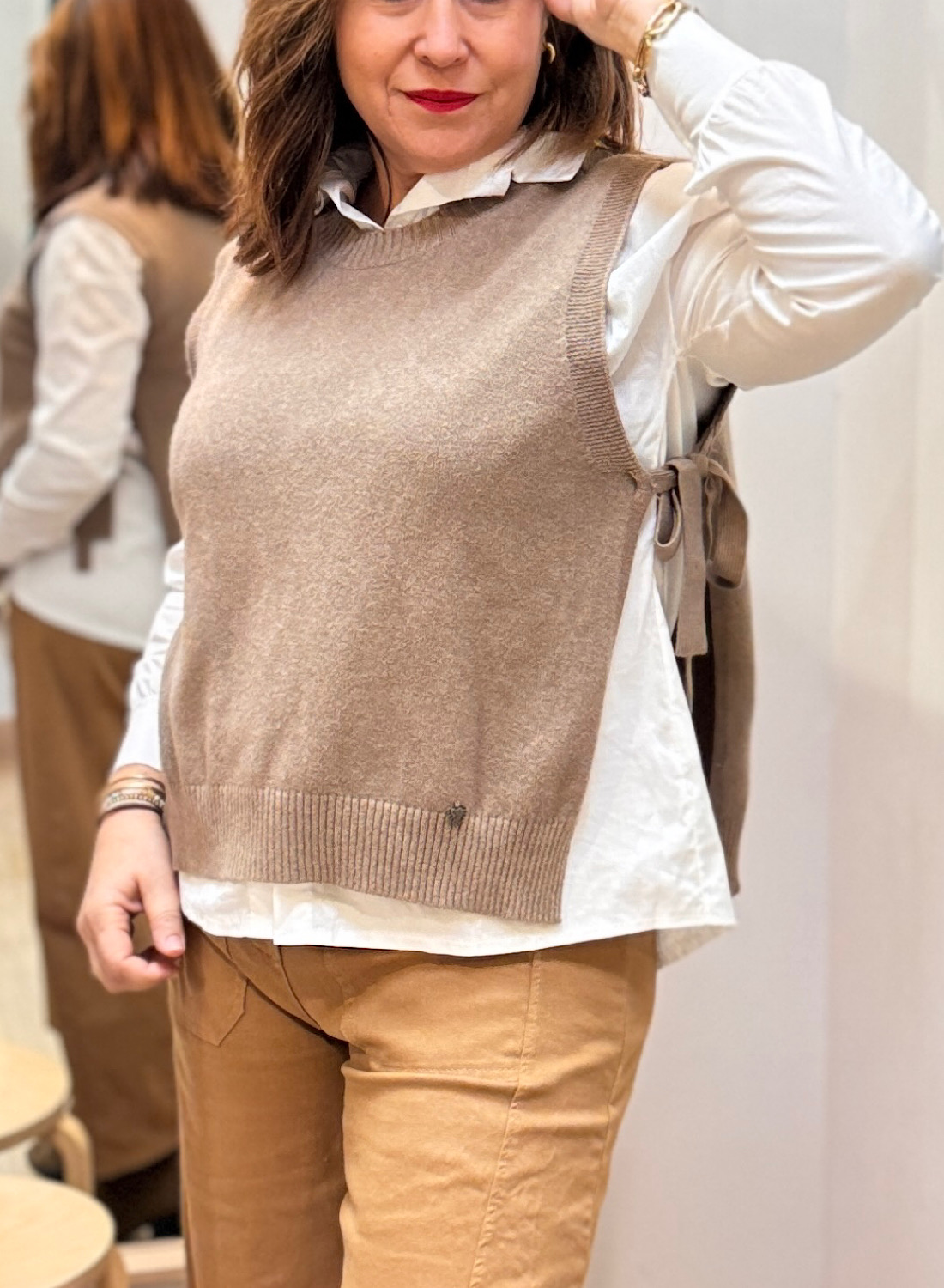Este chaleco presenta un diseño atemporal de cuello redondo y un bajo acanalado, que le confiere una caída estructurada y favorecedora. Su color neutro y versátil facilita la combinación con una amplia gama de prendas y tonalidades. El detalle más distintivo son los elegantes lazos laterales, que no solo añaden un toque femenino y moderno, sino que también permiten un ajuste sutil y un movimiento fluido, realzando la silueta con discreción.