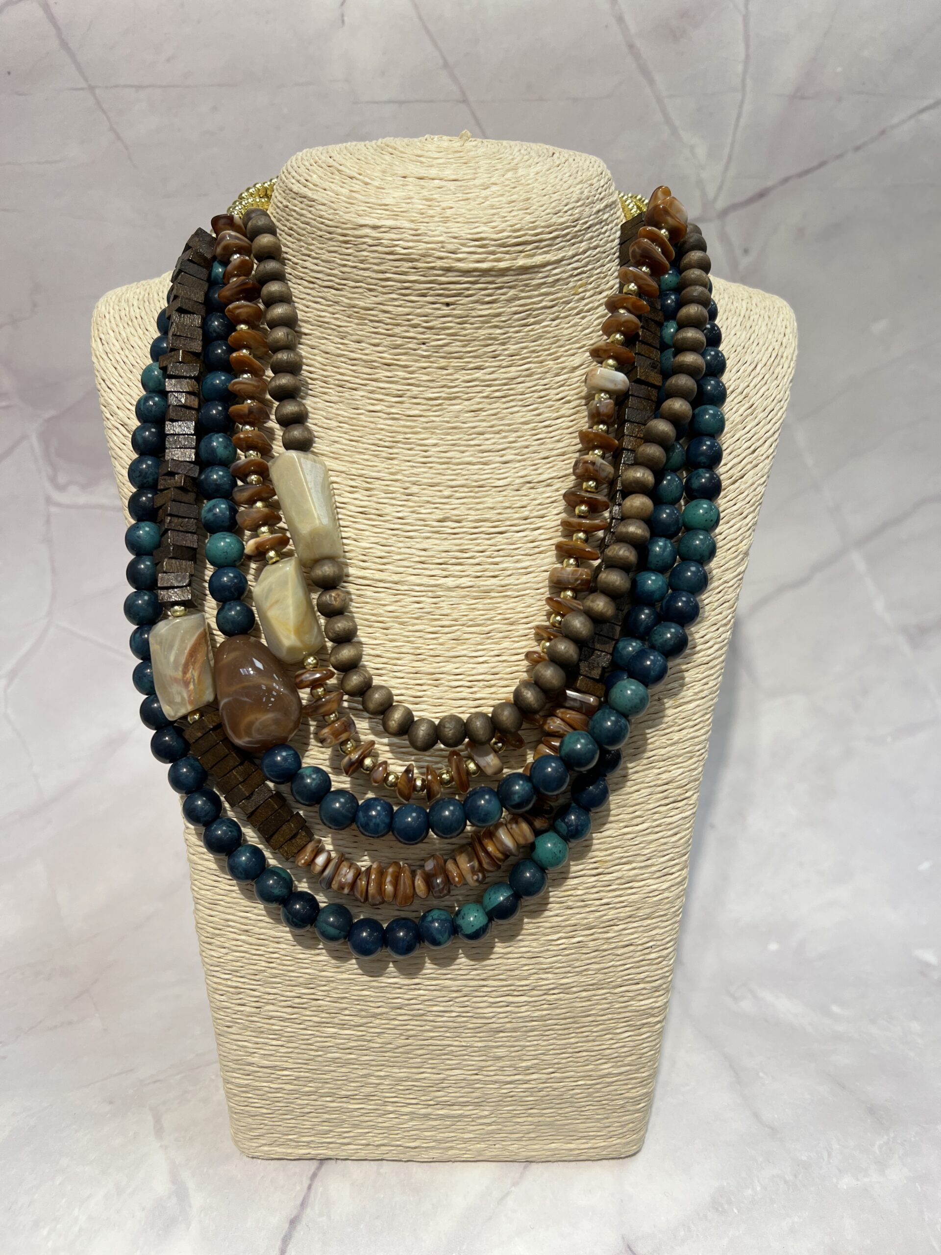 El diseño del COLLAR CASSIA se caracteriza por su composición en varias capas, creando un efecto cascada visualmente atractivo. Predominan los tonos tierra de las cuentas de madera y las piedras naturales, que se entrelazan armoniosamente con vibrantes esferas en diferentes matices de azul verdoso, reminiscentes del turquesa y el verde mar. La combinación de texturas, desde las cuentas lisas y pulidas hasta las formas irregulares de las piedras, confiere a este collar una profundidad y un carácter únicos.