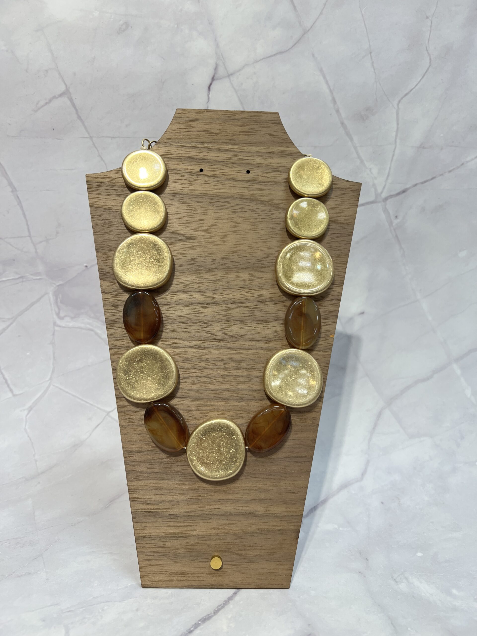 - Contraste de materiales: Combina el resplandor metálico del oro con la profundidad cálida de las cuentas ovaladas en tonos ámbar translúcidos.