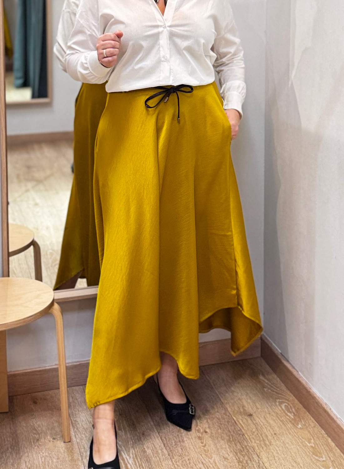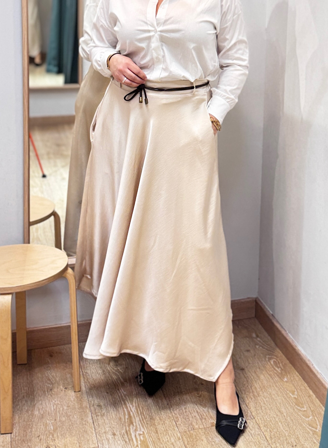 La **FALDA SATINADA LARGA** es la pieza clave para un estilo chic y contemporáneo. Su tejido satinado de alta calidad ofrece un brillo sutil y una caída espectacular que se adapta a cada movimiento. Con un corte midi o largo, presenta un bajo asimétrico que añade un toque de originalidad y sofisticación, creando una silueta fluida y favorecedora. La cintura ajustable mediante una elegante lazada garantiza un ajuste perfecto y cómodo.