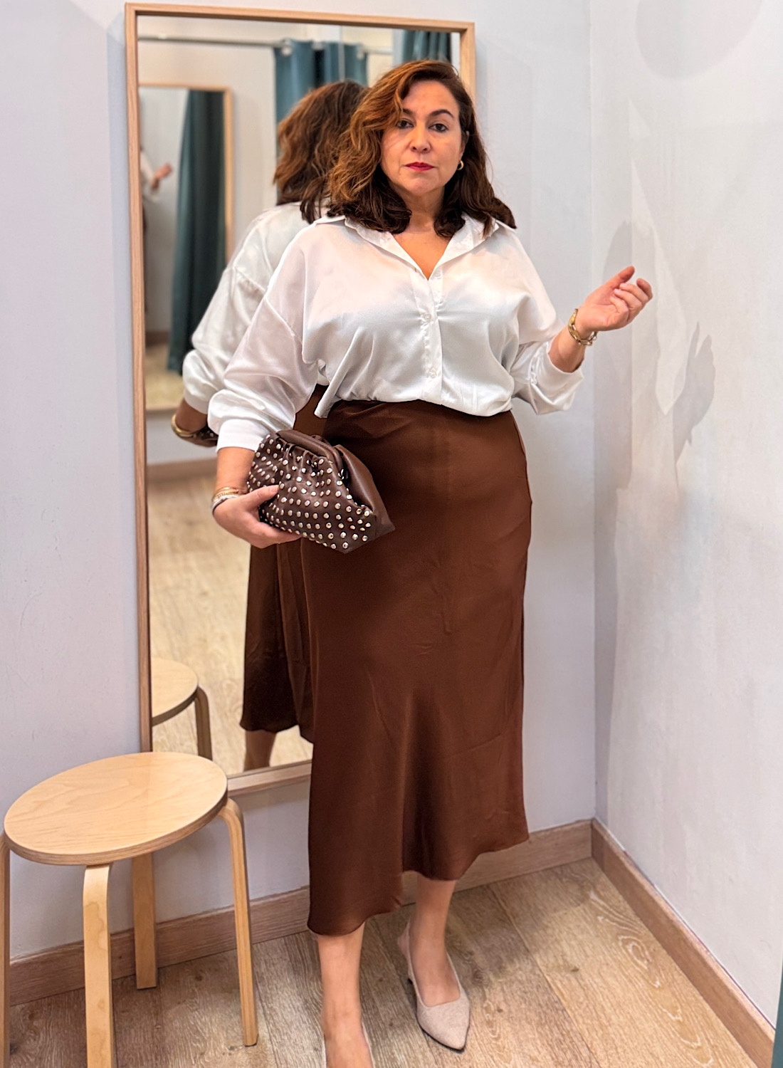 Sumérgete en el lujo discreto de nuestra exclusiva FALDA SATINADA, una pieza fundamental que combina a la perfección estilo, confort y versatilidad. Ideal para la mujer contemporánea, esta falda de corte midi destaca por su caída impecable y el brillo sutil de su tejido satinado negro, que añade un toque de sofisticación a cualquier armario.
