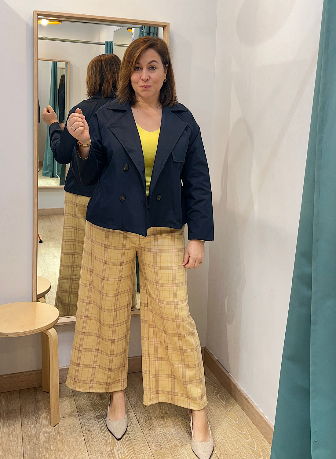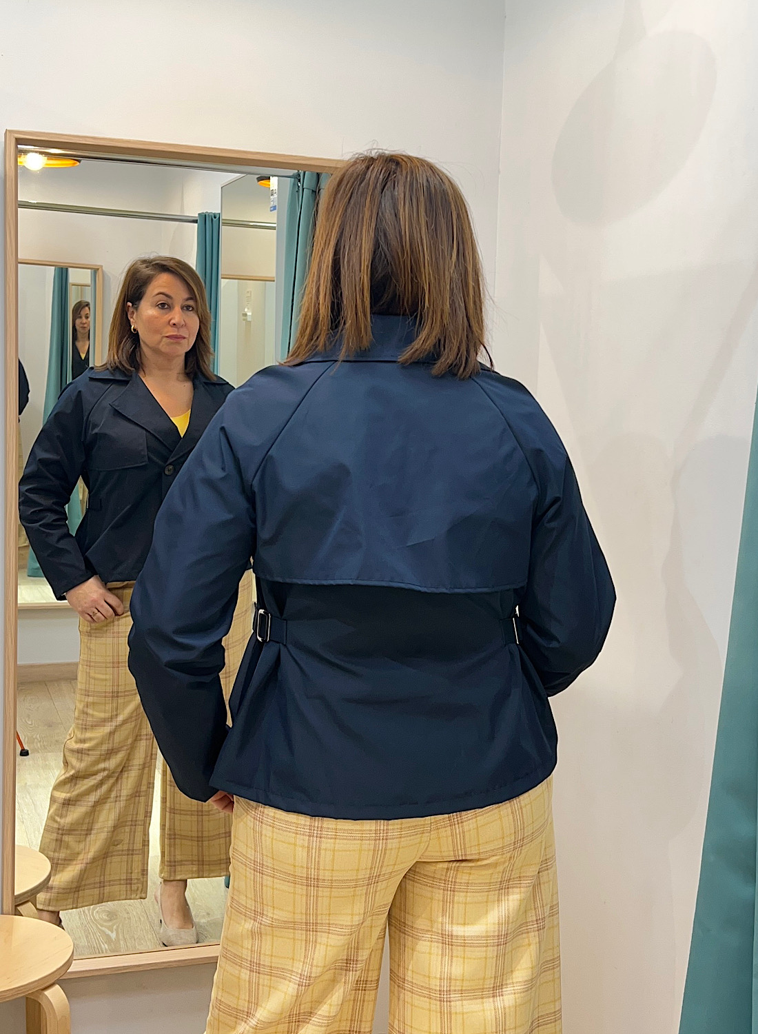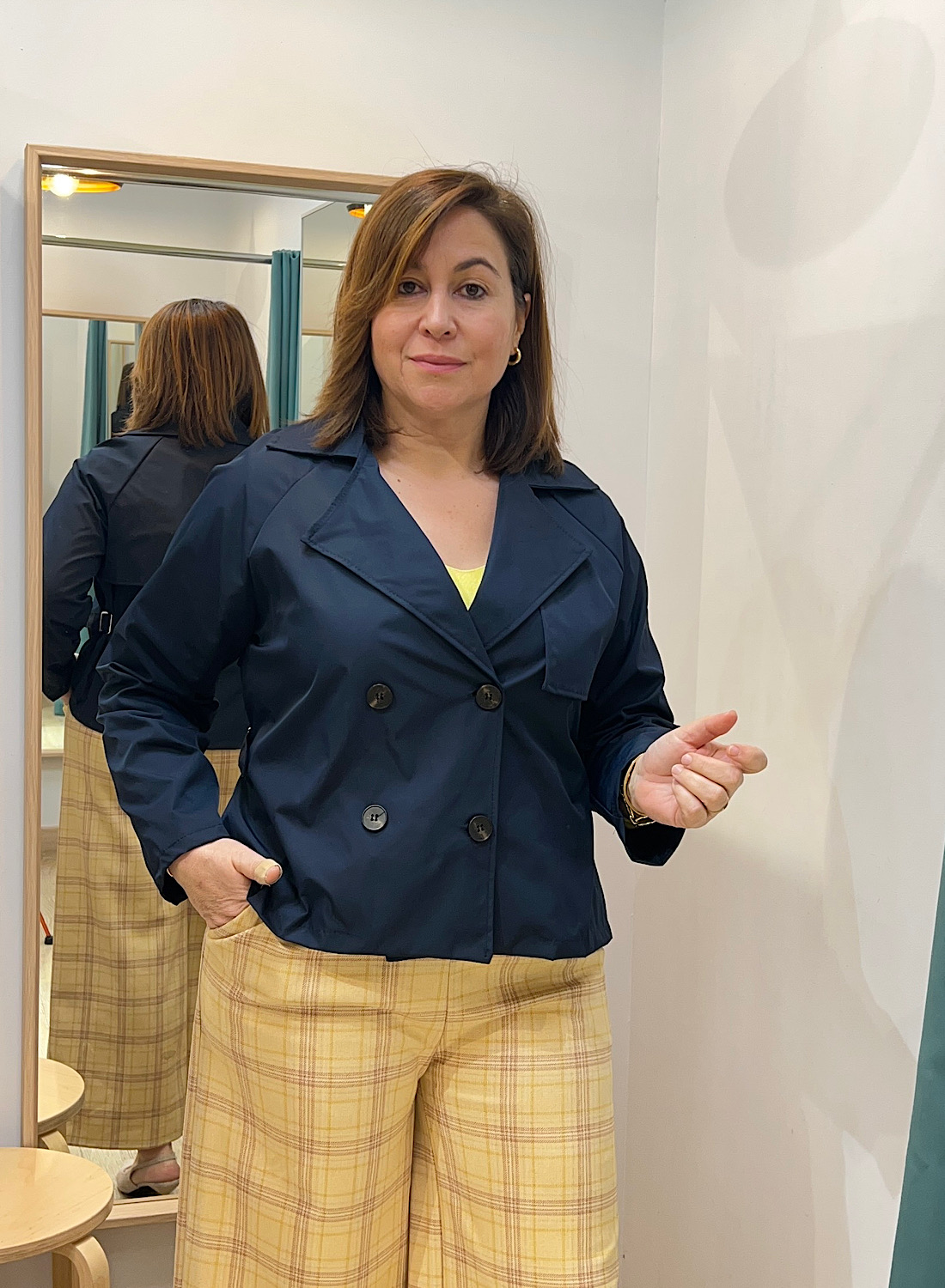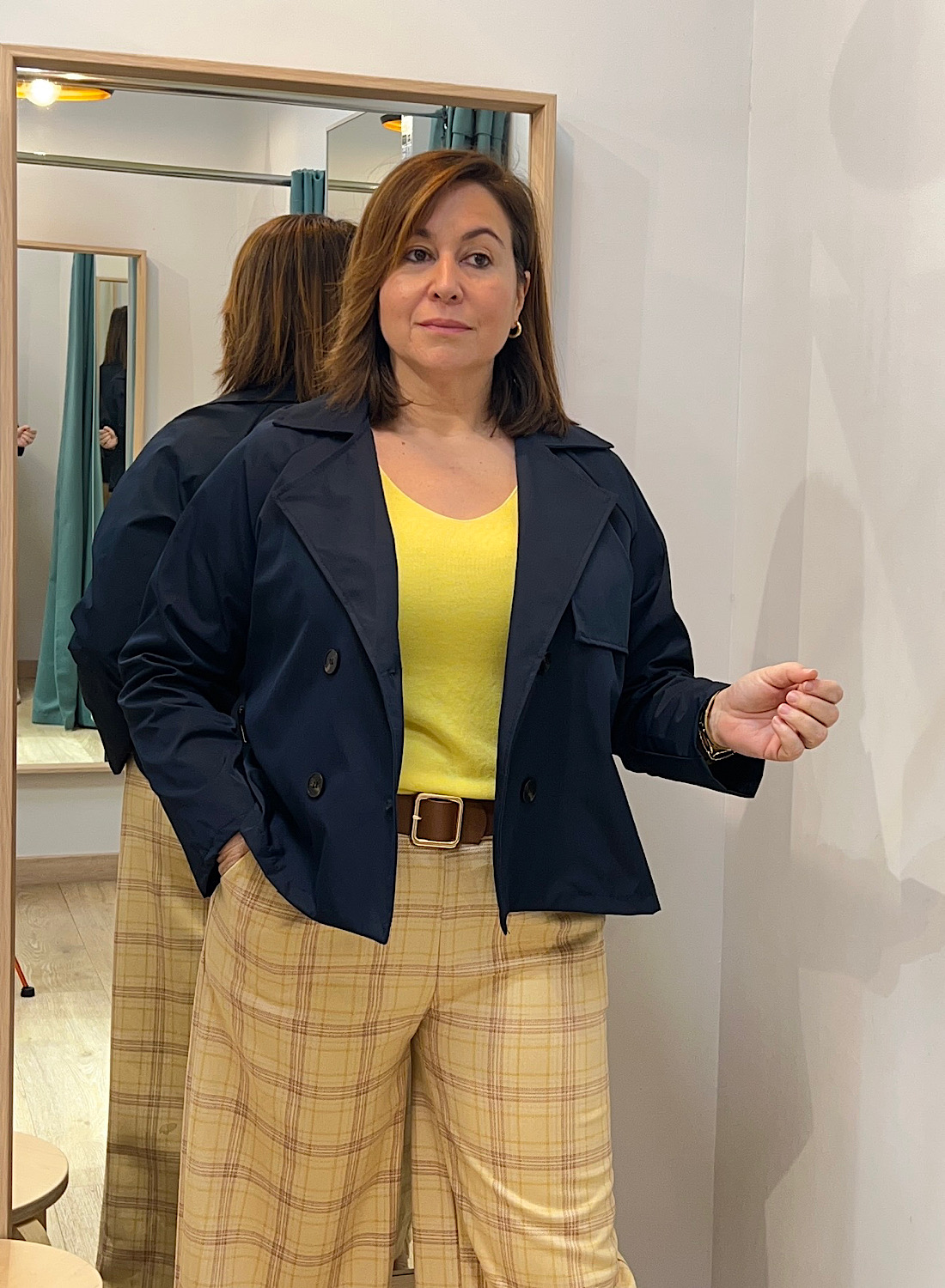 La GABARDINA LINET redefine el clásico abrigo con un diseño corto y contemporáneo, ideal para la mujer actual. Su elegante color azul marino la convierte en una prenda versátil, fácil de combinar con diferentes paletas de colores y estilos. Presenta un sofisticado diseño cruzado de doble botonadura que aporta un toque de distinción y un cuello amplio de solapa que enmarca el rostro con elegancia.