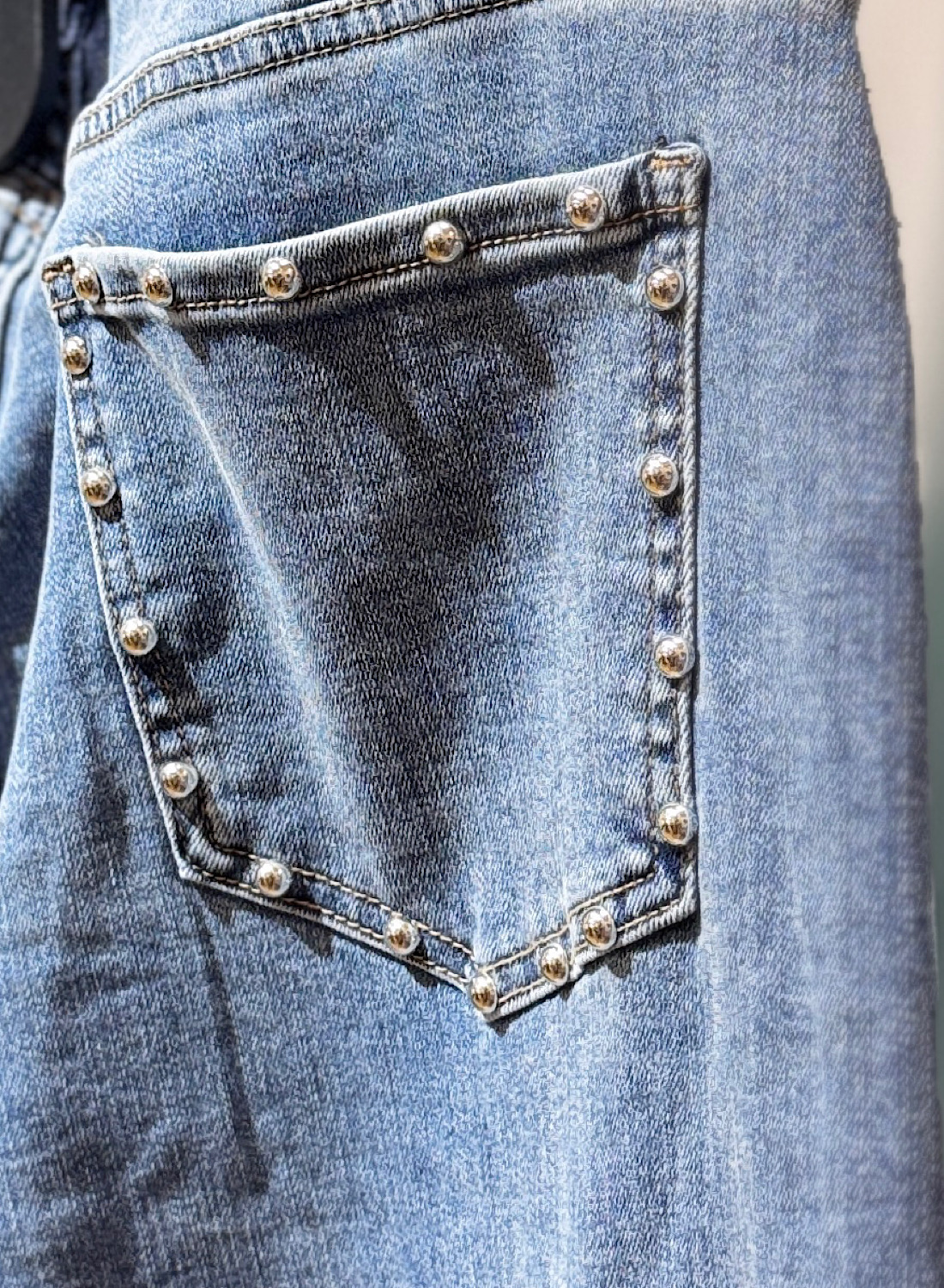 • Bolsillos con personalidad: Los bolsillos traseros están adornados con tachuelas plateadas, complementando el diseño general y ofreciendo un detalle extra de sofisticación.