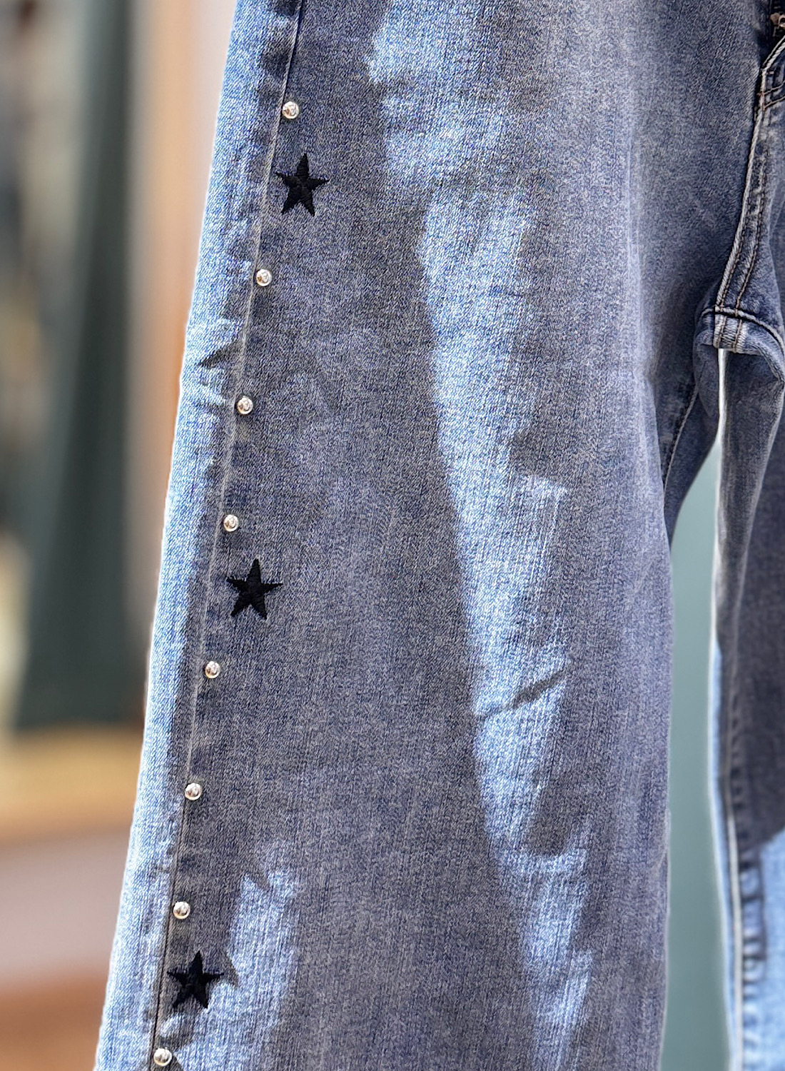 Descubre los JEANS ESTELA, un pantalón de denim azul claro de pierna recta. Su diseño destaca con tachuelas plateadas y estrellas negras en las costuras laterales, y tachuelas decorativas en los bolsillos traseros. Un toque distintivo y moderno para cualquier ocasión casual.