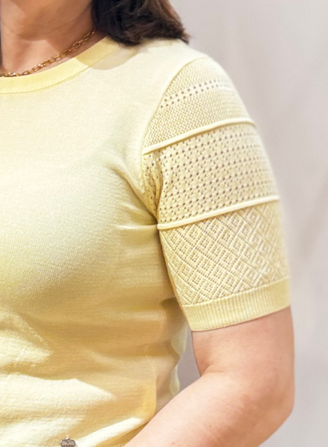 El JERSEY ALIZA presenta un elegante cuello redondo y mangas cortas que incorporan detalles calados con patrones geométricos sutiles, añadiendo una textura distintiva y un toque de originalidad. El bajo y los puños acanalados garantizan un ajuste óptimo y una silueta favorecedora. Disponible en tonalidades suaves y fáciles de combinar, este jersey es una pieza clave para crear looks tanto casuales como más arreglados.