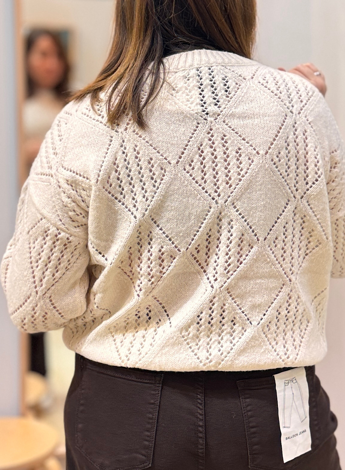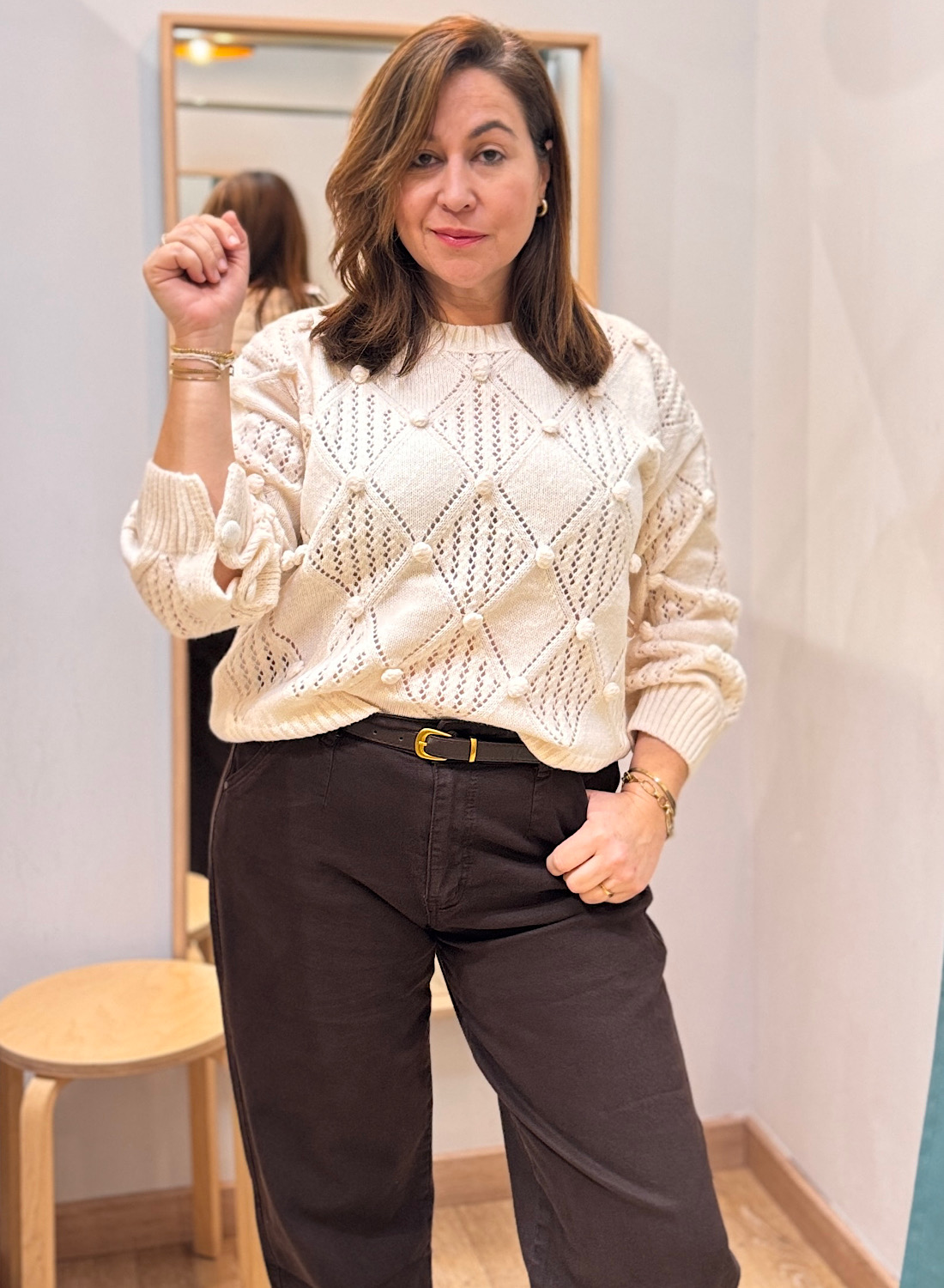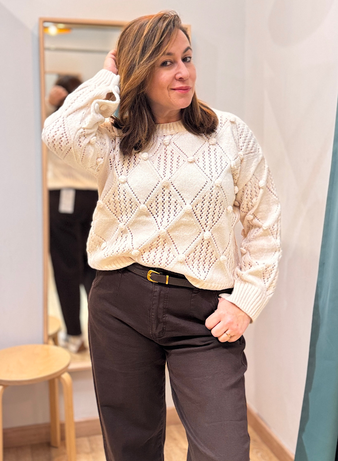 El JERSEY CLAUDIA es la pieza perfecta para quienes buscan combinar originalidad y comodidad en su vestuario. Con su atractivo tono crema, este jersey de punto destaca por un diseño calado intrincado que forma rombos y ochos, enriquecido con delicados detalles de pompones que le confieren una textura tridimensional y un encanto especial.