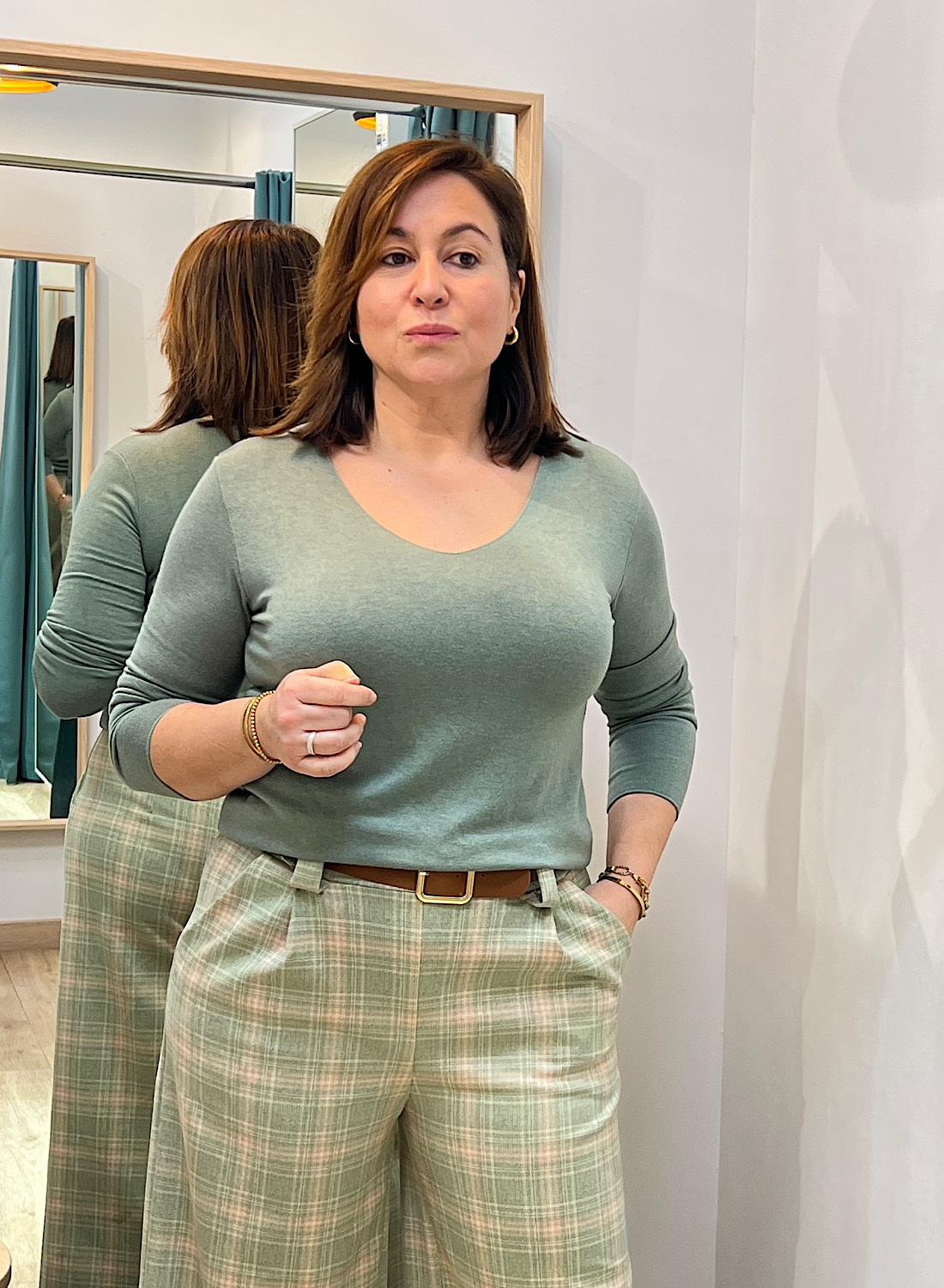 Su diseño minimalista pero sofisticado se adapta maravillosamente a diversas siluetas, tal como se aprecia en las imágenes. El favorecedor escote en V realza sutilmente el cuello, mientras que sus mangas largas brindan la cobertura perfecta. Su ajuste cómodo y la caída suave del tejido al cuerpo garantizan una apariencia pulcra y moderna, ideal para cualquier ocasión.