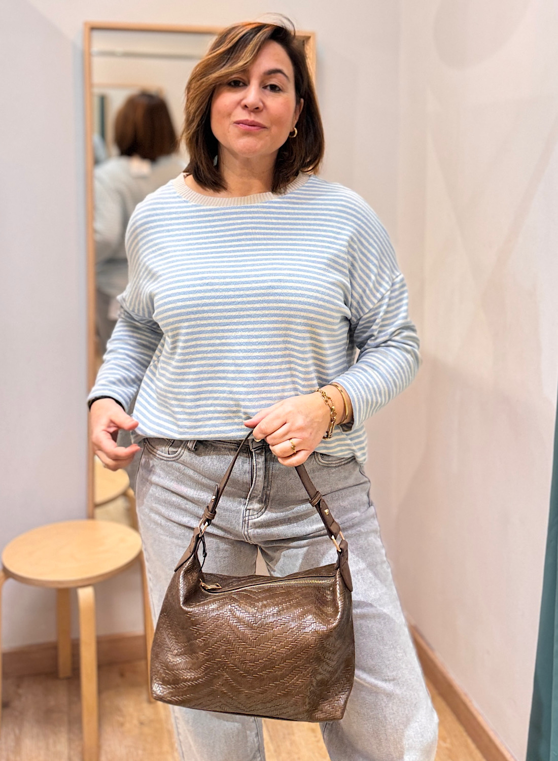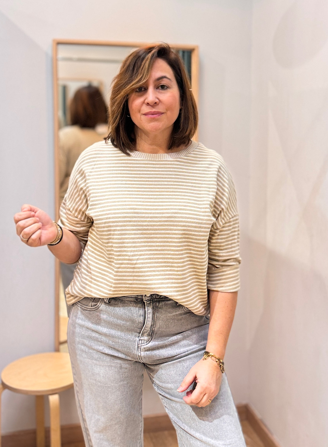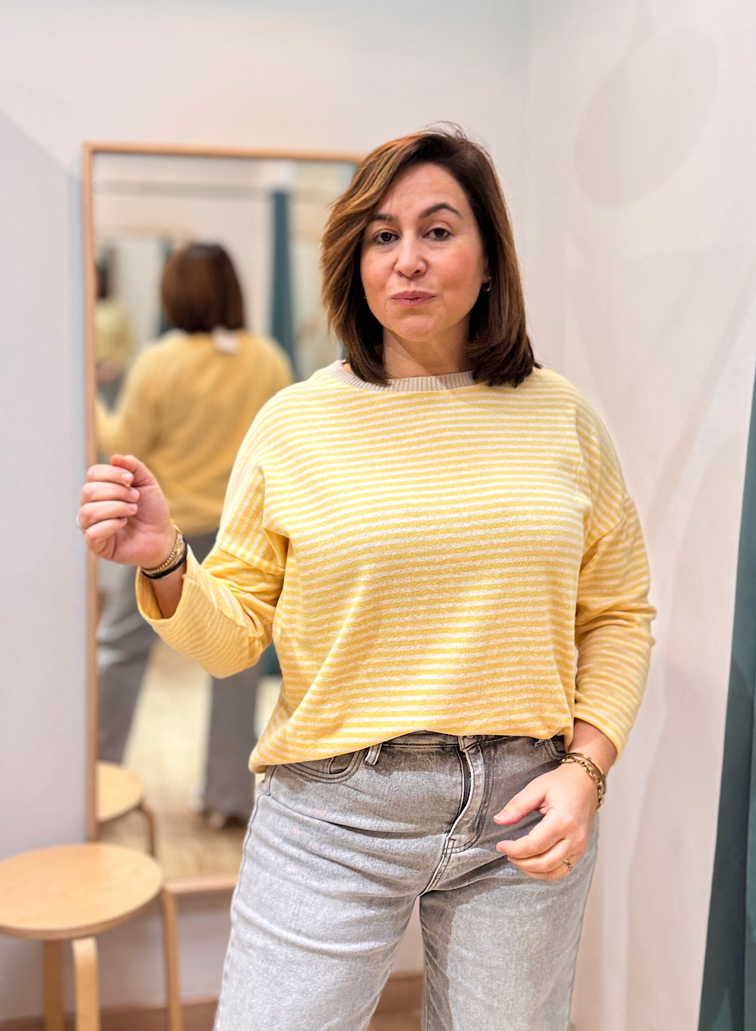 Este jersey presenta un atractivo patrón de rayas horizontales que nunca pasa de moda, disponible en una gama de colores suaves y combinables. Su cuello redondo y manga larga (que puedes llevar remangada con facilidad) aportan un toque clásico y relajado. La silueta holgada y suelta asegura un confort excepcional y una gran libertad de movimiento, adaptándose a diversas morfologías con elegancia.