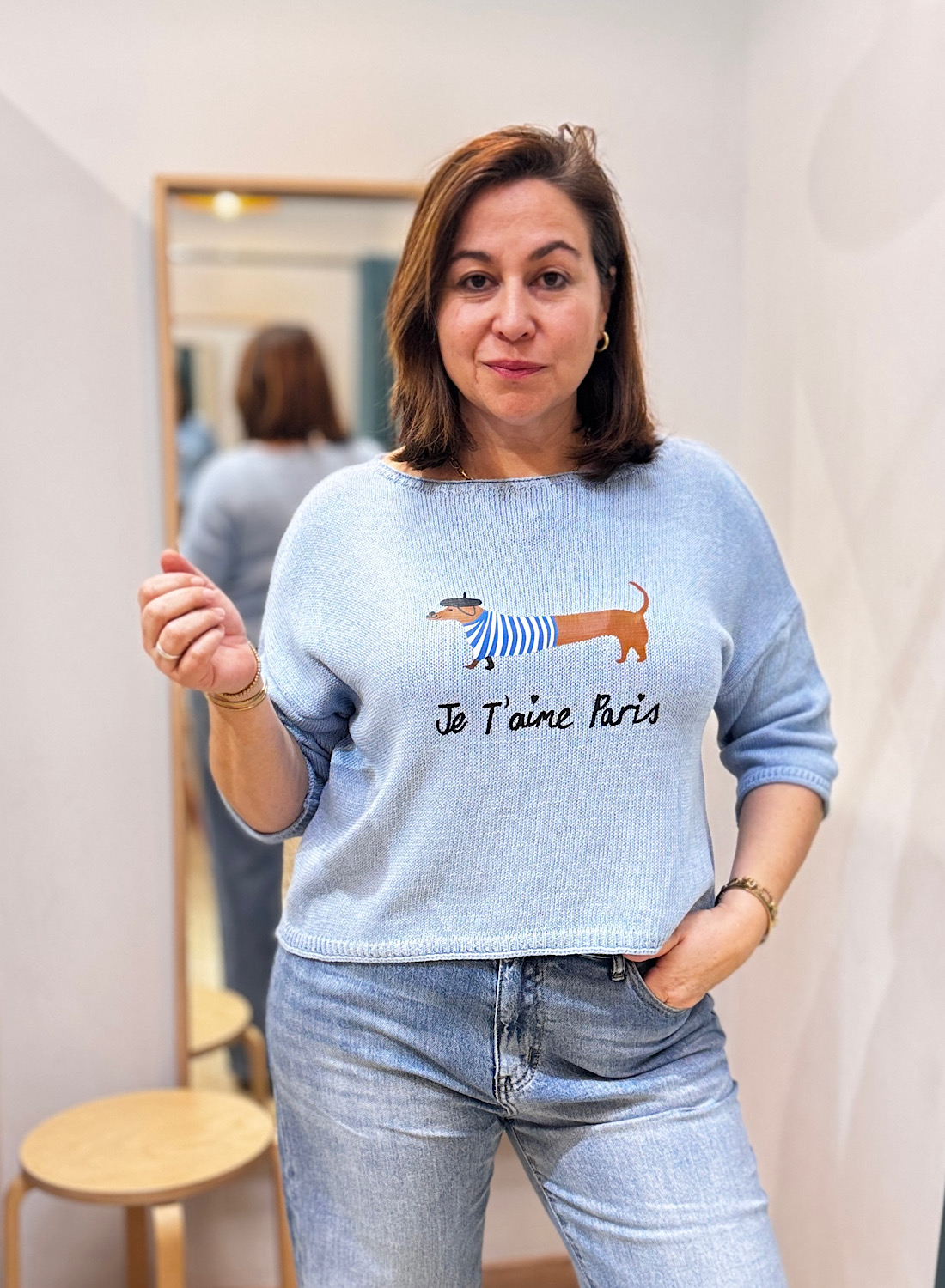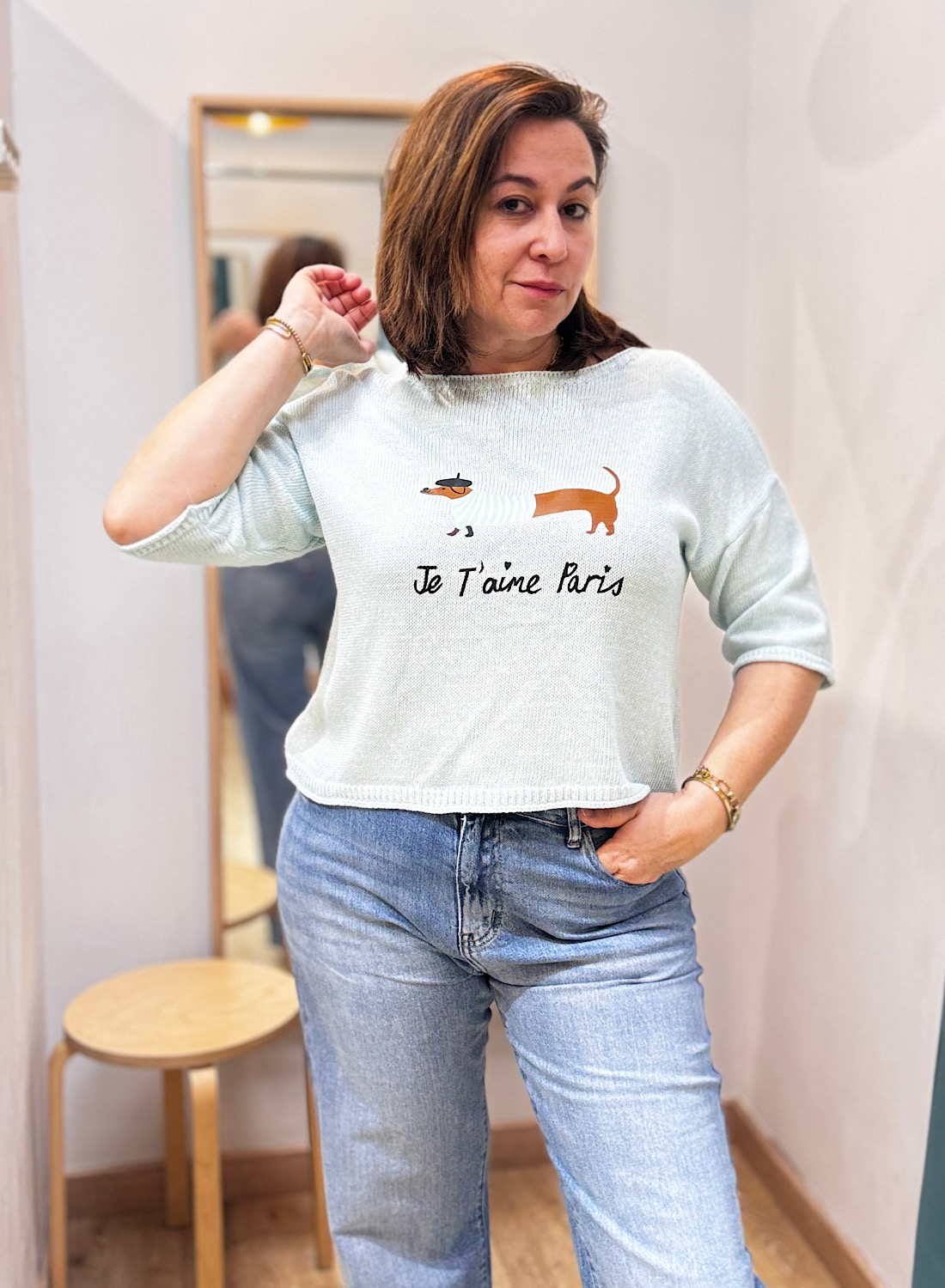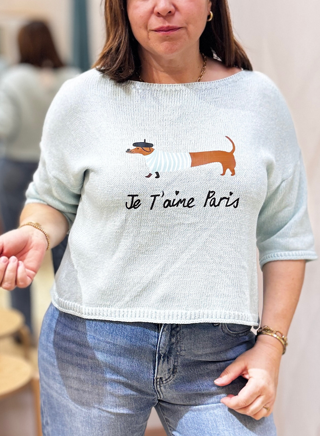 El protagonista indiscutible de este jersey es su divertido estampado central: un adorable perro salchicha ataviado con una boina francesa y una camiseta de rayas, acompañado de la romántica frase “Je t’aime Paris”. Disponible en varios colores suaves, como el azul claro y el beige, que realzan el diseño. Su corte holgado y el escote tipo barco ofrecen un ajuste relajado y moderno, mientras que las mangas de tres cuartos le dan un toque ligero y versátil.