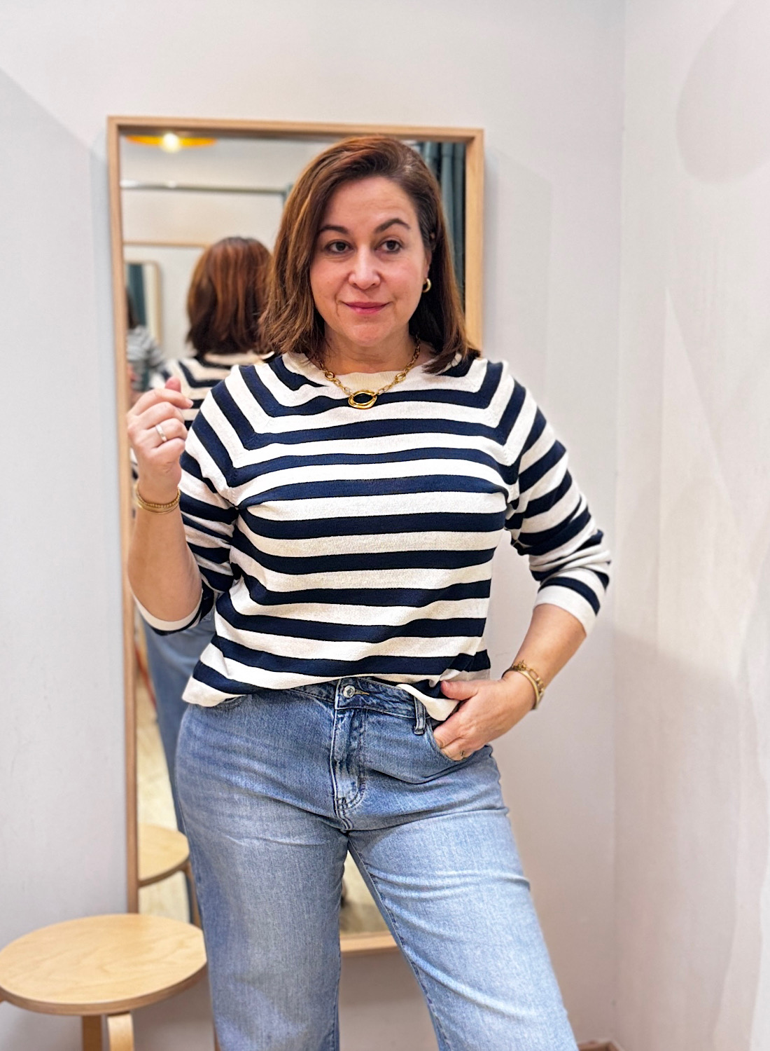 El JERSEY KALA es la pieza clave para construir un armario versátil y lleno de estilo. Este elegante jersey presenta un clásico patrón de rayas horizontales en una sofisticada combinación de azul marino y blanco roto. Su cuello redondo y el corte recto ofrecen una silueta cómoda y favorecedora, ideal para el uso diario. La manga tres cuartos proporciona un ajuste relajado y adecuado para diversas estaciones del año.