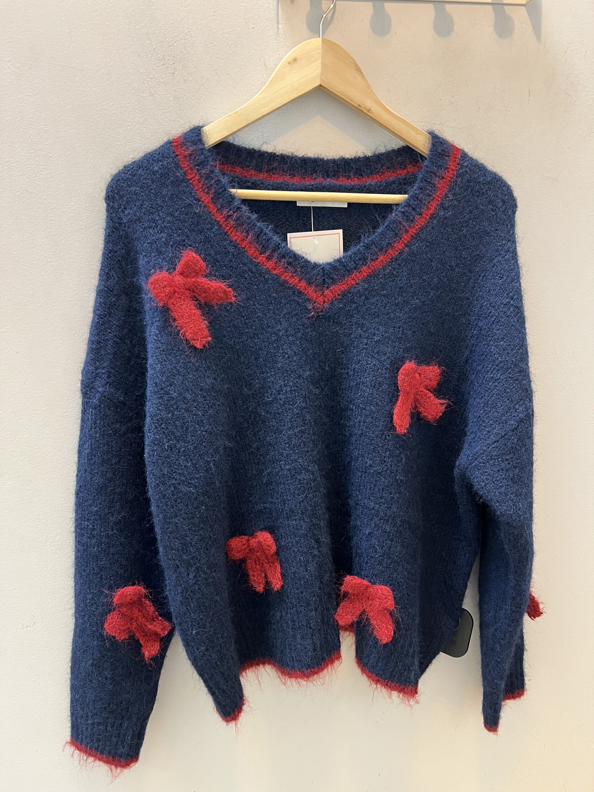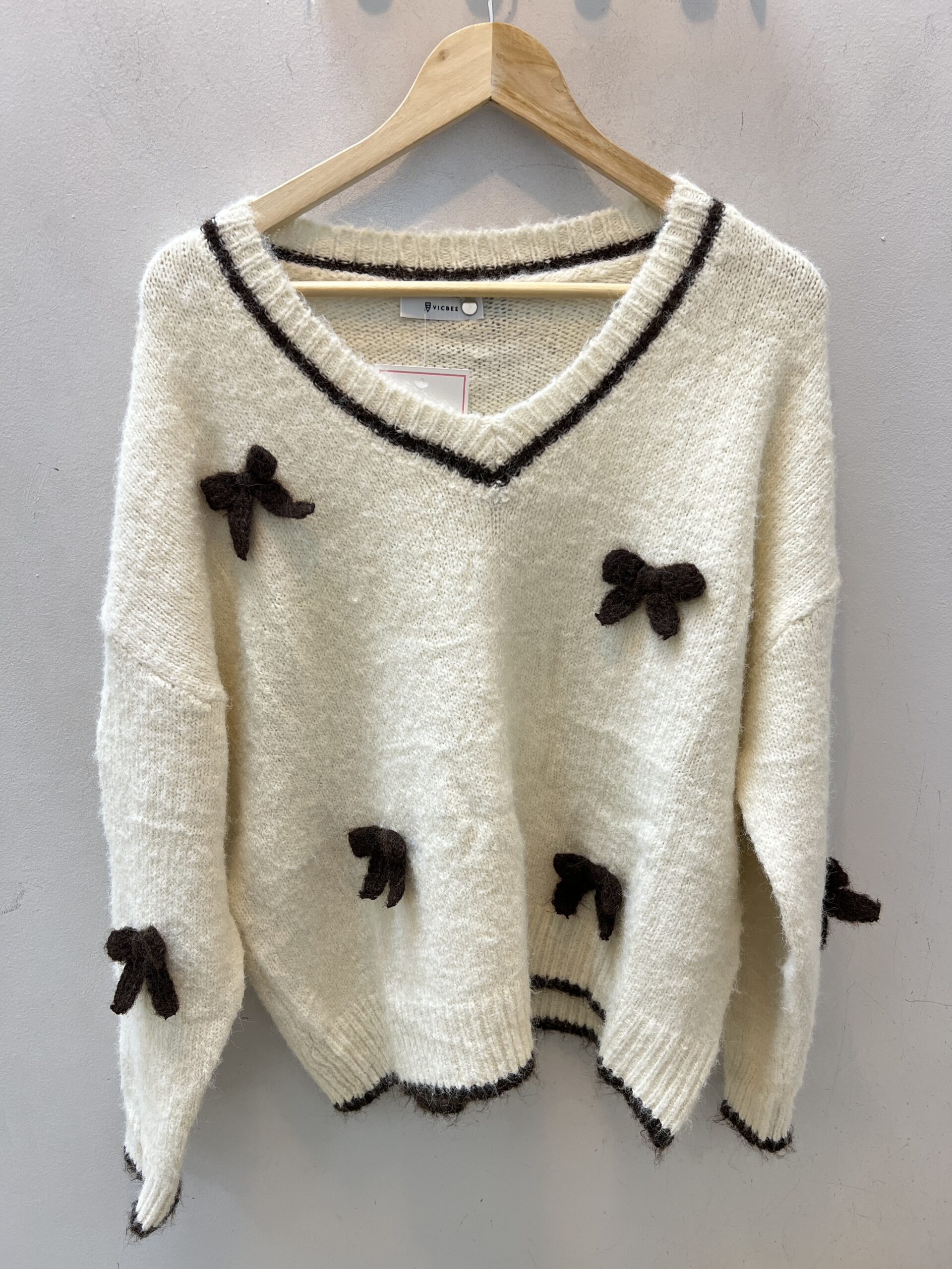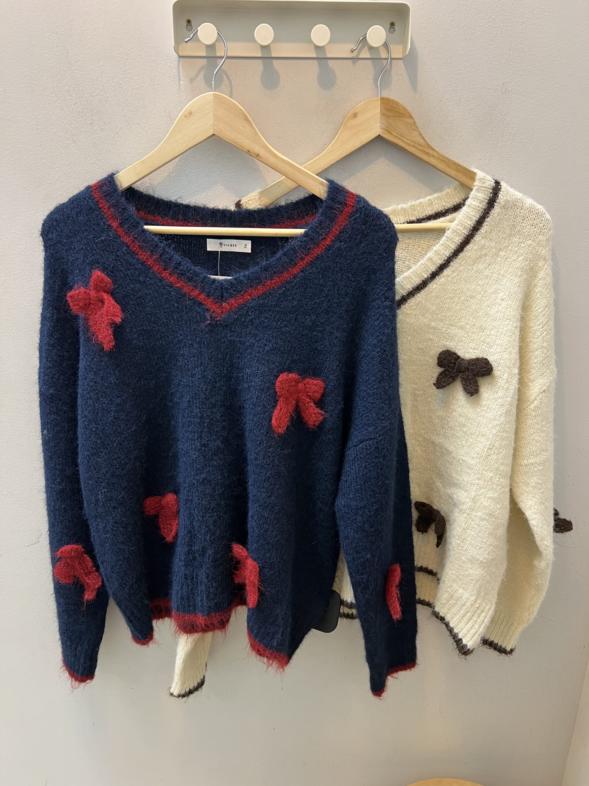 El JERSEY LACITOS presenta un favorecedor cuello en pico, realzado por un ribete que contrasta sutilmente con el color principal del tejido. Lo más destacable son los pequeños lazos tridimensionales, distribuidos armoniosamente por toda la prenda y en las mangas, que le confieren su nombre y un aire femenino y coqueto. Está disponible en dos combinaciones de color cautivadoras: un elegante azul marino con ribetes y lazos rojos, y un versátil tono crema con ribetes y lazos en marrón oscuro.