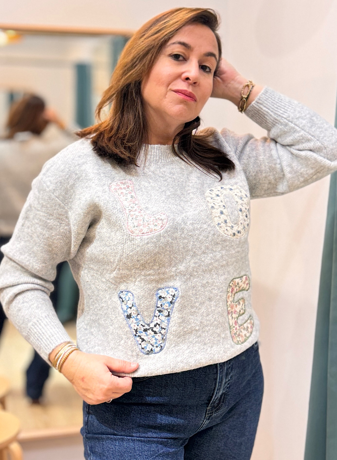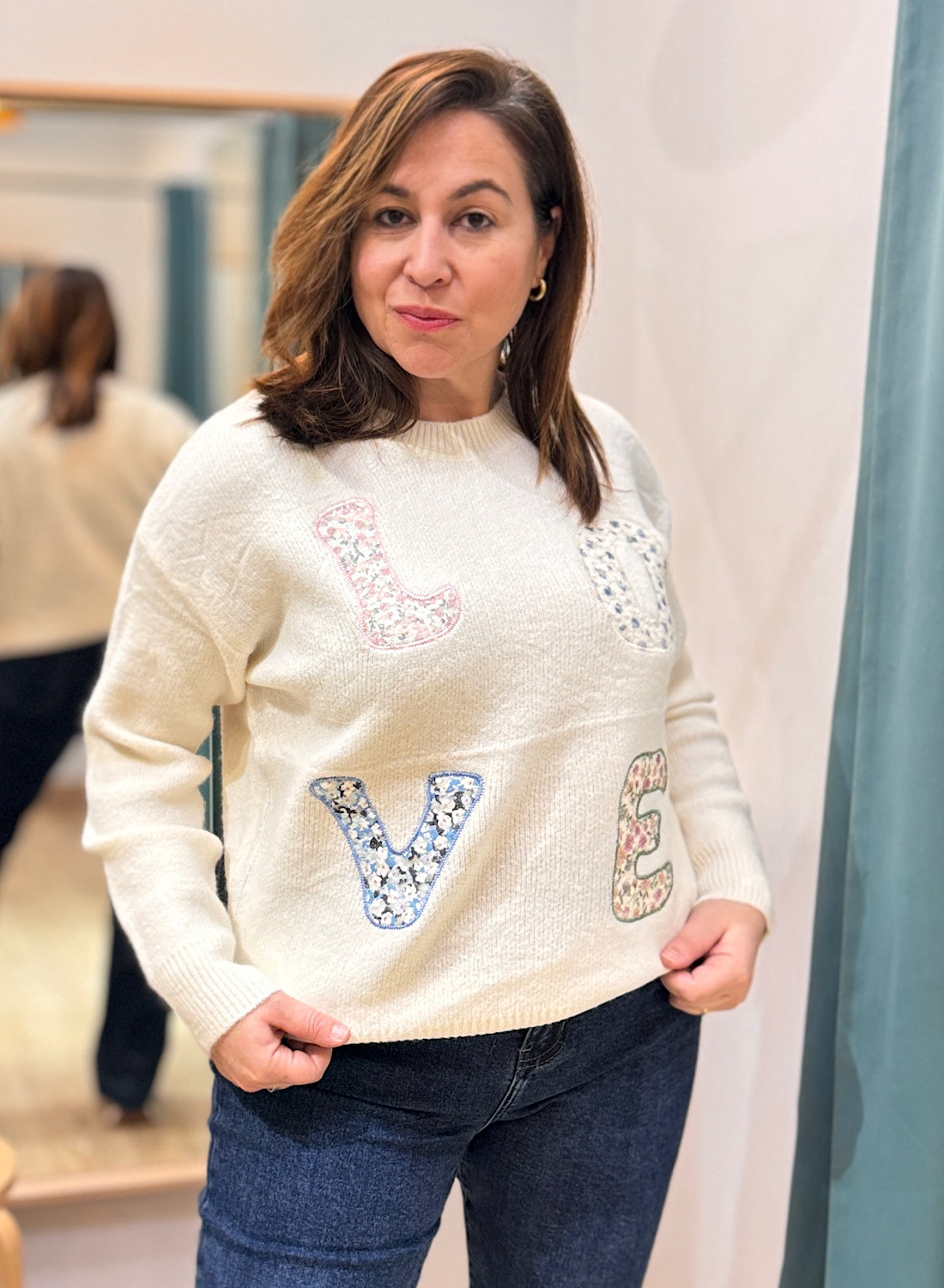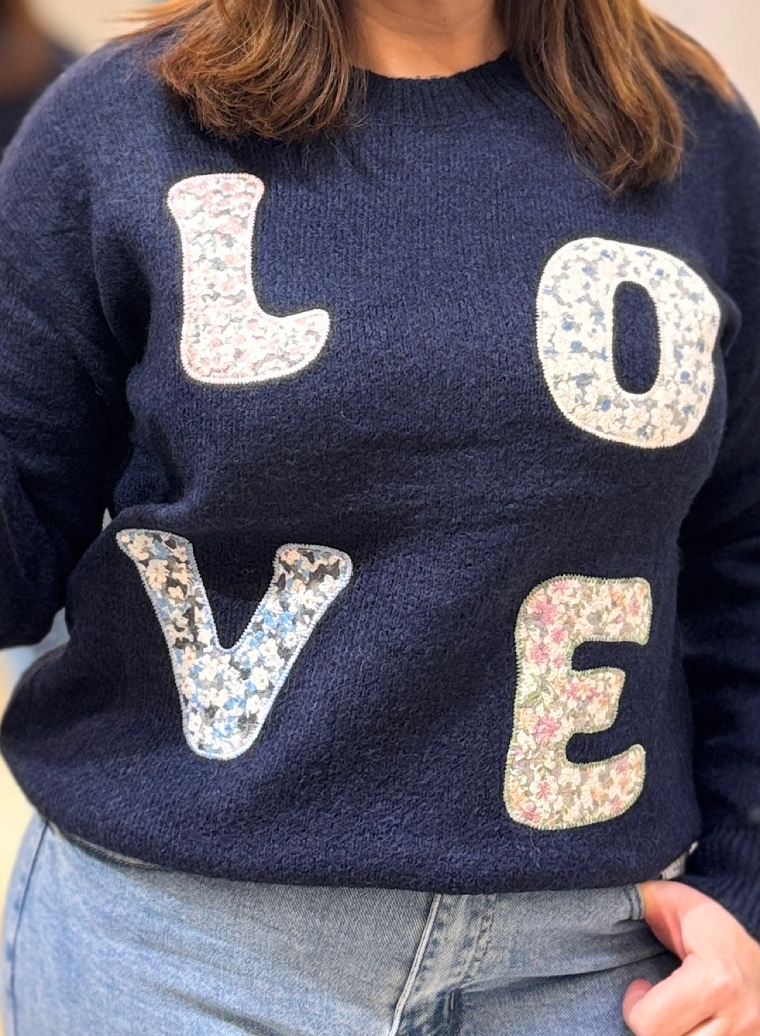 El JERSEY LOVE se distingue por su cuello redondo clásico y sus mangas largas, confeccionado en un suave punto que garantiza confort durante todo el día. El elemento central y más llamativo son las cuatro letras “LOVE” que adornan la parte frontal, cada una de ellas creada con parches de tela con motivos florales. Esta combinación de texturas y patrones añade un aire bohemio y romántico a la prenda, haciendo que cada jersey sea sutilmente diferente.