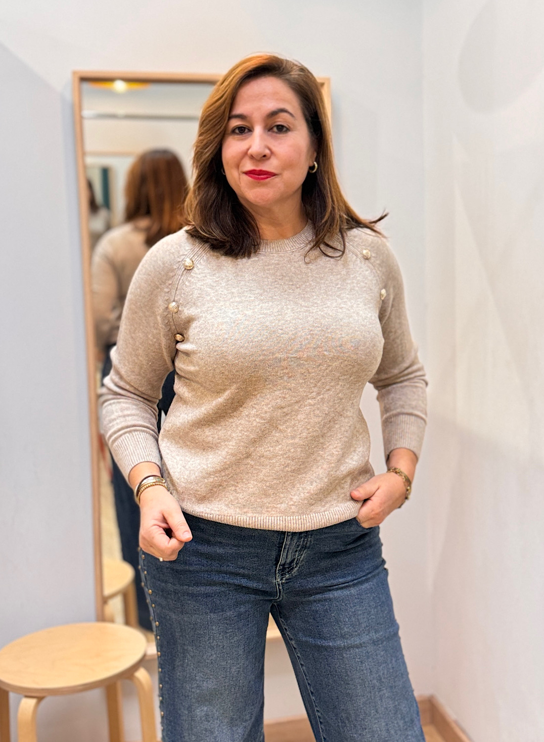 - Detalles sofisticados: Los distintivos botones dorados, estratégicamente ubicados en los hombros, confieren un acento chic y contemporáneo, elevando el diseño clásico de la prenda y aportando un toque de distinción.