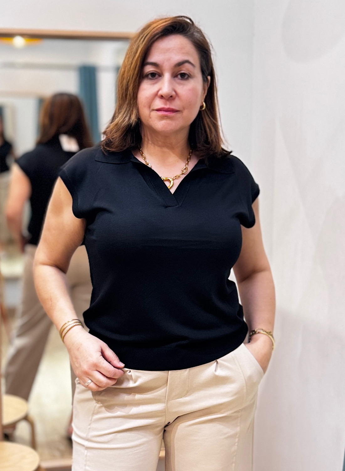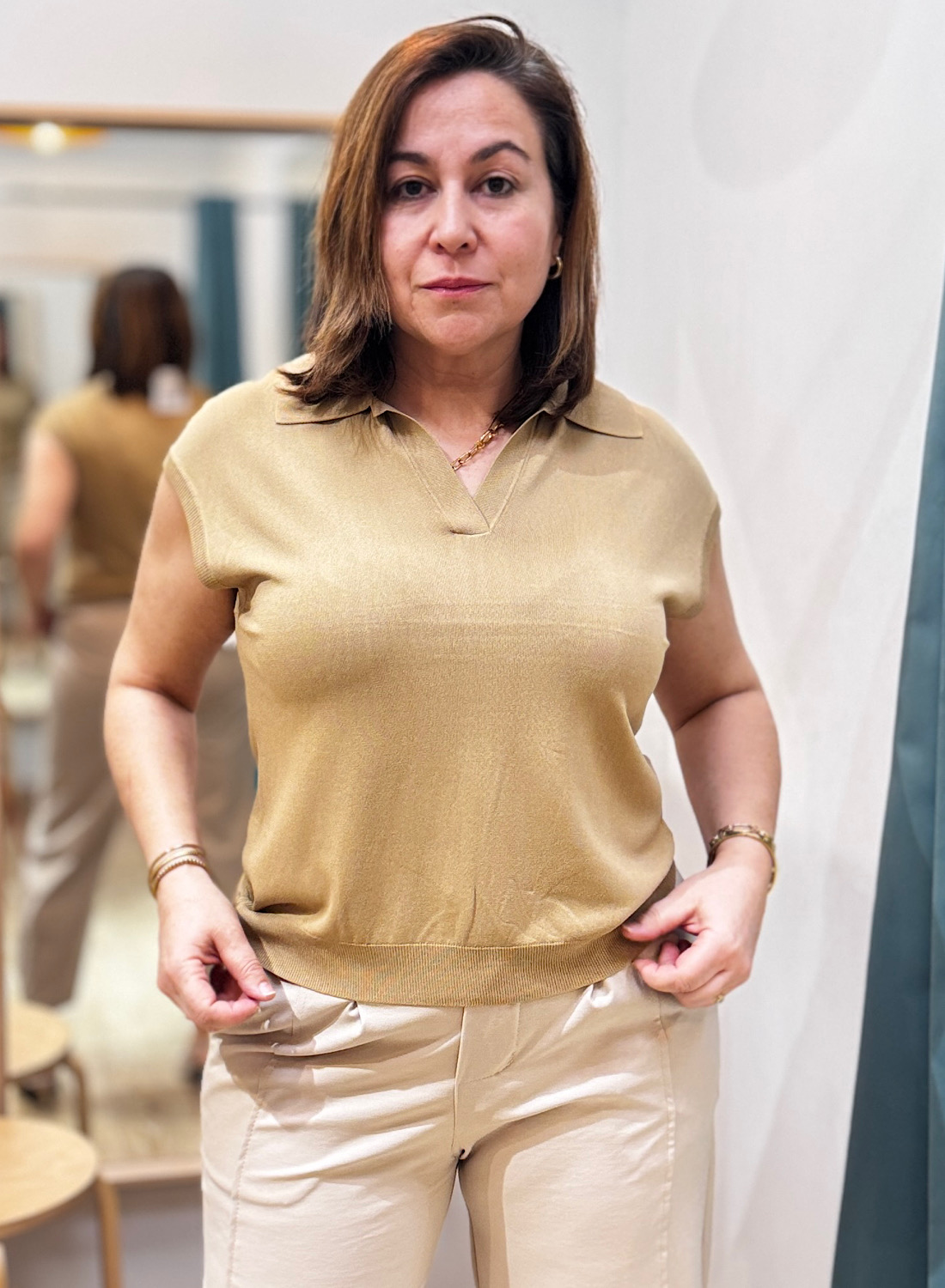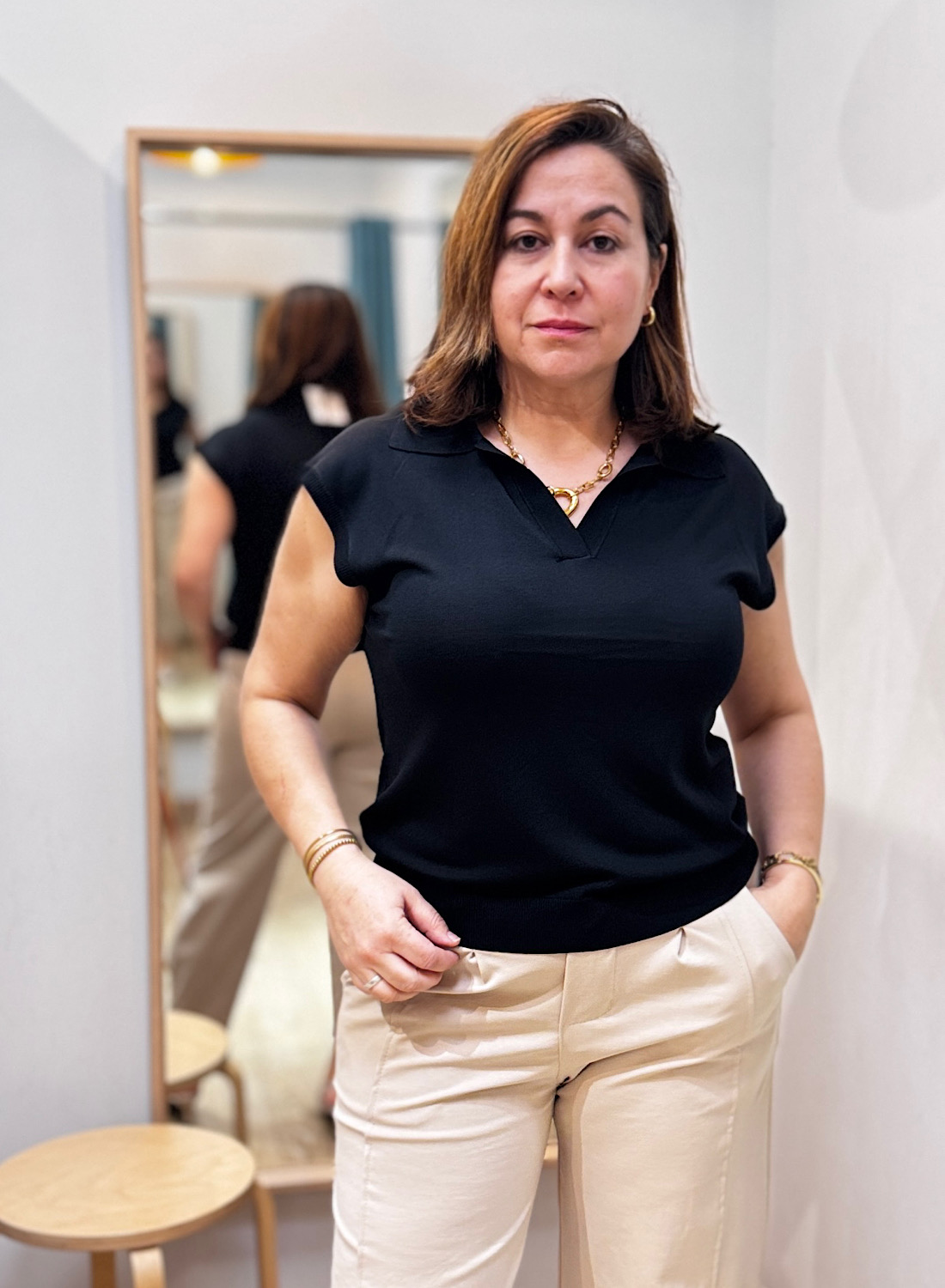 El JERSEY ZOE presenta un diseño depurado con un distinguido cuello estilo polo que se abre en un delicado escote en pico, añadiendo un aire refinado. Sus mangas cortas, ligeramente caídas, y el bajo acanalado proporcionan un ajuste favorecedor y una silueta pulcra. Disponible en una paleta de colores clásicos y actuales, es fácil de combinar con cualquier prenda de tu armario.
