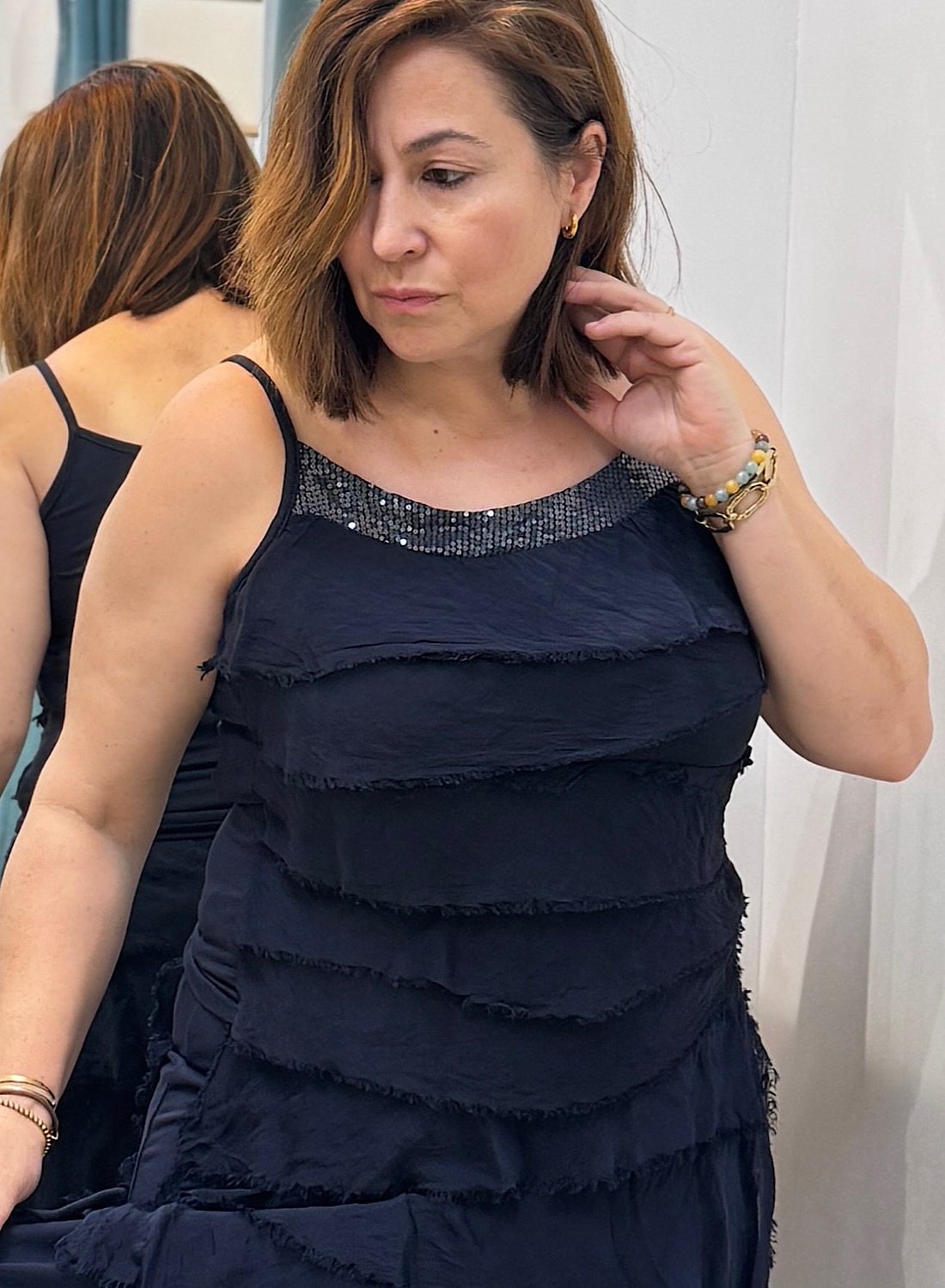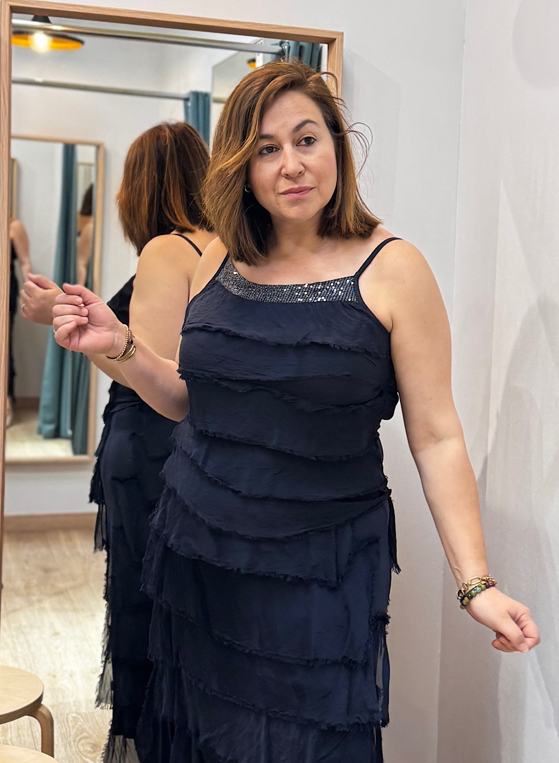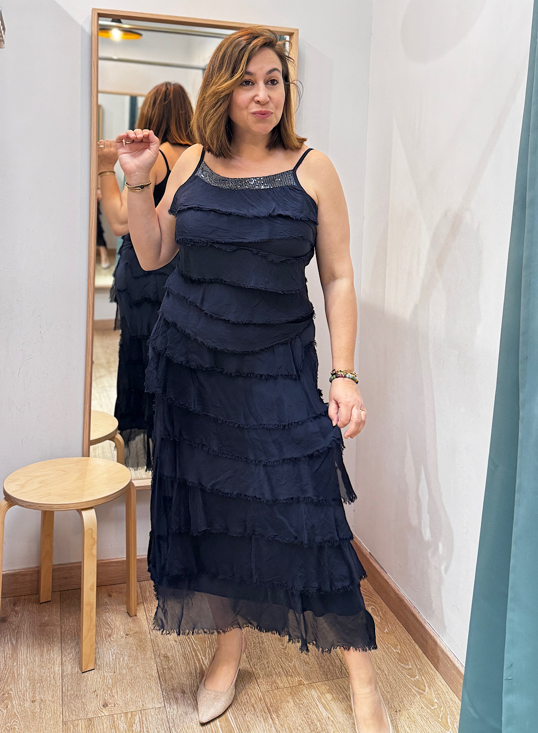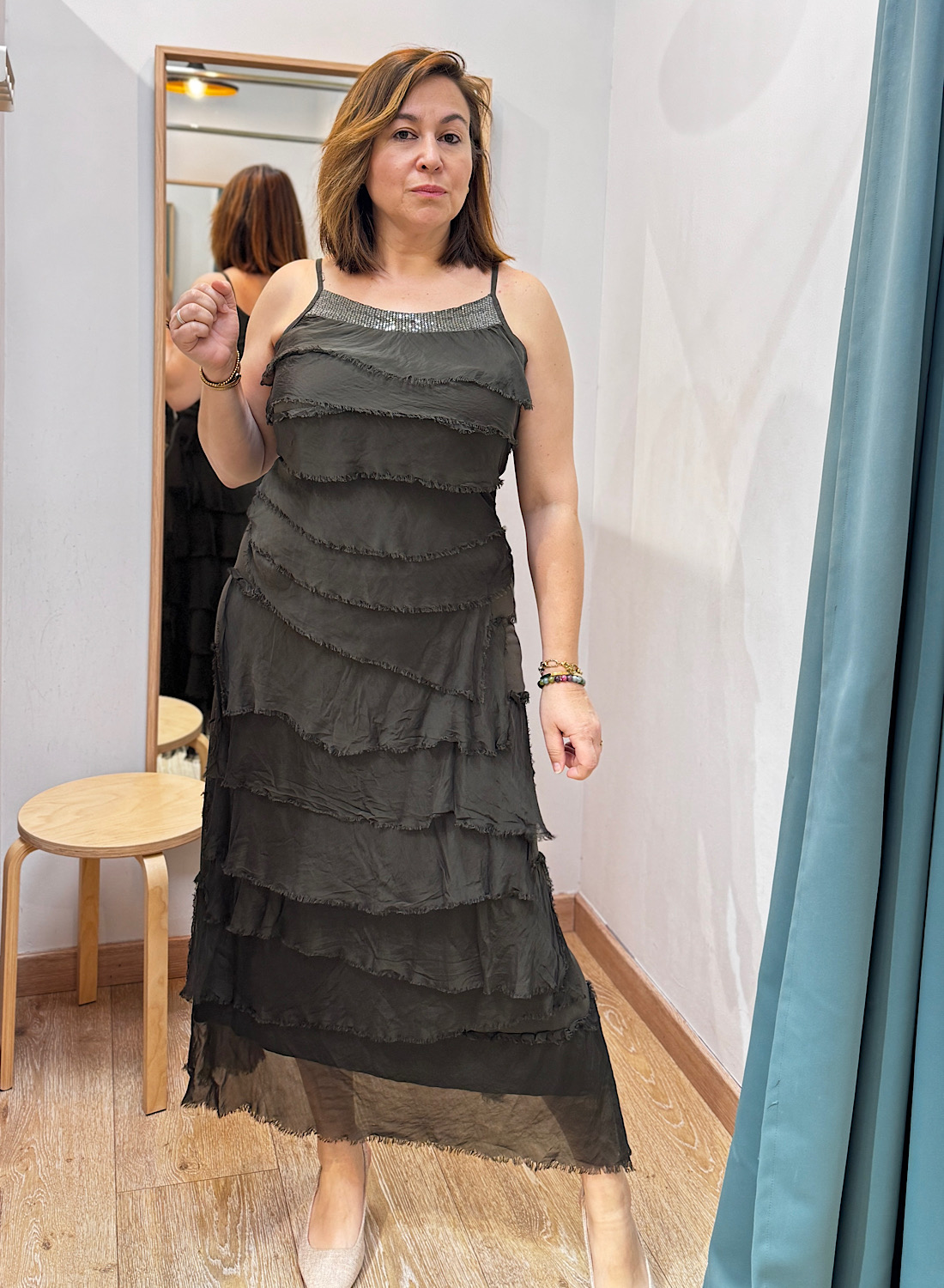 Inspirado en la lencería, este vestido de tirantes ofrece una silueta relajada y femenina. Los volantes, elaborados con un tejido ligero y semitransparente, crean un efecto etéreo. Su tono oscuro (verde militar o azul marino) y el detalle brillante en el escote facilitan su combinación con accesorios.