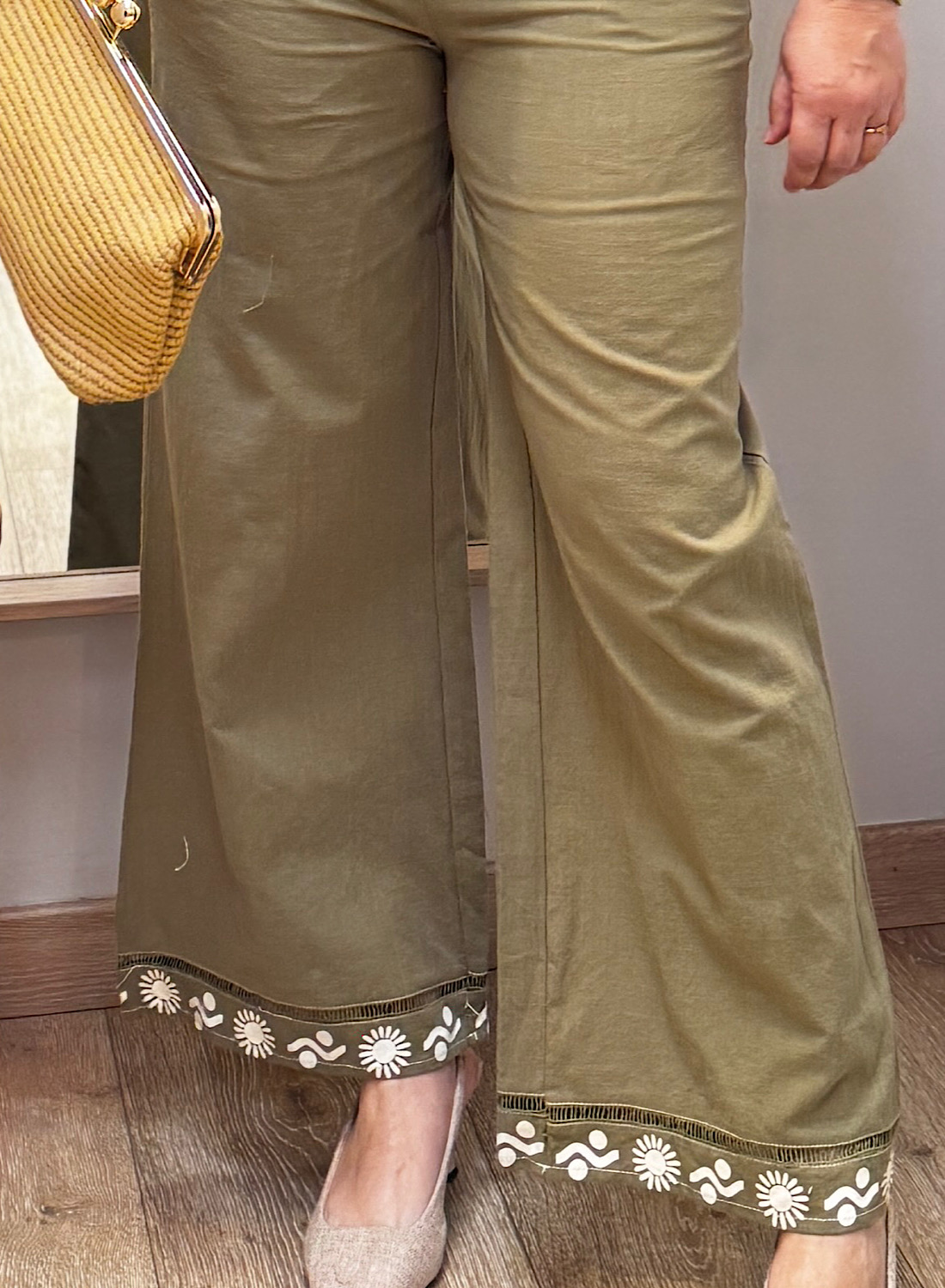 Descubre el equilibrio perfecto entre elegancia casual y comodidad con el PANTALÓN CALPE. Diseñado para la mujer moderna que valora el estilo sin sacrificar el bienestar, este pantalón de pata ancha se convertirá en un imprescindible en tu armario. Su sofisticado color caqui y los delicados detalles bordados lo hacen versátil para múltiples ocasiones, desde un paseo relajado hasta un evento con un toque chic.