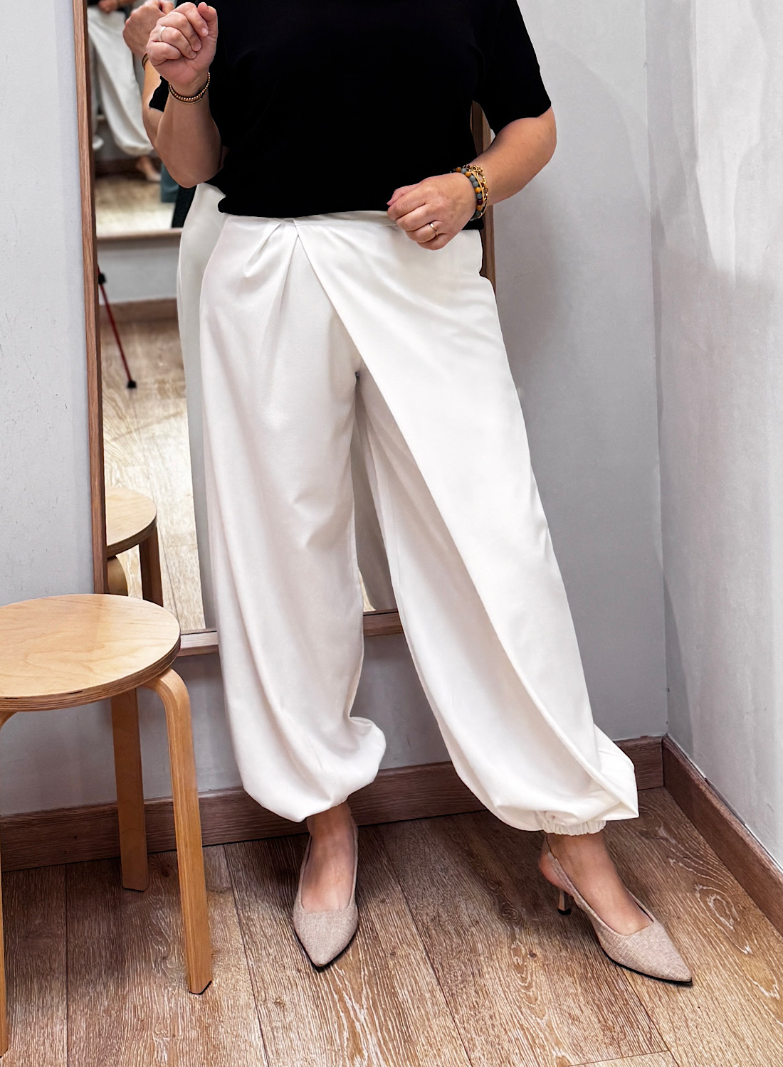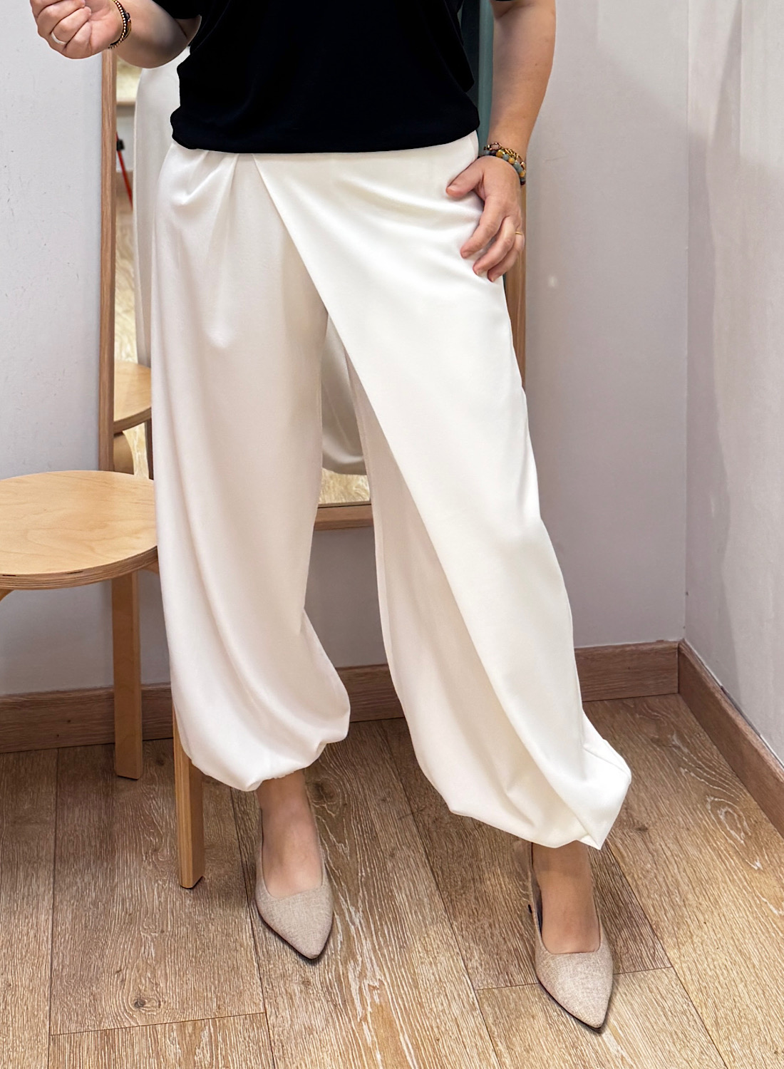 El PANTALÓN JULEN redefine la elegancia moderna con su corte innovador y silueta fluida. Confeccionado en un suave tejido en tono blanco cremoso, este pantalón presenta un diseño tipo sarouel con un original detalle cruzado en la parte frontal, creando una abertura asimétrica que añade un toque de sofisticación y originalidad. Las perneras anchas y el acabado elástico en los tobillos confieren un volumen sutil y una caída impecable, garantizando un look distinguido y contemporáneo.