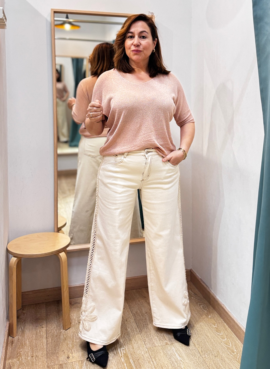- Detalles laterales de ganchillo: Sofisticadas inserciones de ganchillo calado recorren el lateral de cada pierna, añadiendo un toque de delicadeza y originalidad.