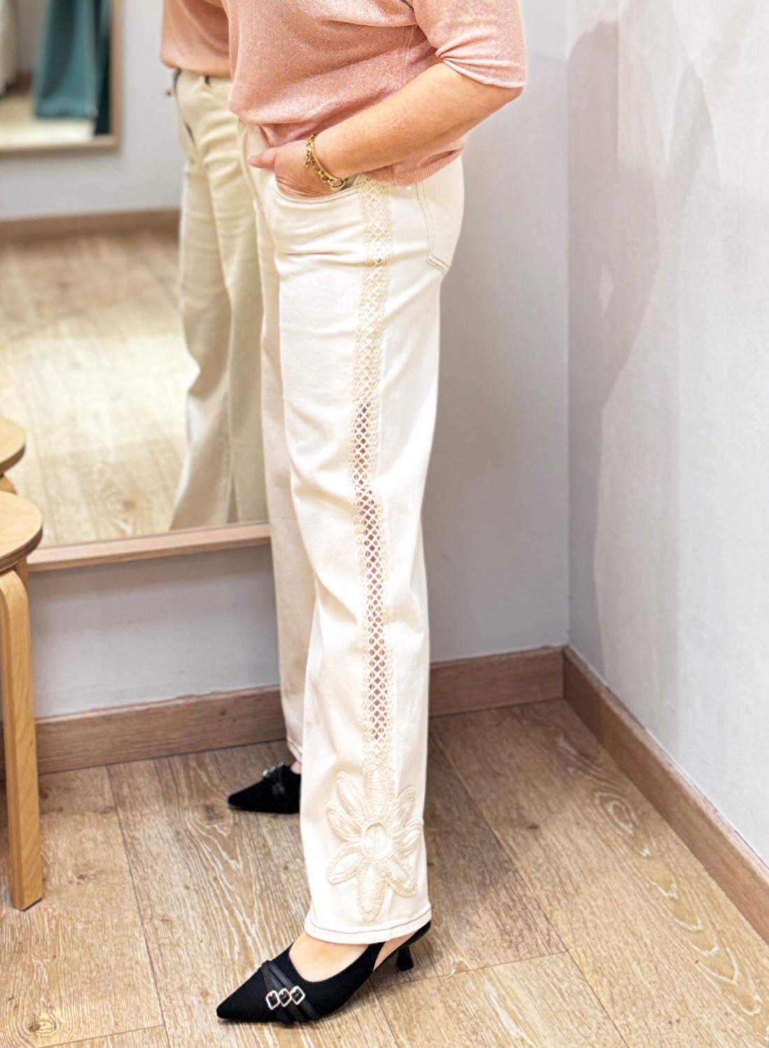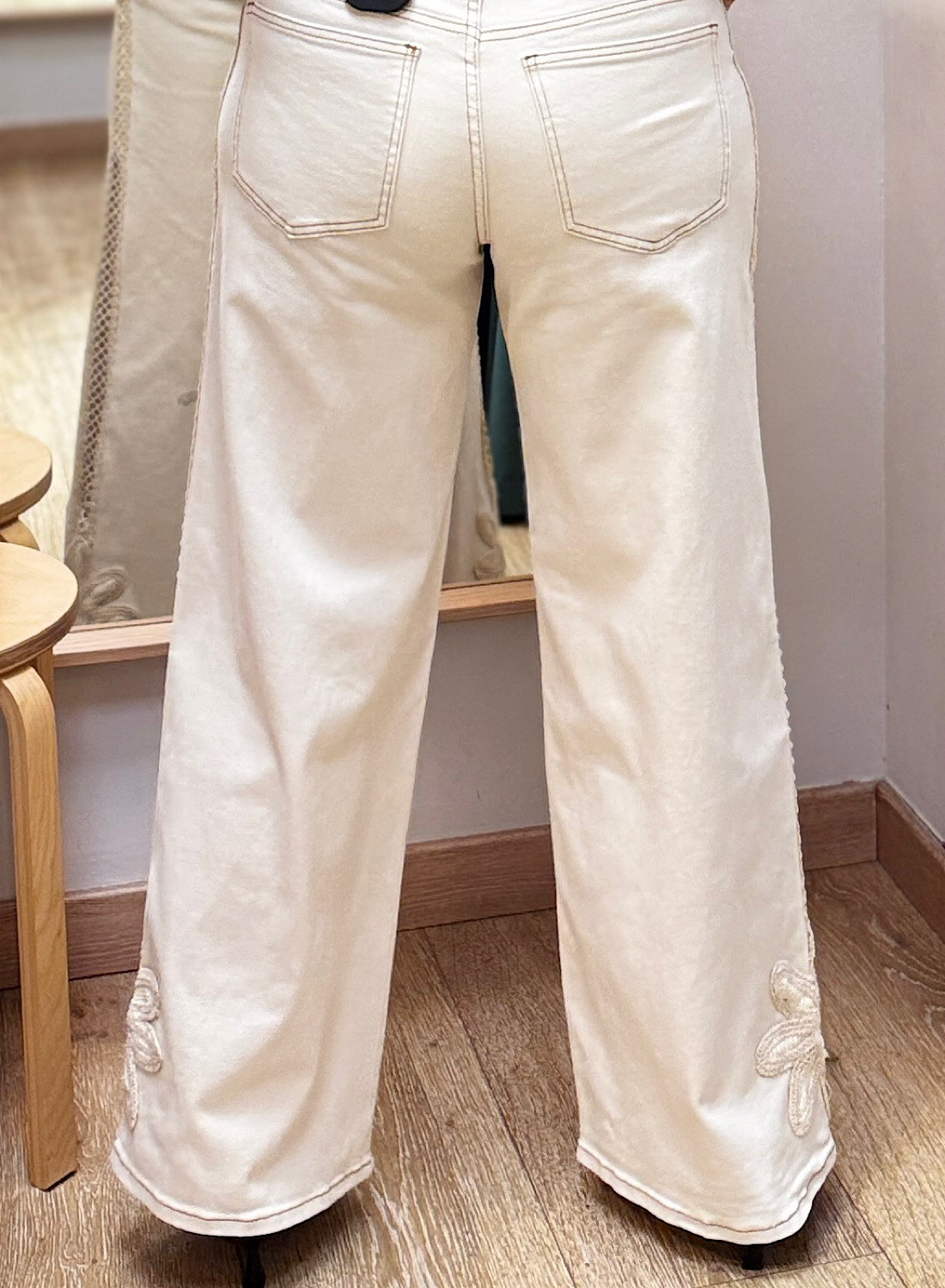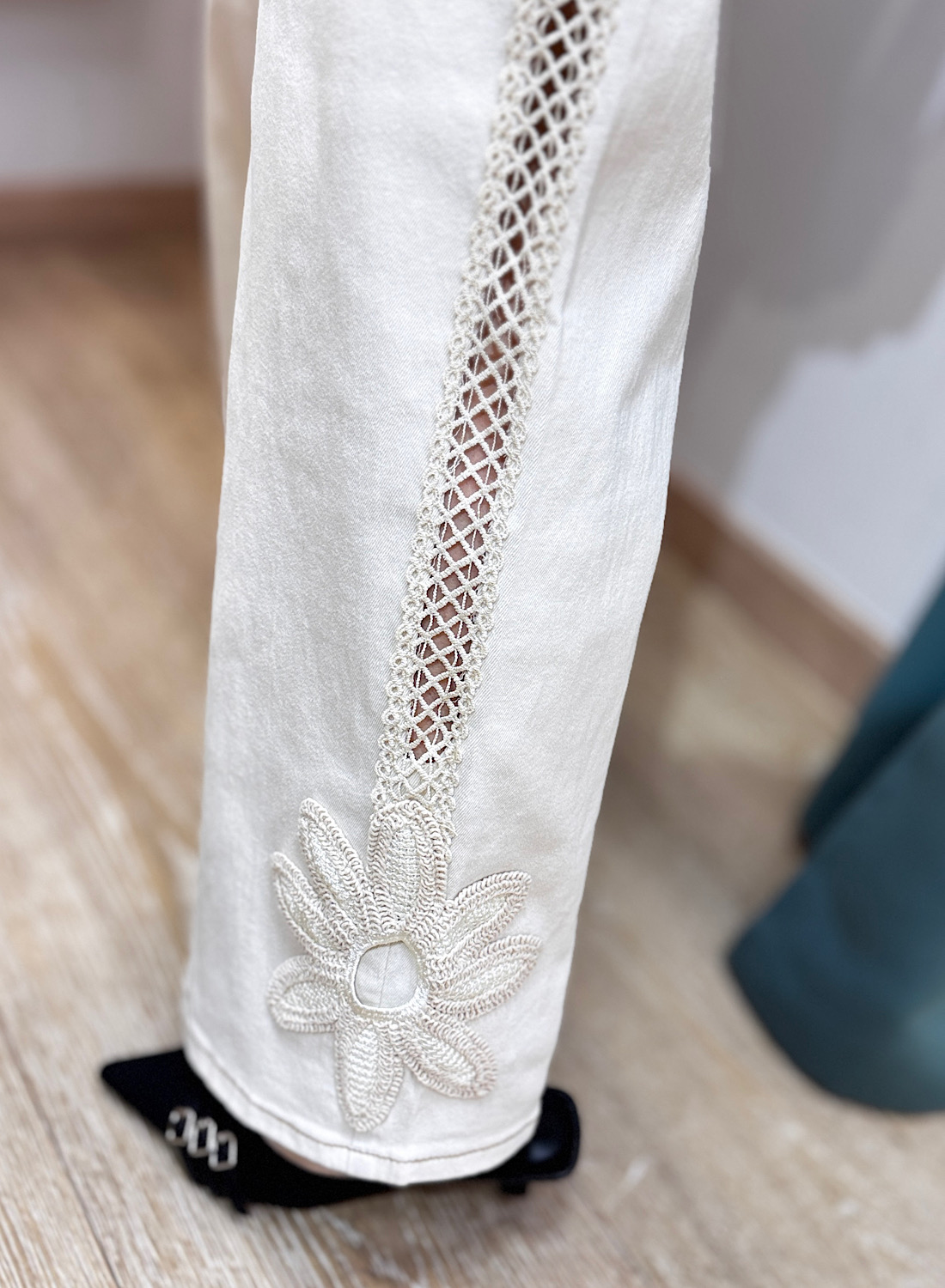 - Bordados florales: En el bajo de cada pernera, un exquisito bordado floral tridimensional complementa las inserciones de ganchillo, realzando la artesanía de la prenda.