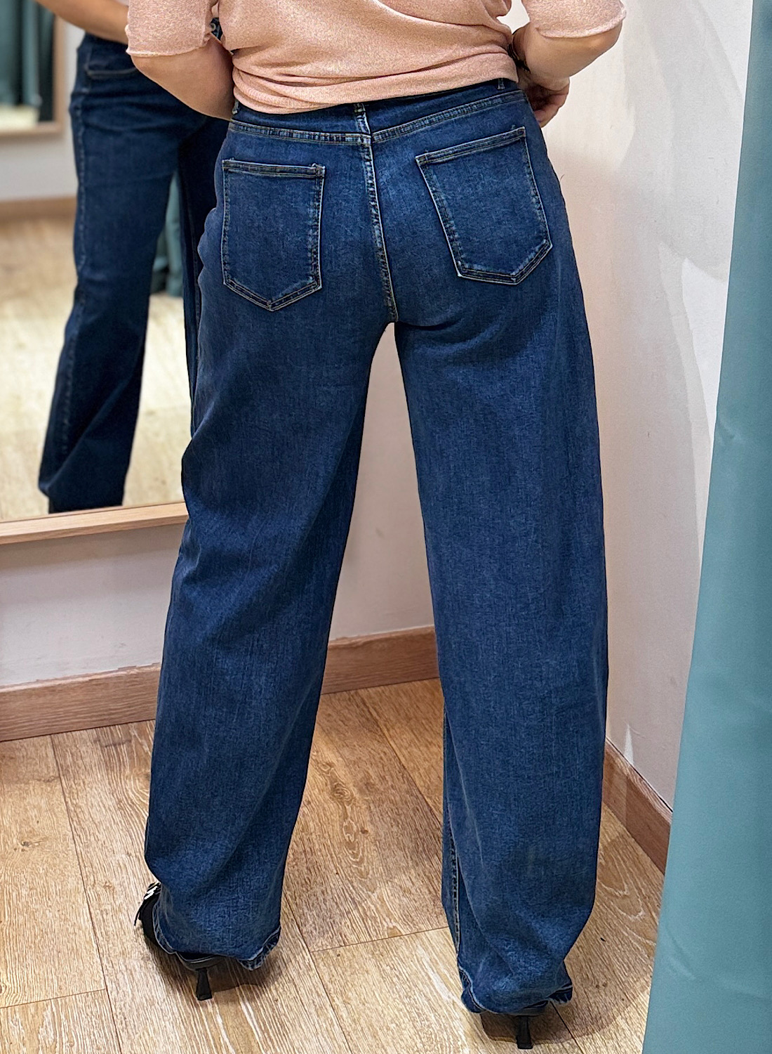 Confeccionado en un duradero denim de tono azul oscuro, el PANTALON LOREN presenta un diseño clásico de cinco bolsillos, cierre de botón y cremallera. Su corte ancho no solo proporciona una libertad de movimiento excepcional, sino que también aporta un toque sofisticado y contemporáneo a tu vestuario. Es una prenda fundamental para construir atuendos con personalidad y confort.