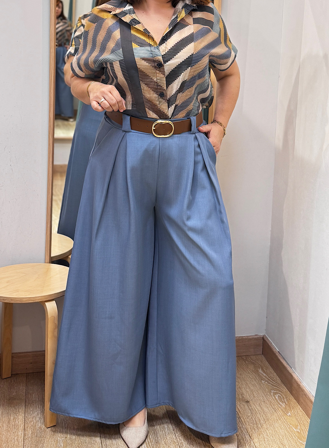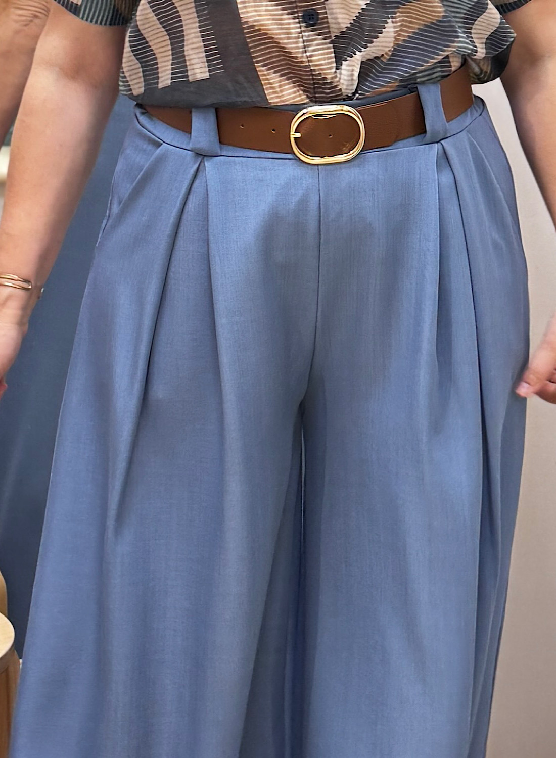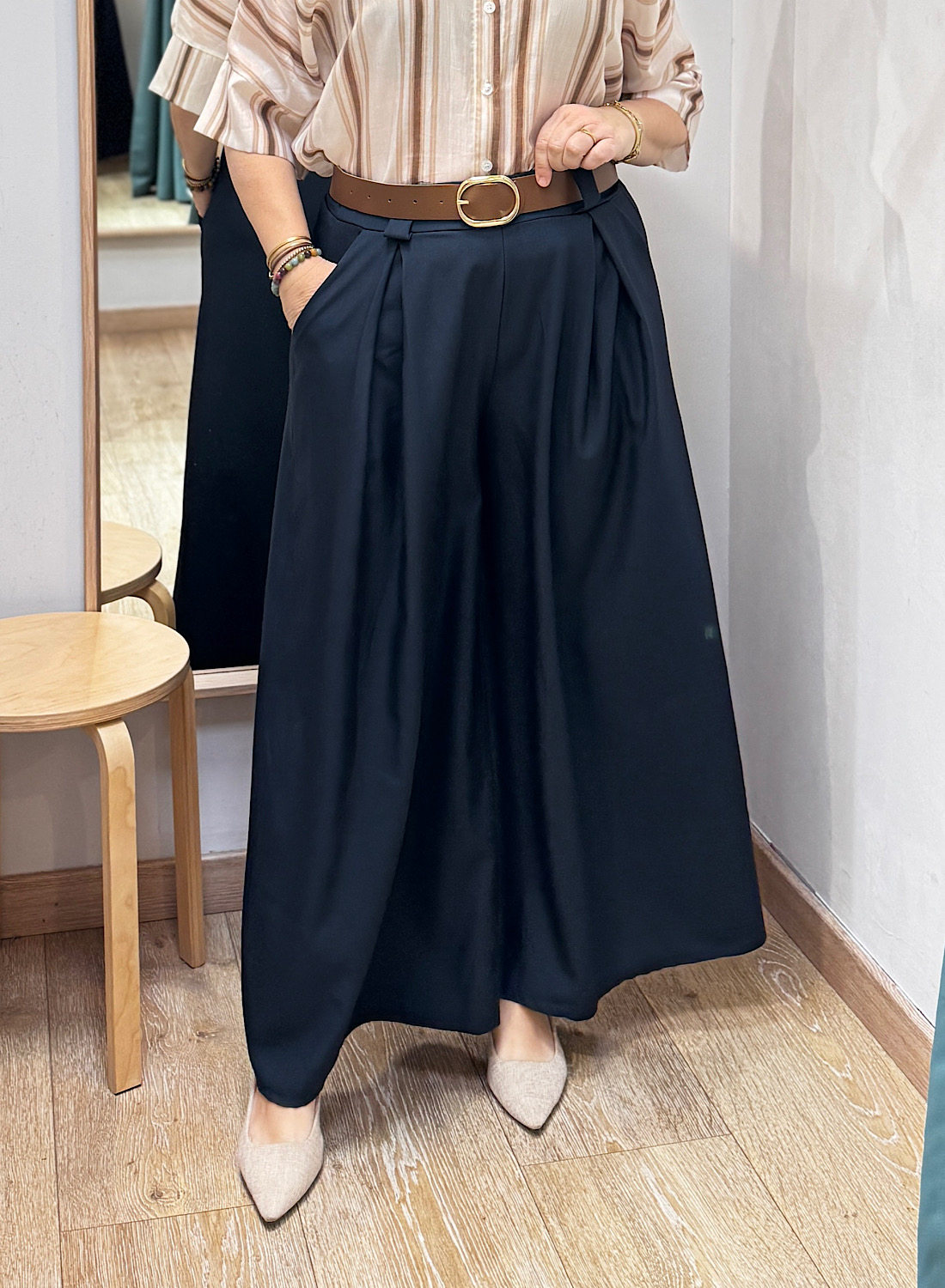 Este pantalón se caracteriza por su corte de pierna ancha y fluido, que aporta un movimiento elegante y una silueta estilizada. Su diseño atemporal facilita la combinación con diversas prendas, desde blusas elegantes hasta tops más relajados. La cintura alta, a menudo realzada con un cinturón, acentúa la figura y alarga visualmente las piernas, ofreciendo un acabado pulcro y moderno.