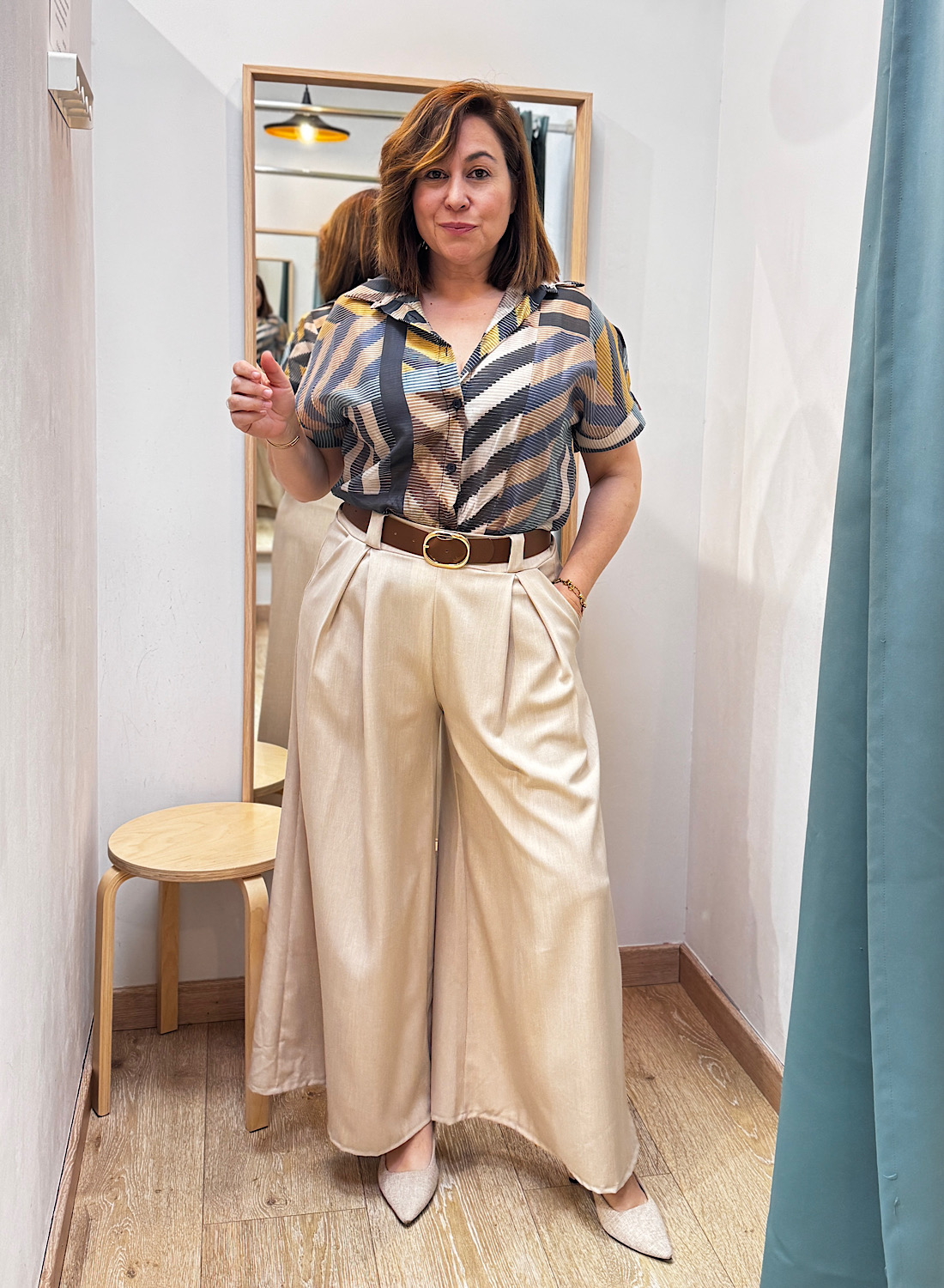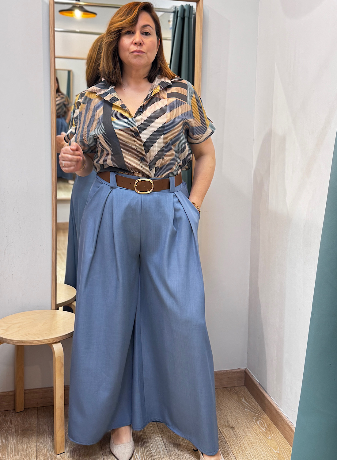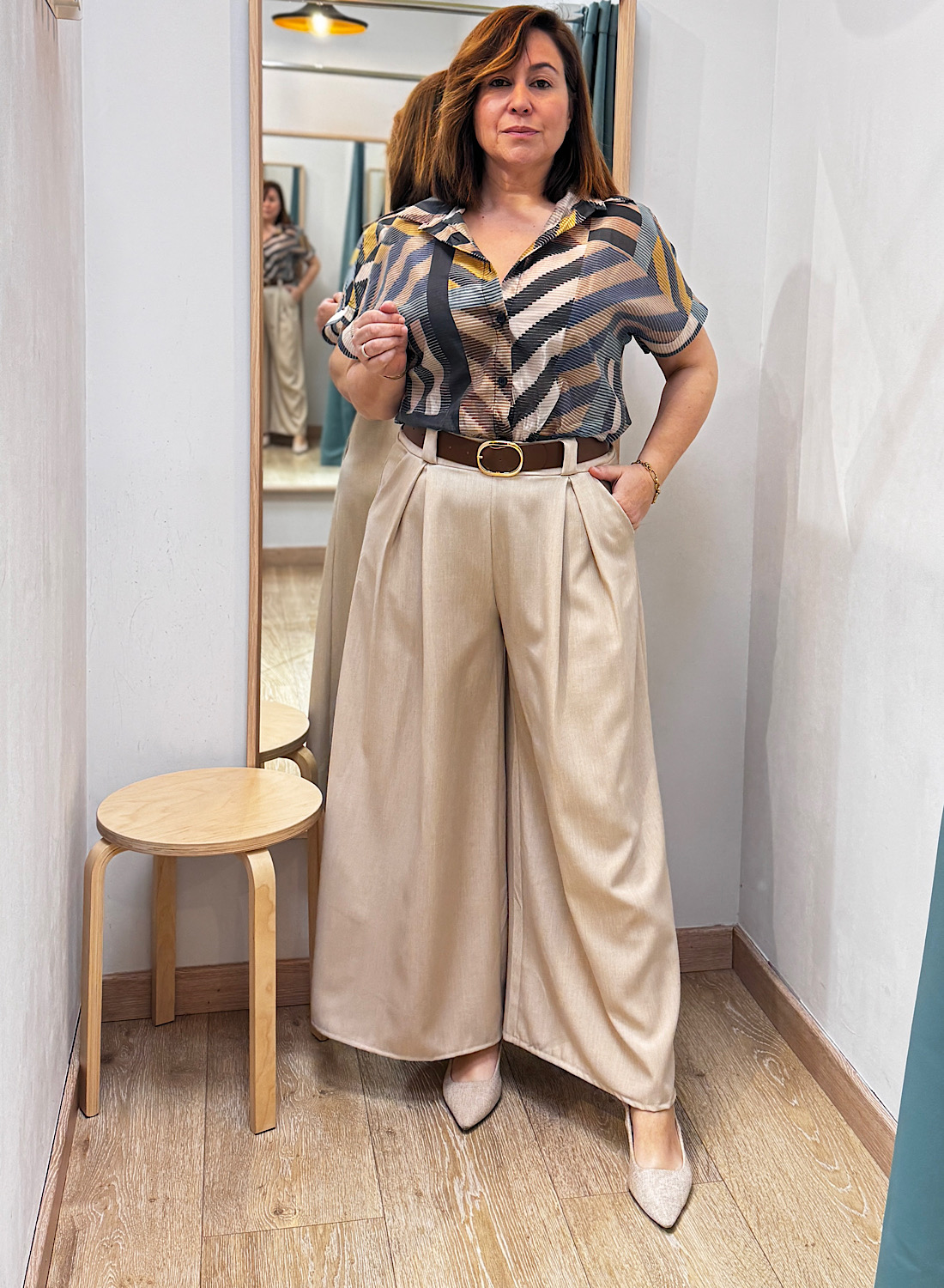 Este pantalón se caracteriza por su corte de pierna ancha y fluido, que aporta un movimiento elegante y una silueta estilizada. Su diseño atemporal facilita la combinación con diversas prendas, desde blusas elegantes hasta tops más relajados. La cintura alta, a menudo realzada con un cinturón, acentúa la figura y alarga visualmente las piernas, ofreciendo un acabado pulcro y moderno.
