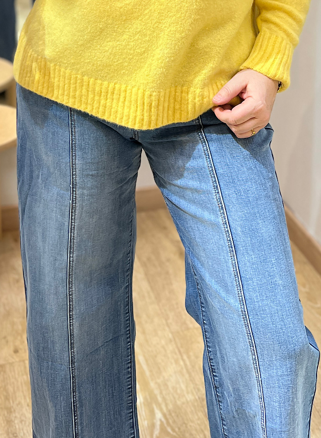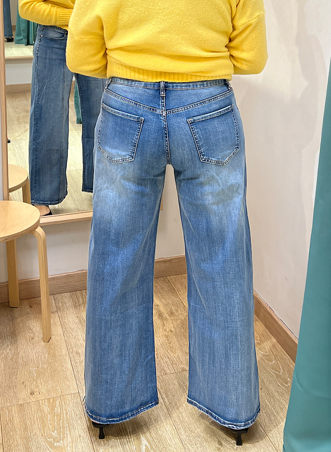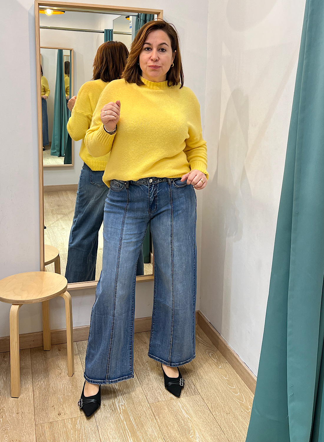 El PANTALON VAQUERO JANE redefine el estilo casual con su innovador diseño de pata ancha y una distintiva costura central a lo largo de cada pernera. Esta característica no solo estiliza la figura, sino que también añade un toque moderno y sofisticado a una prenda clásica. Confeccionado en un tejido vaquero de color azul medio, presenta un lavado que aporta un aspecto desenfadado y versátil.