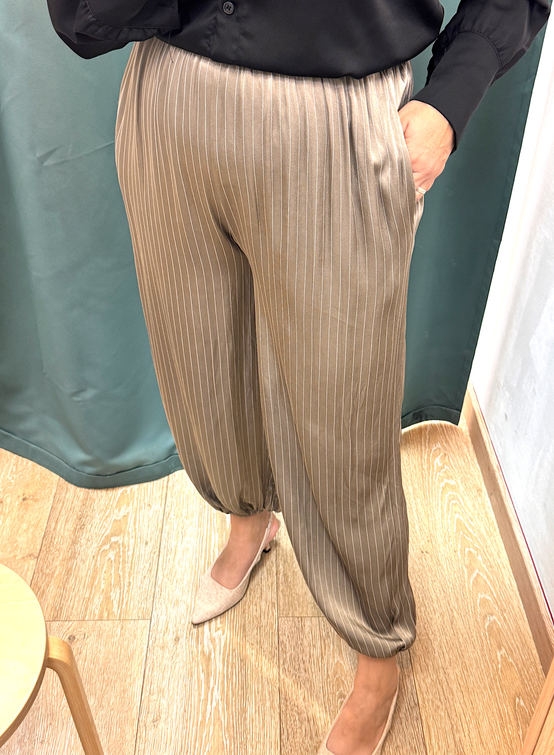 Experimenta la fusión perfecta entre sofisticación y comodidad con el PANTAÓN SATINADO DIPLOMÁTICO. Este exclusivo pantalón está confeccionado en un tejido satinado de alta calidad que proporciona un brillo sutil y una caída impecable, ideal para realzar tu figura. Su diseño presenta un clásico estampado de raya diplomática vertical, que no solo aporta un toque de elegancia atemporal, sino que también crea un efecto visual que estiliza. Con un corte relajado que asegura libertad de movimiento y un ajuste ligeramente cónico en el tobillo, este pantalón es la elección ideal para transitar entre un look casual chic y un conjunto más formal. Su versátil tono gris topo o verde oliva claro permite múltiples combinaciones, convirtiéndolo en un fondo de armario indispensable para cualquier ocasión.