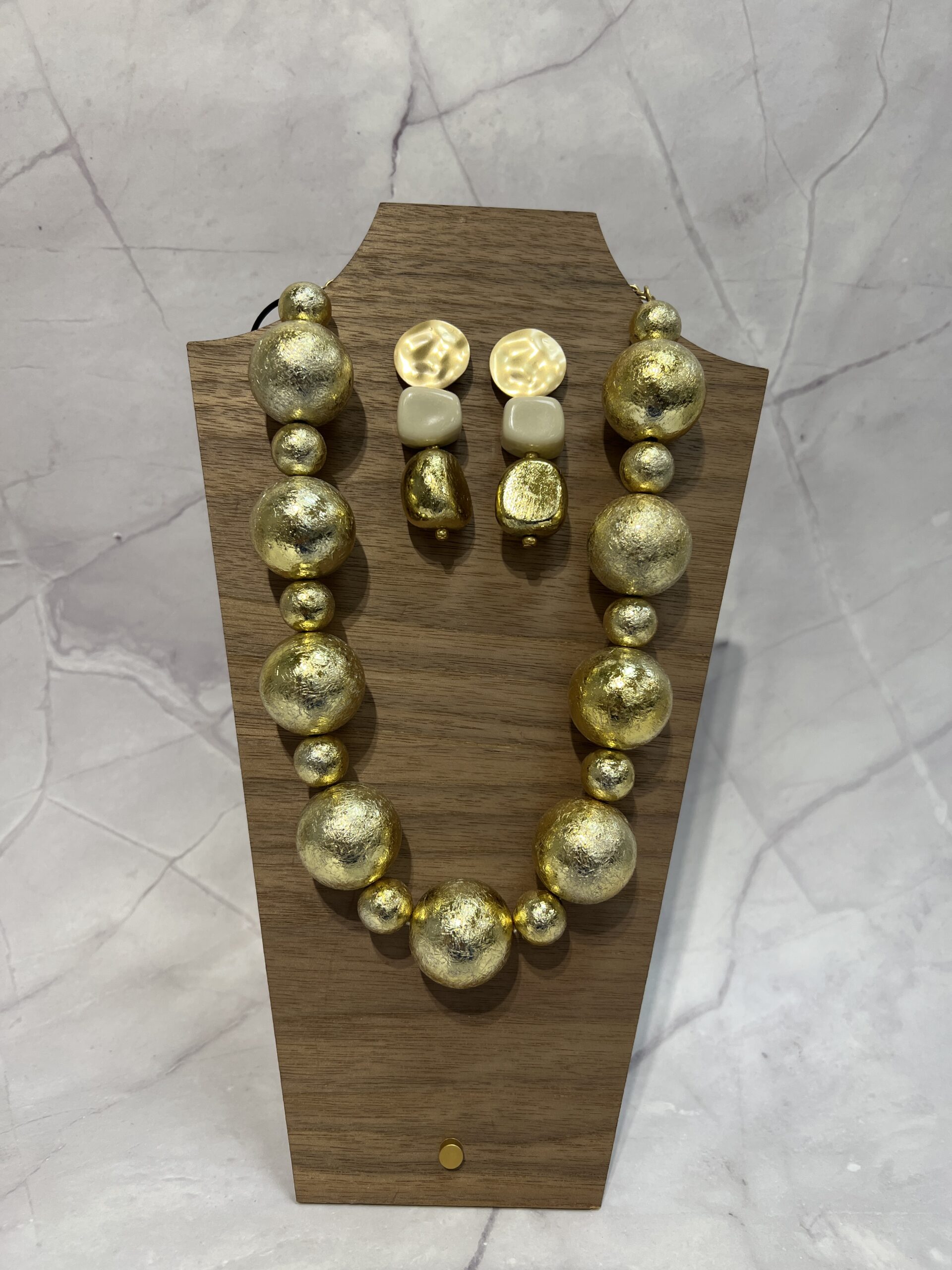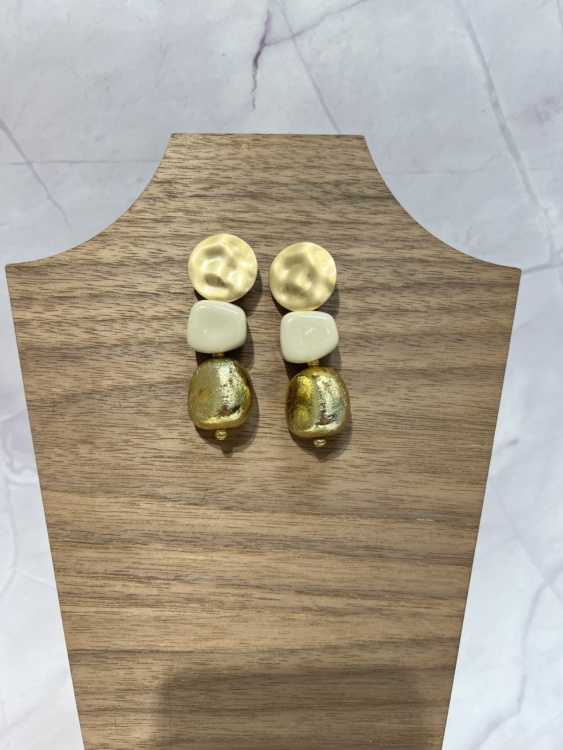 - Elemento inferior: Una cuenta o abalorio dorado de gran tamaño, con una textura rugosa y acabado imperfecto, que evoca la estética de pepitas de oro o elementos naturales, enfatizando el carácter bohemio.