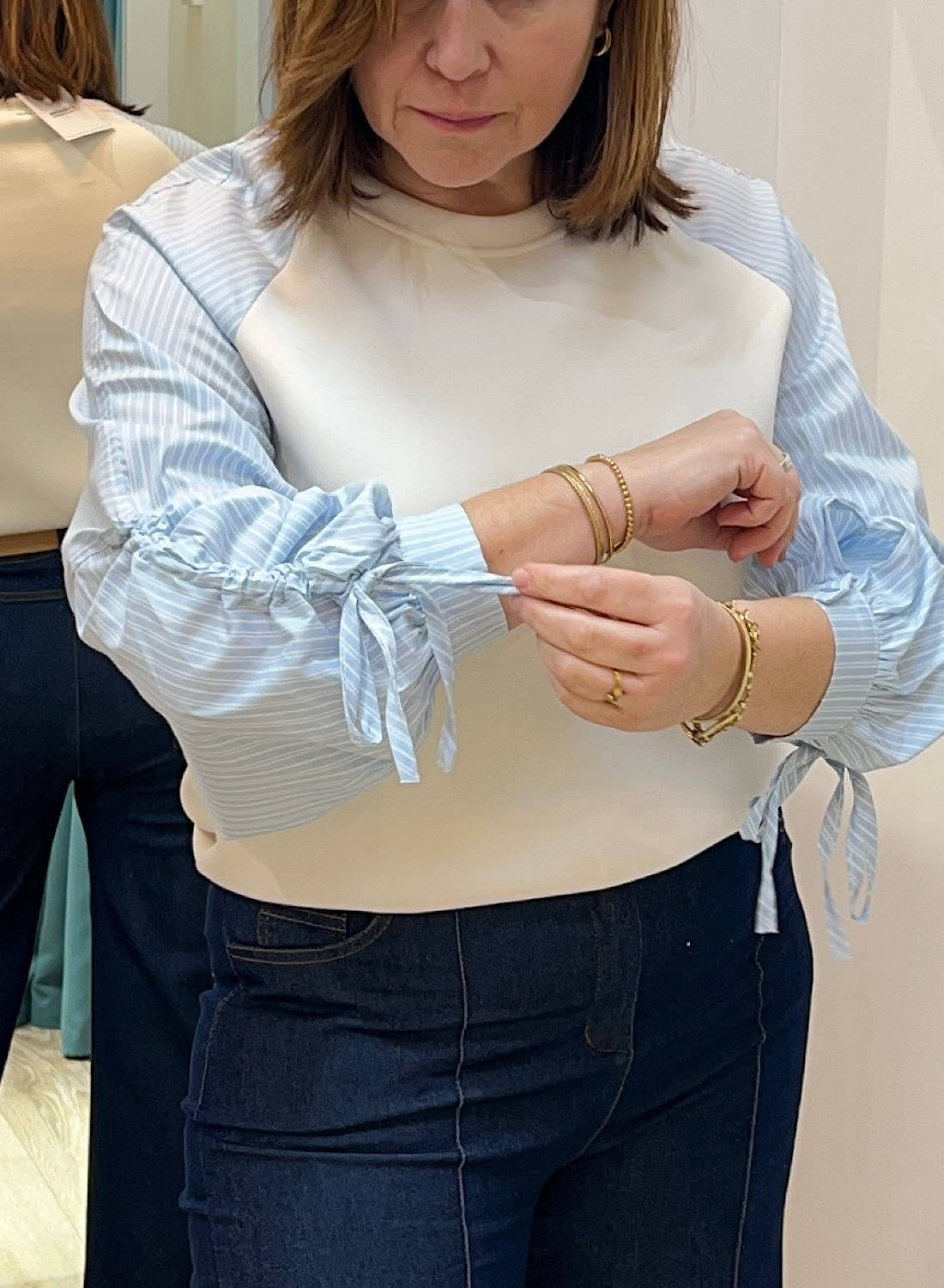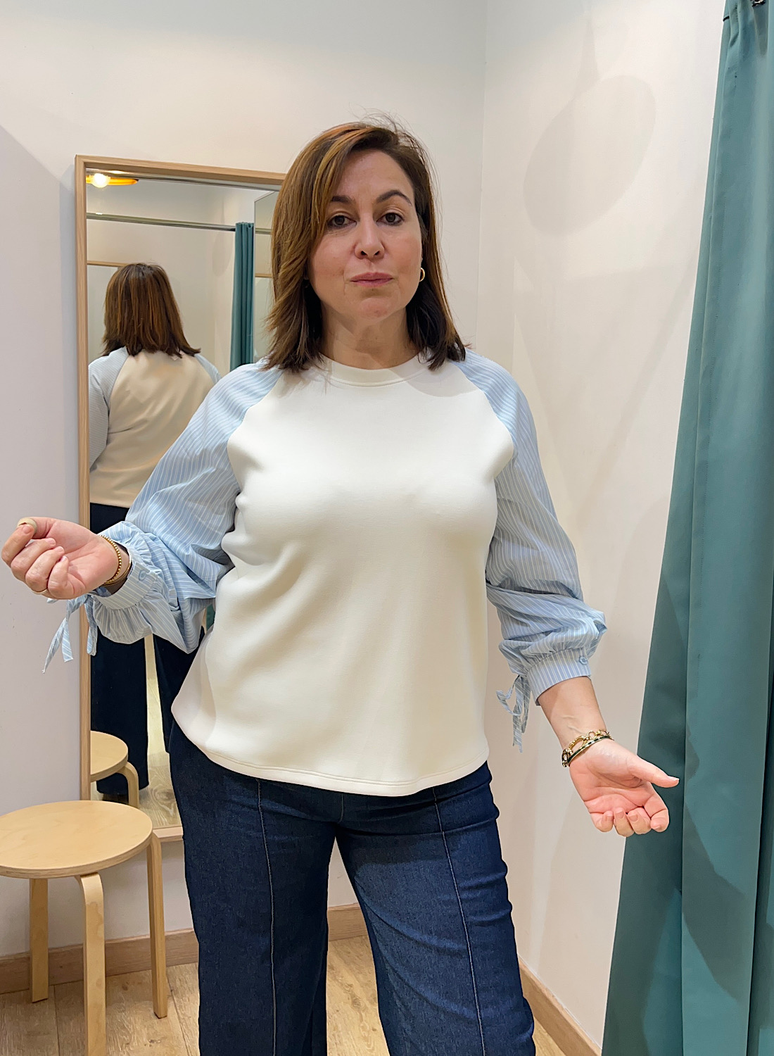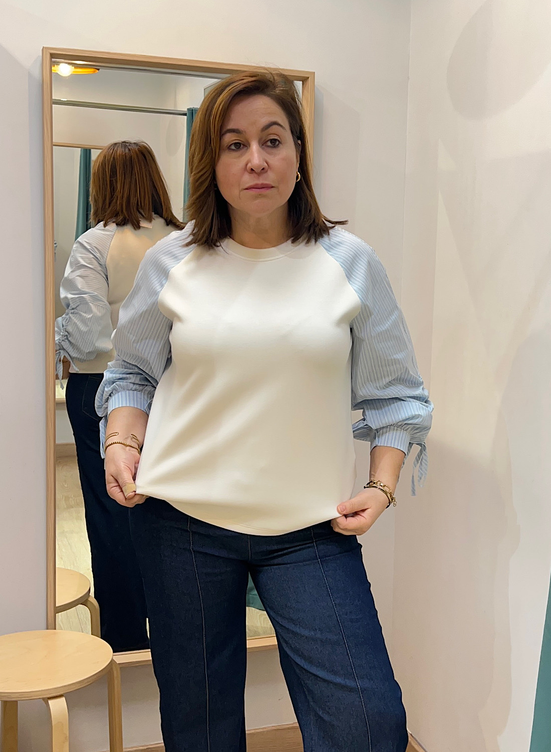 - Mangas raglán a rayas azules y blancas con detalles fruncidos.